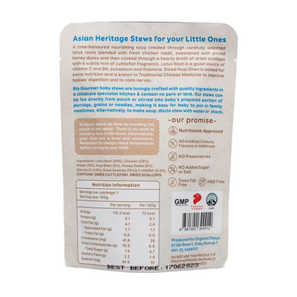 A time-honored nourishing stew created through carefully selected lotus roots blended with fresh chicken meat, sweetened with pitted honey dates and then cooked through a hearty broth of dried scallops with a subtle hint of cuttlefish fragrance. Lotus Root is a good source of vitamin C and B6, potassium and thiamine. Diced Huai Shan is added for extra nutrition and is known in Traditional Chinese medicine to improve babies' digestion and to calm nerves.