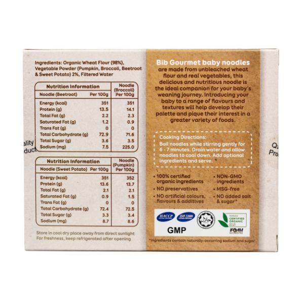 Deliciously Bib baby noodles are made from unbleached wheat flour and real vegetables. This delicious and nutritious noodles is the ideal companion for your baby's weaning journey. Introducing your baby to a range of flavours and textures will help develop their palette and pique their interest in a greater variety of foods.