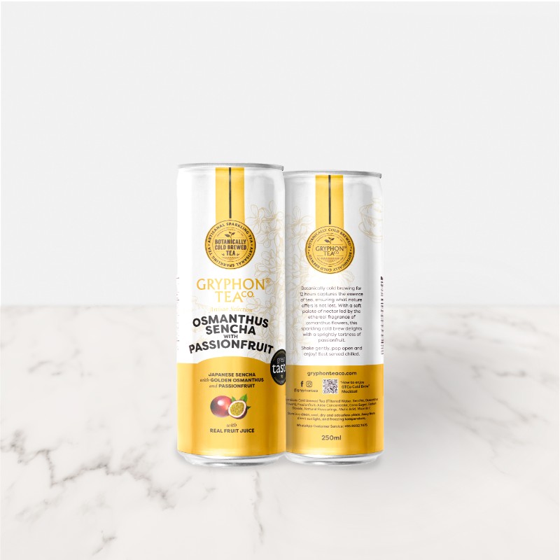 A delightful upgrade of Gryphon Tea's Artisan Osmanthus Sencha, botanically cold-brewed for no less than 12 hours to capture the essence of the gentle floral notes. Blended with passionfruit juice and natural cane sugar for that delectably sweet and fruity aroma. With a touch of light carbonation, the second sip of this drink brings out a round creaminess that dances on your palate and delights with sprightly tartness.
