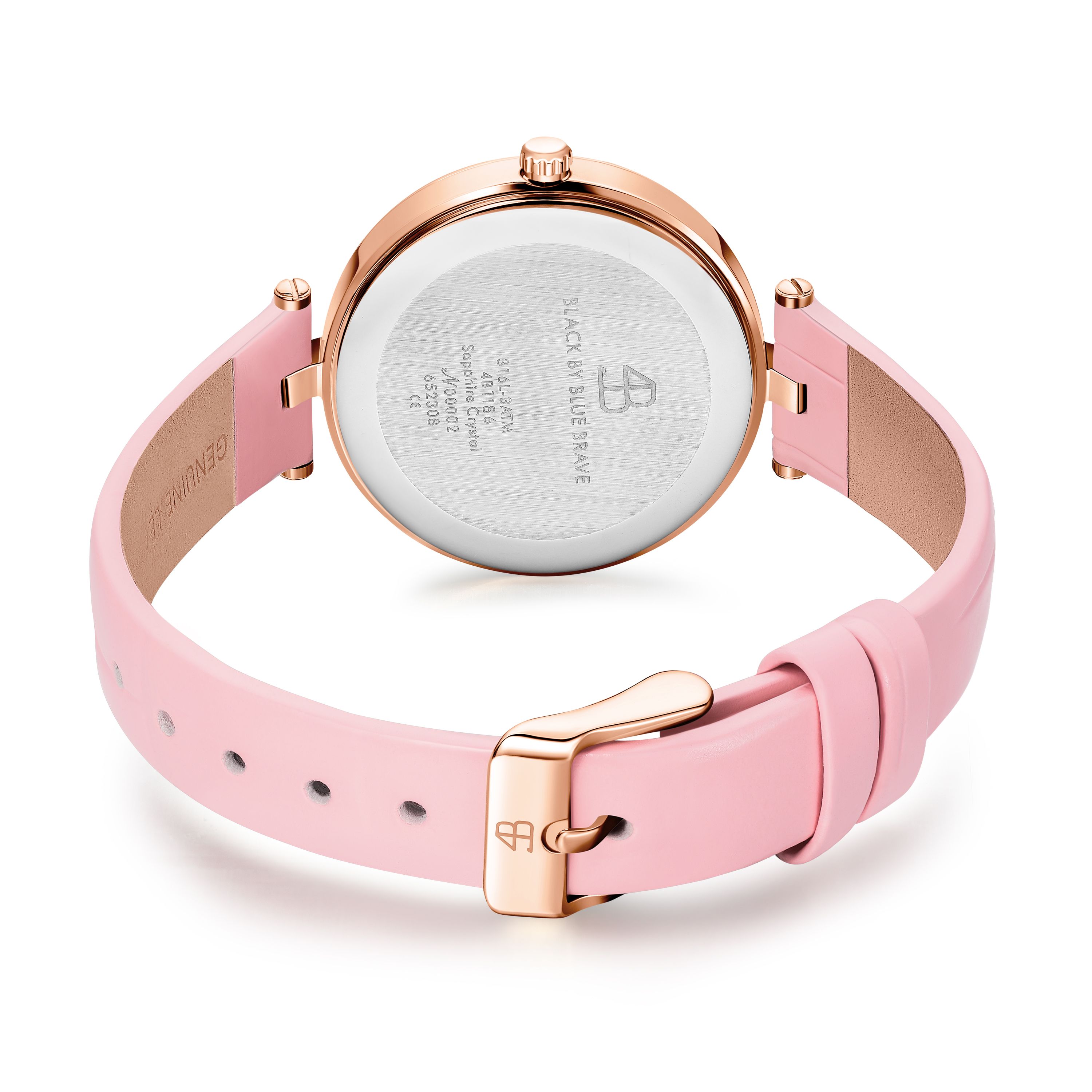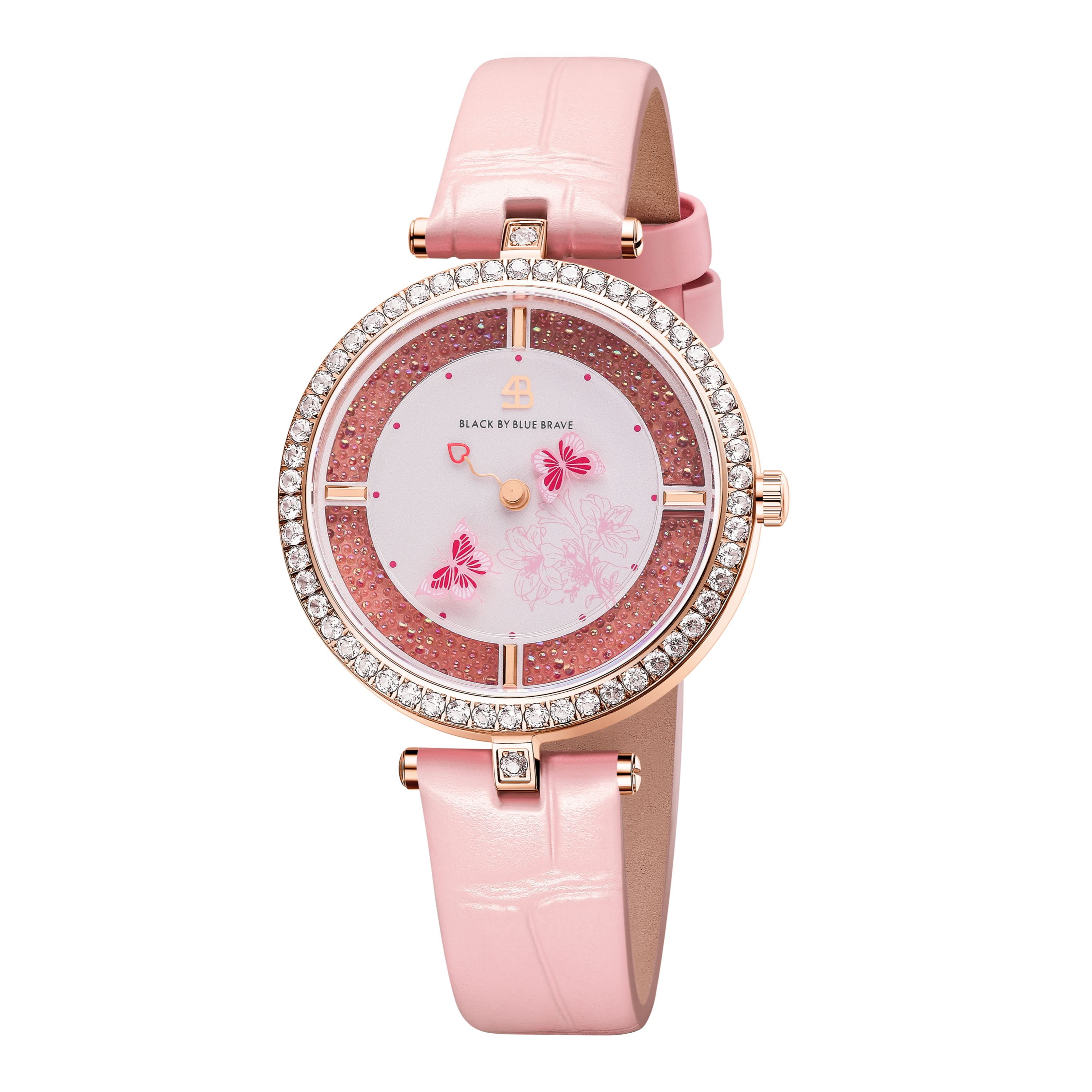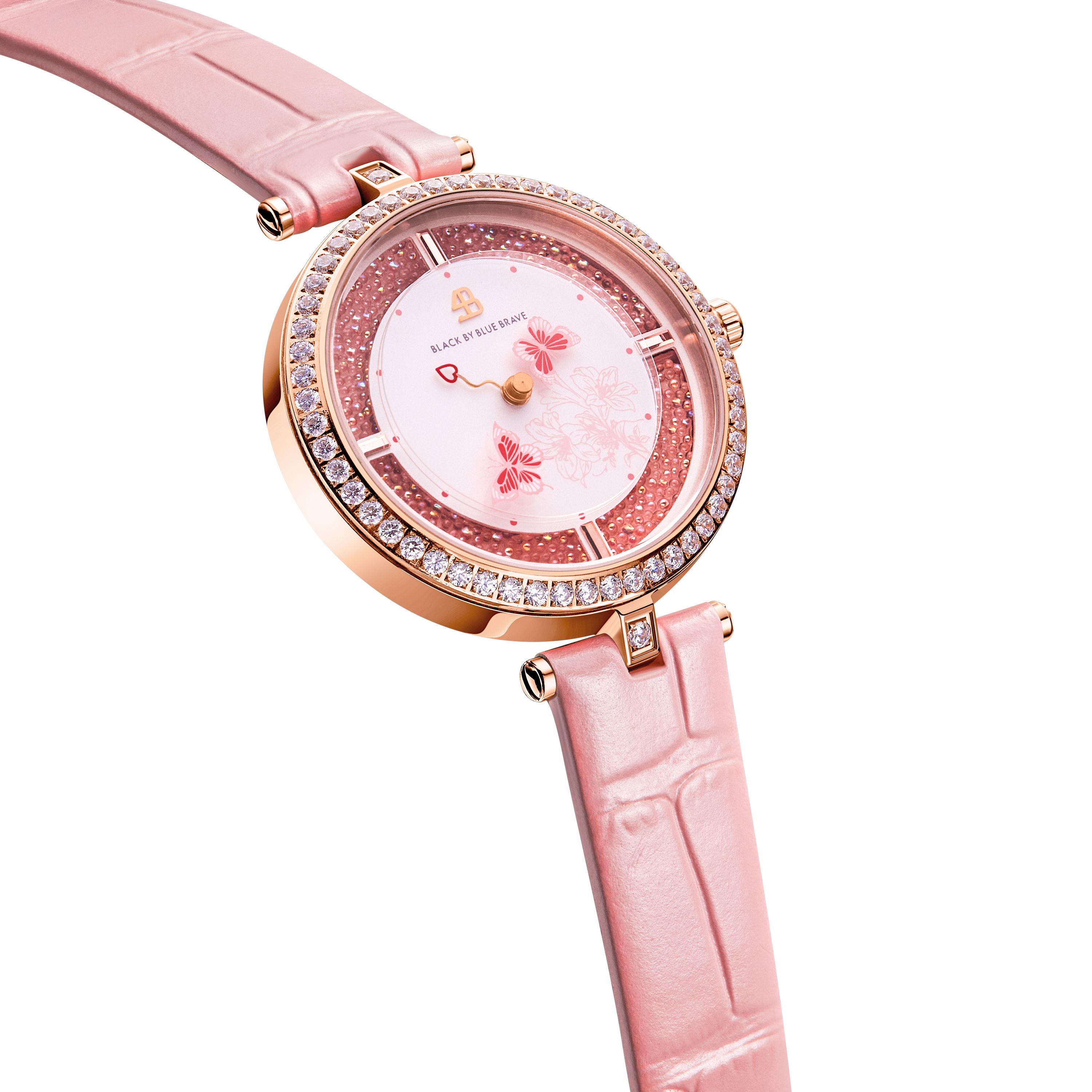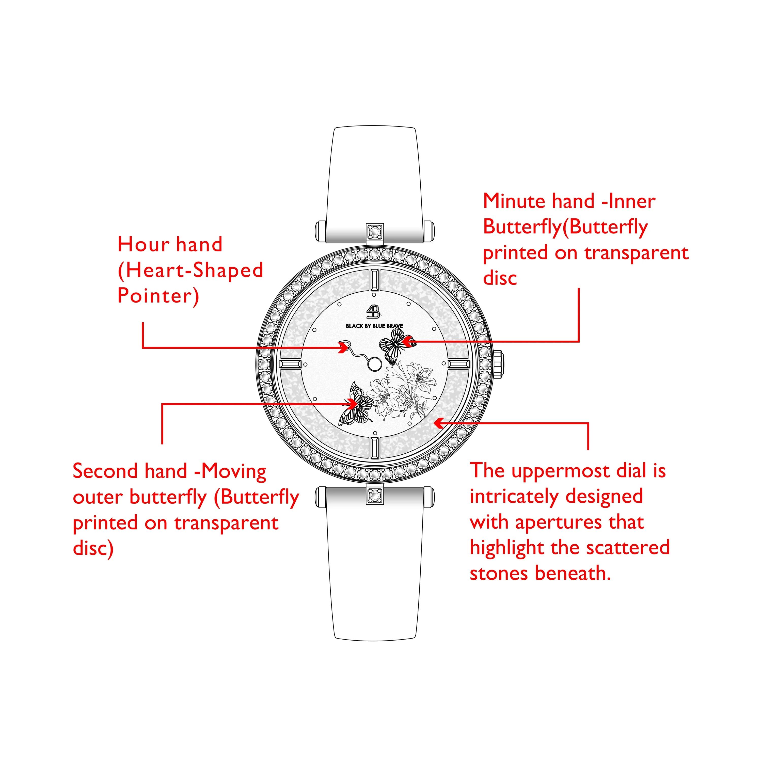 Blending classic and contemporary fashion elements, the lovely pair of butterflies fly across the face of time as the minute and second hands while the beautiful butterfly motifs on the dial and the heart-shaped hour hand symbolises the lovers’ eternal love.