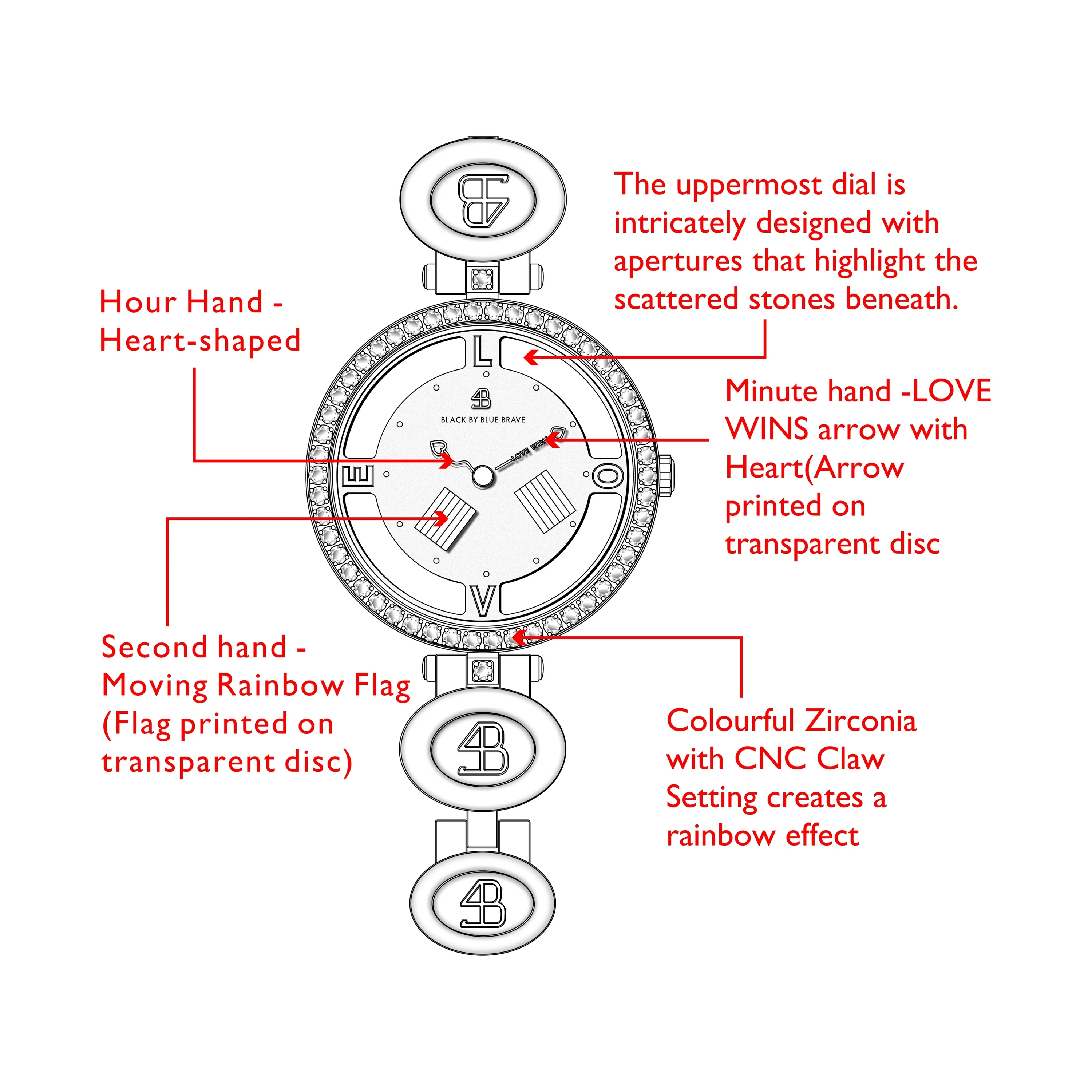 Inspired by love, individuality, diversity, and inclusivity, the Love Wins 2024 series draws its inspiration from the vibrant colours of the rainbow as reflected in the second hand and on the dial. The minute hand features the intricate “Love Wins’ design beautifully. Love is universal, and the Love Wins 2024 series reflects this by embracing the spirit of giving love and also loving oneself.