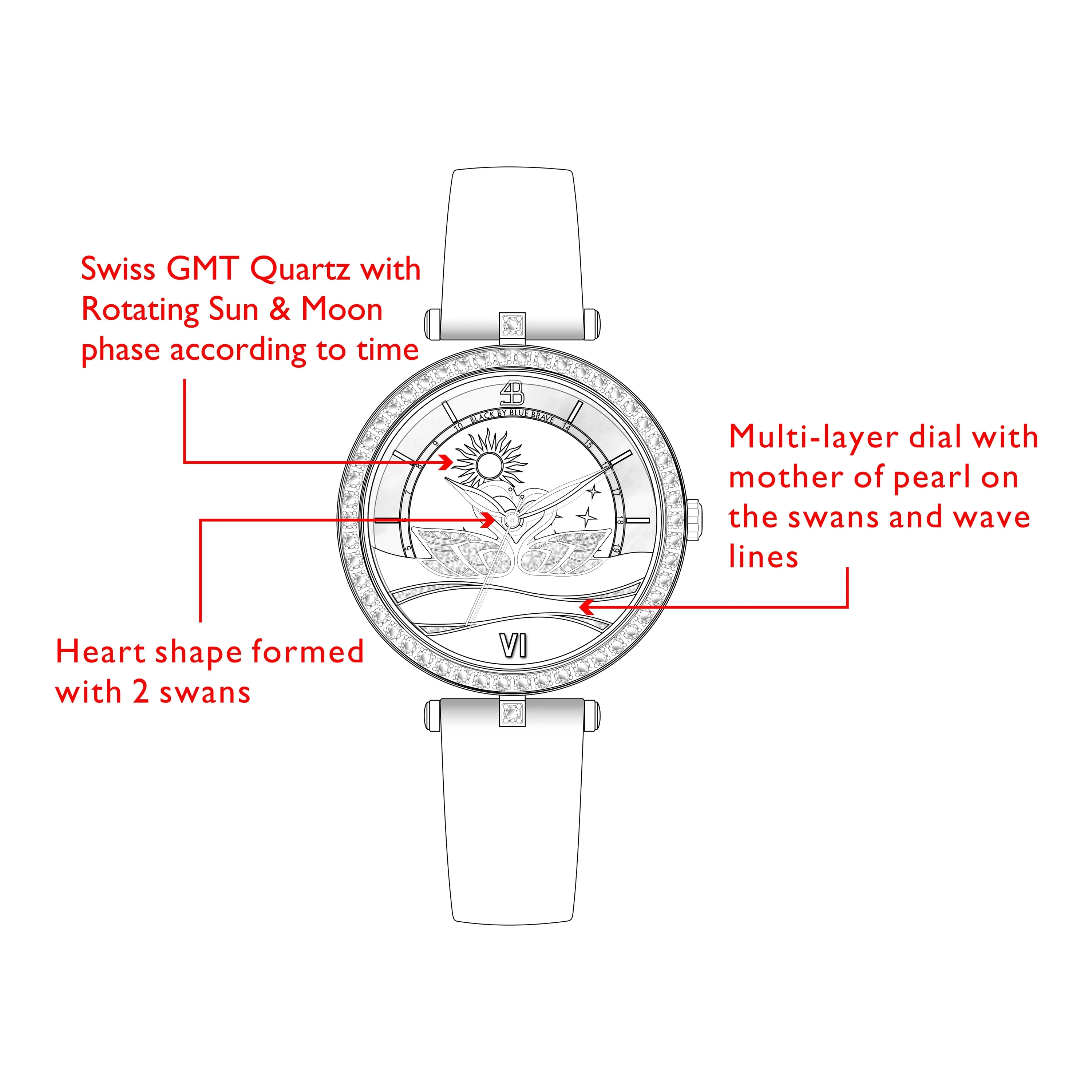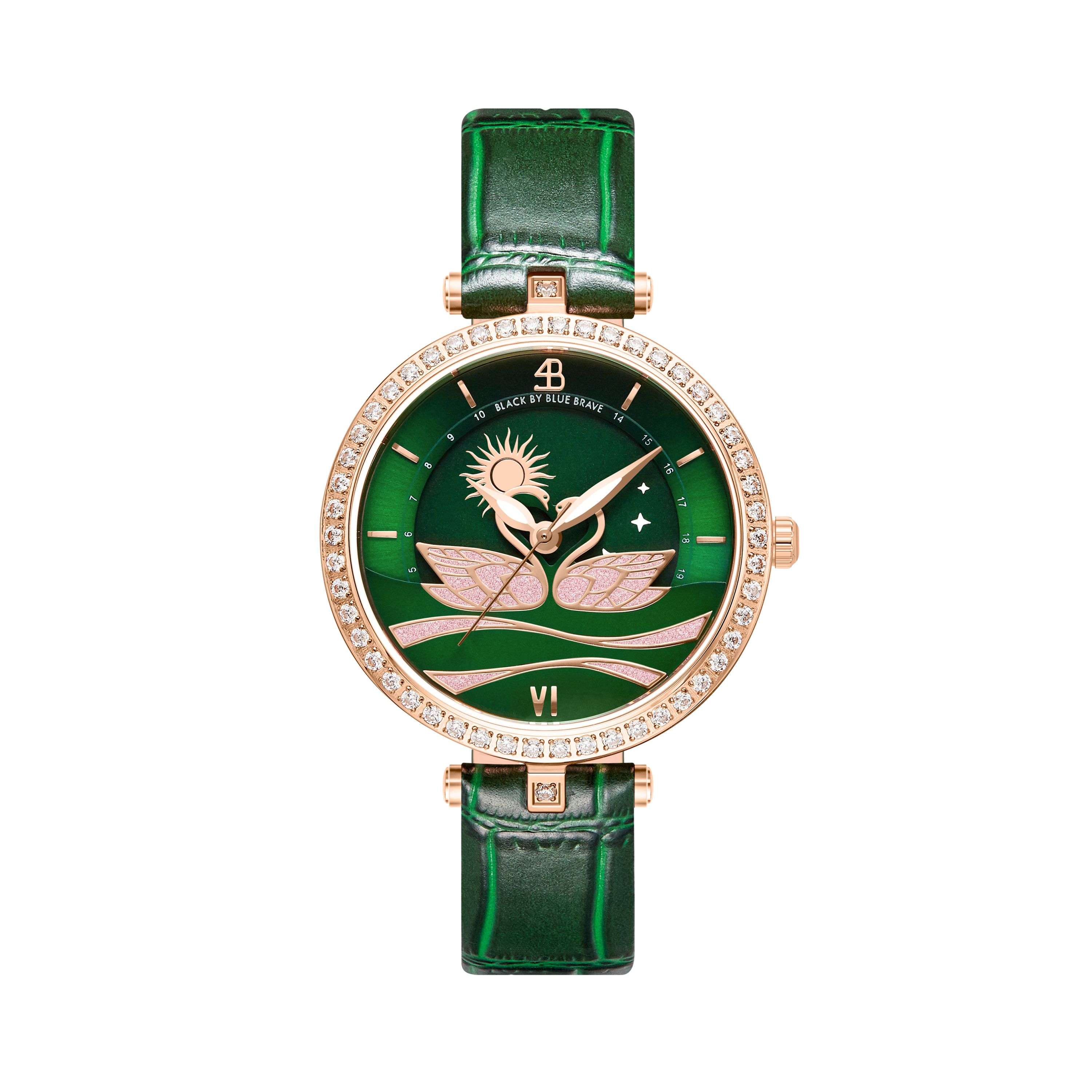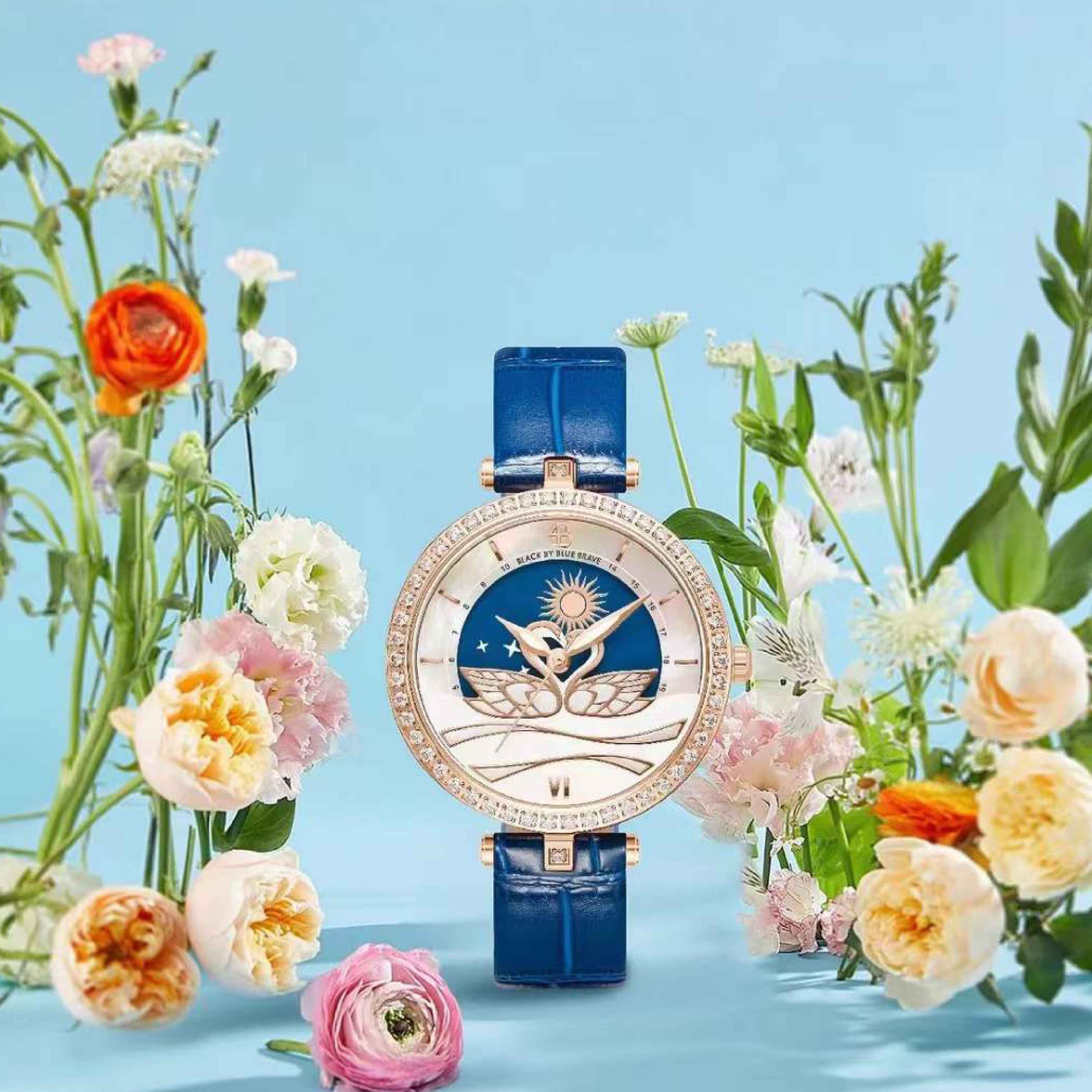 The majestic swans, known for their long necks and distinctive curved beaks, are being featured in this timepiece as they elegantly entwine their long necks to form a heart shape on the dial, representing a universal symbol of love and purity.