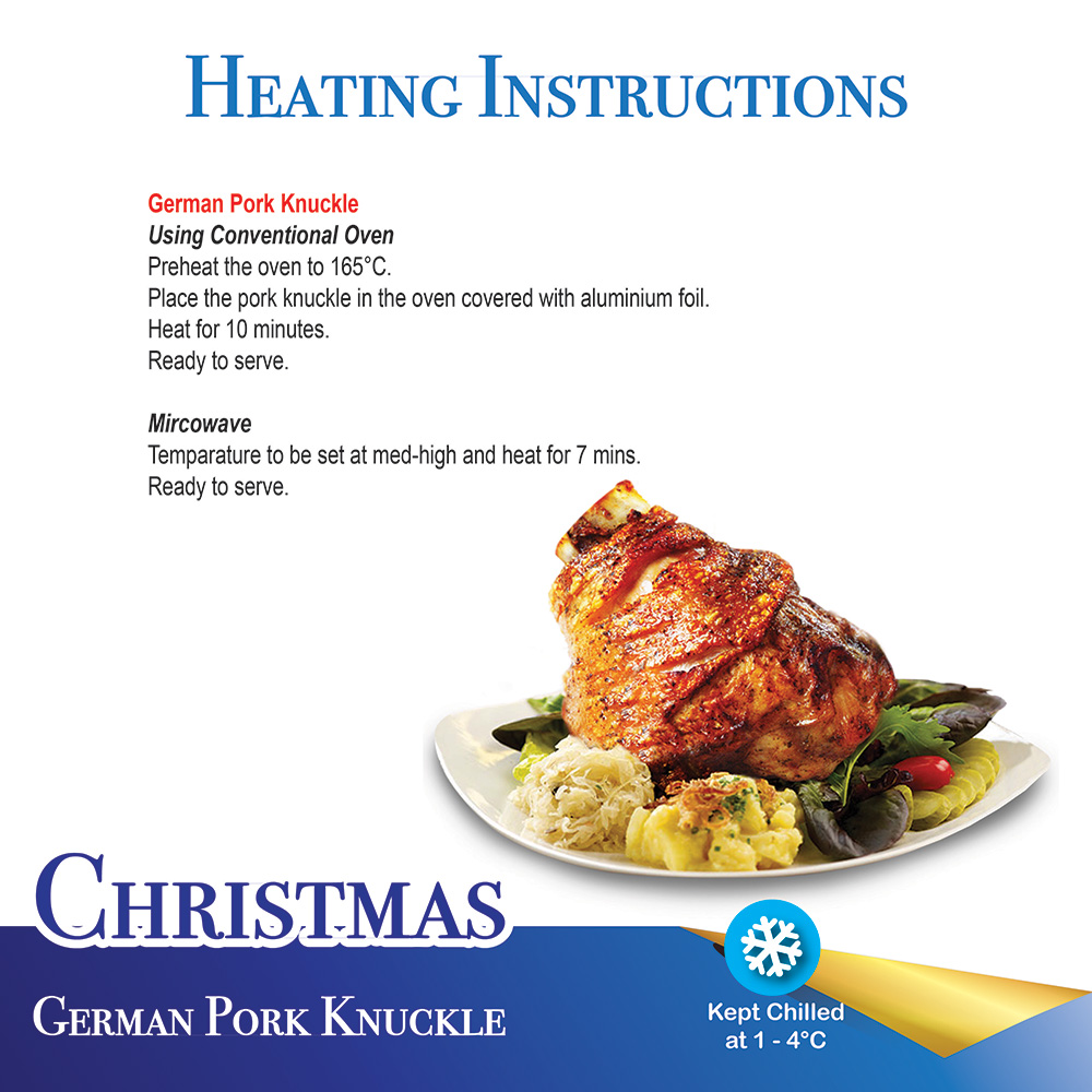 1. Conventional Oven: Preheat oven to 165°C. Place the pork knuckle in the oven covered with aluminium foil. Heat for 10 mins. Ready to serve.