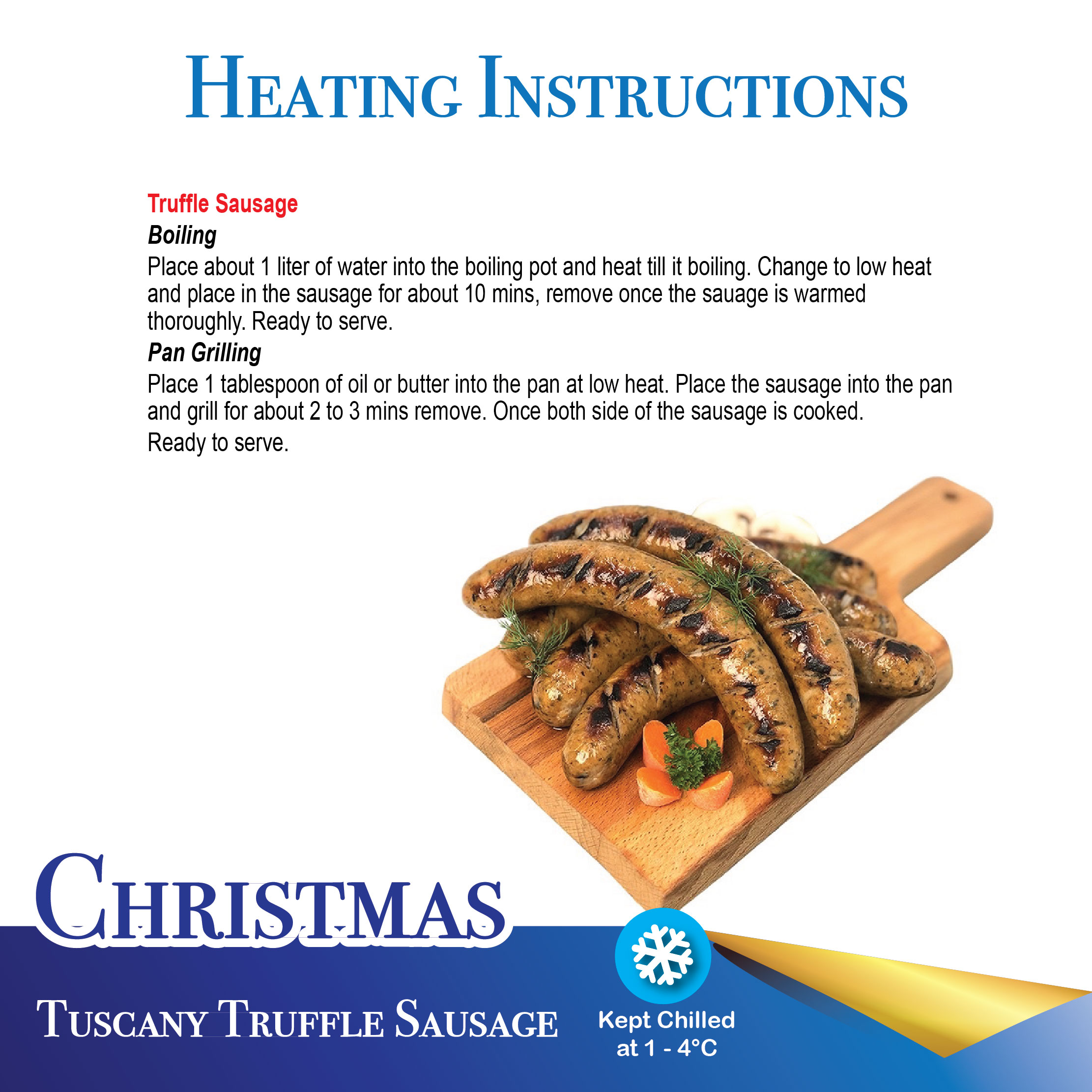 2. Pan Grilling: Place 1 tablespoon of oil or butter into the pan at low heat. Place the sausage into the pan and grill for about 2-3 mins and remove once both side of the sausage is cooked. Ready to serve.