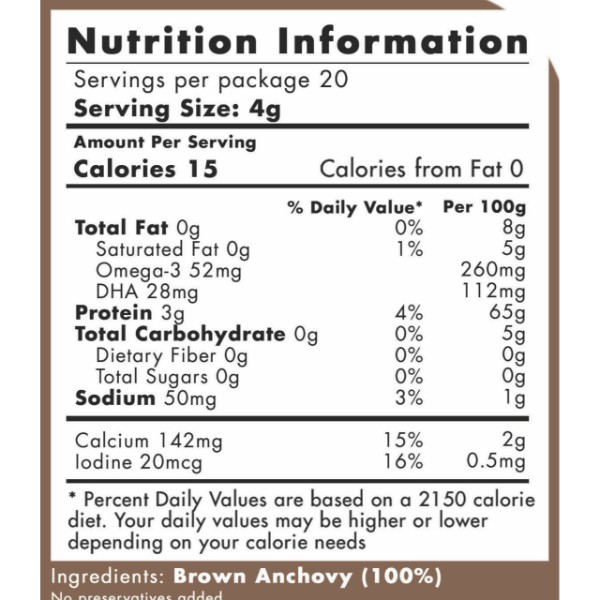 Compared to White Anchovy Powder, Brown Anchovy Powder has higher Calcium and Protein content which are important for bone development.