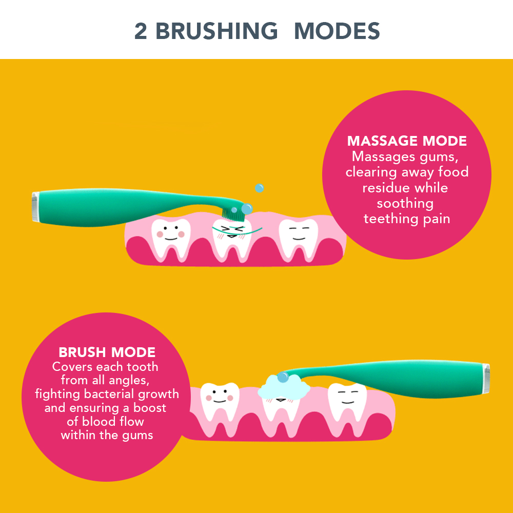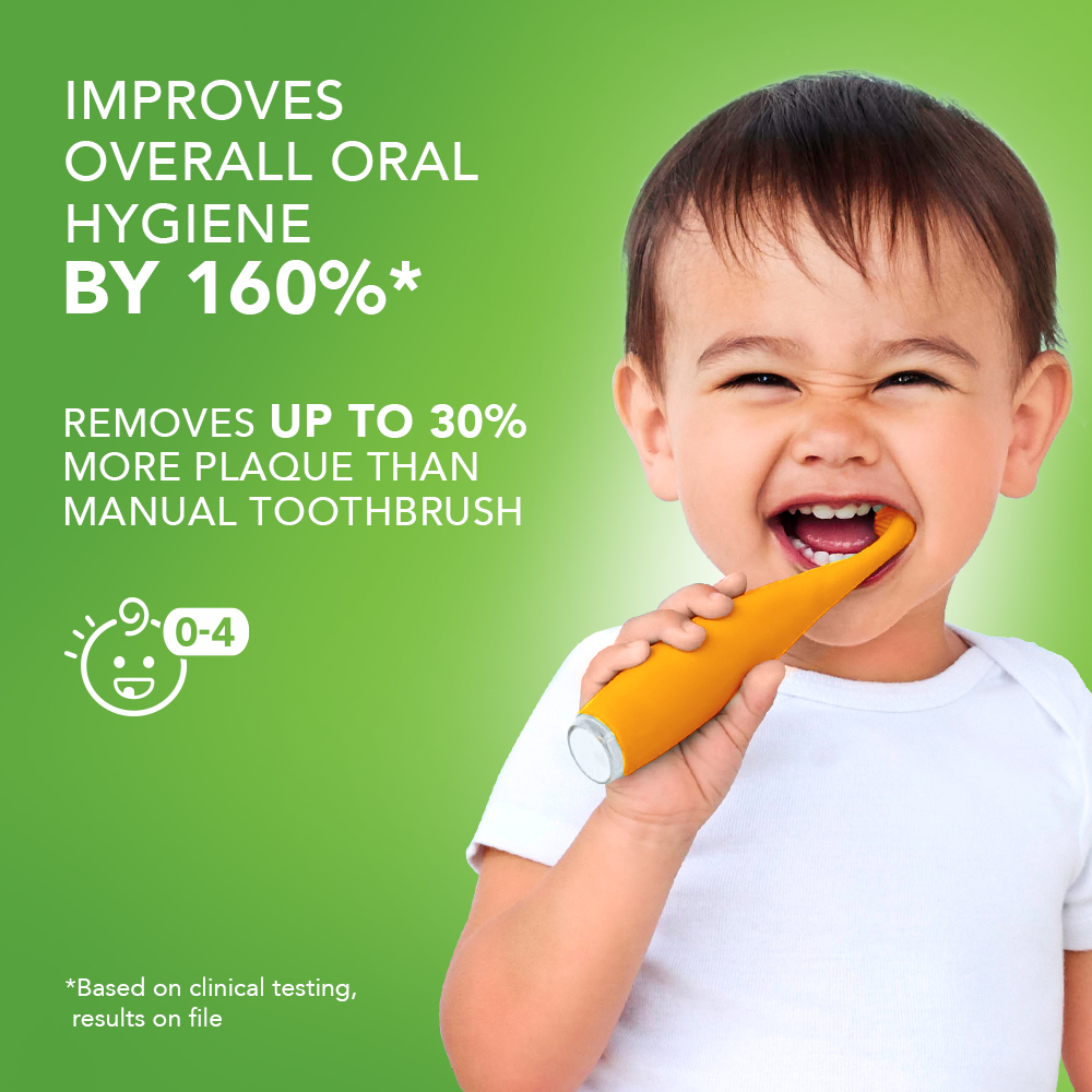 • Sonic pulsations and soft silicone bristles gently brush primary teeth