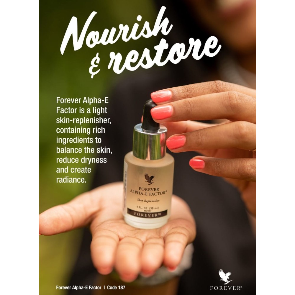 Forever Alpha-E Factor is a light, emollient fluid formulated to provide an antioxidant treatment for your face, neck, or just anywhere on the body to help fight free radical damage as well as to help condition and nourish the skin to maintain its suppleness and smoothness.