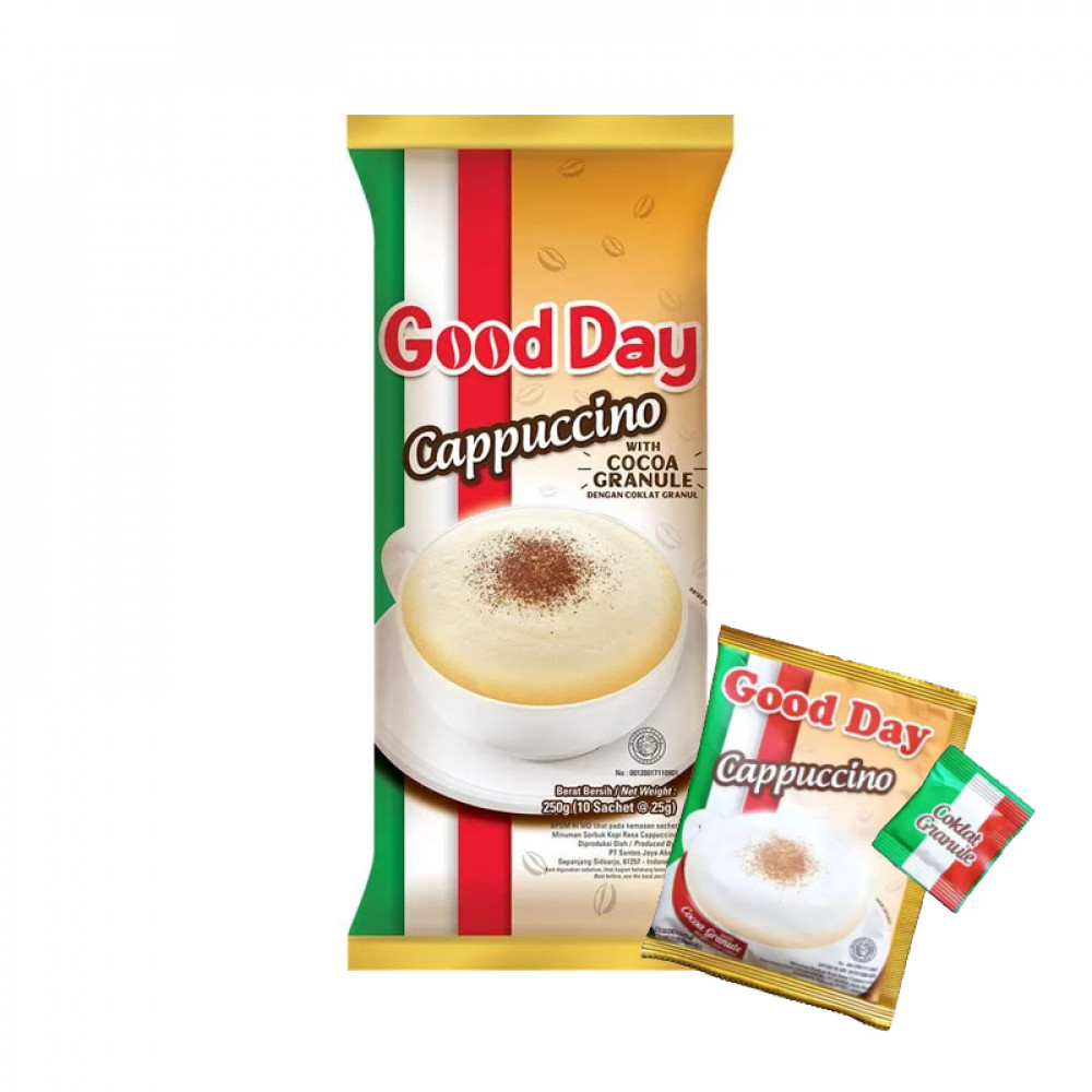 Good Day Cappuccino is an instant coffee beverage with coffee, sugar, and creamer all in one sachet. Enhanced with special chocolate granules, it's perfect for your moments of relaxation. The combination of coffee, creamer, and cappuccino creates a delicious cup of coffee, and the addition of tasty chocolate granules further elevates the coffee lover's experience.