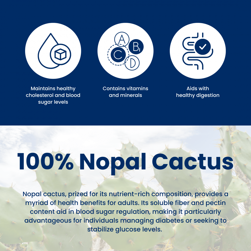 Formulated for adults seeking to maintain healthy glucose and cholesterol levels, Dia-Med Nopal Cactus also aids weight management by supporting digestion and enhancing feelings of fullness. Its antioxidant properties help protect the body from oxidative stress and inflammation, contributing to overall vitality.
