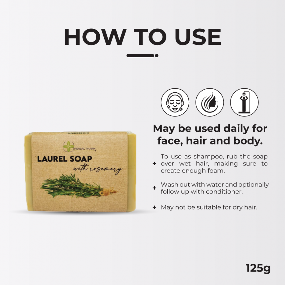 Gentle yet powerful, Herbal Pharm Laurel Soap with Rosemary is a 100% vegan, all-natural bar soap designed to care for your skin, scalp, and hair in one simple step. Infused with olive oil, laurel oil, and rosemary essential oil, this multipurpose soap deeply cleanses while soothing sensitive skin and promoting scalp health. Enjoy the invigorating natural scent that uplifts your mood every time you shower.