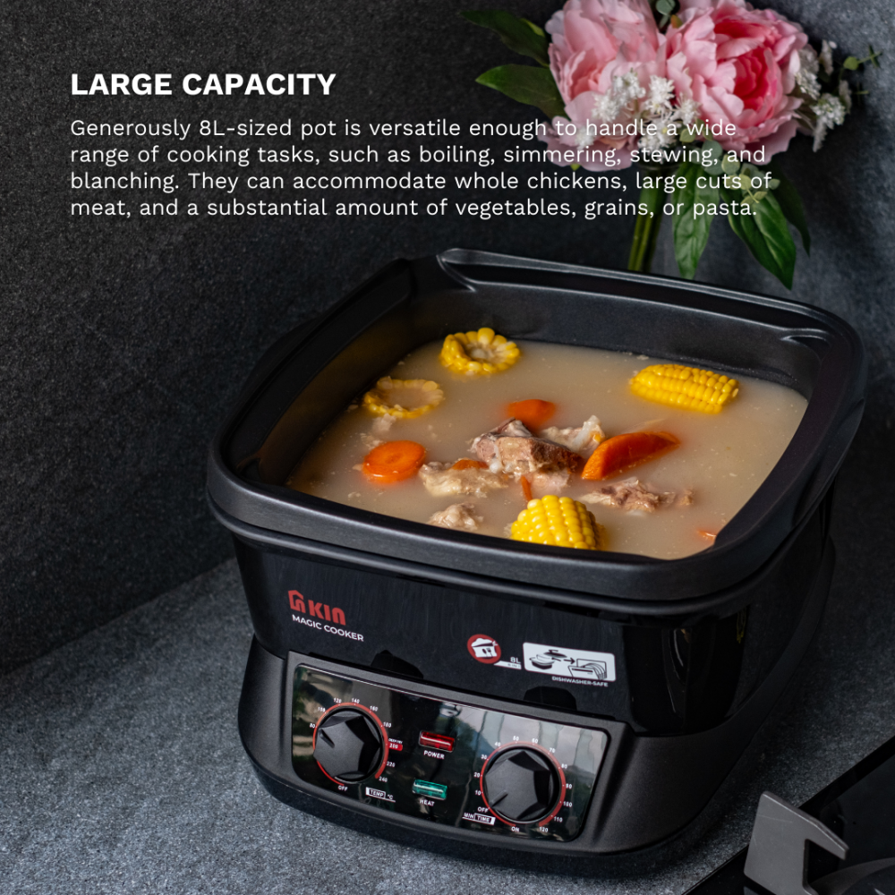 Harnessing the power of patented E-shaped thermal technology, the pot ensures an expansive heating surface, promoting even heat distribution, precise heating, and superior temperature control. Finally, the intuitive controls for adjusting temperature and cooking timer settings guarantee a seamless and user-friendly culinary journey, making this pot an indispensable addition to your kitchen repertoire.