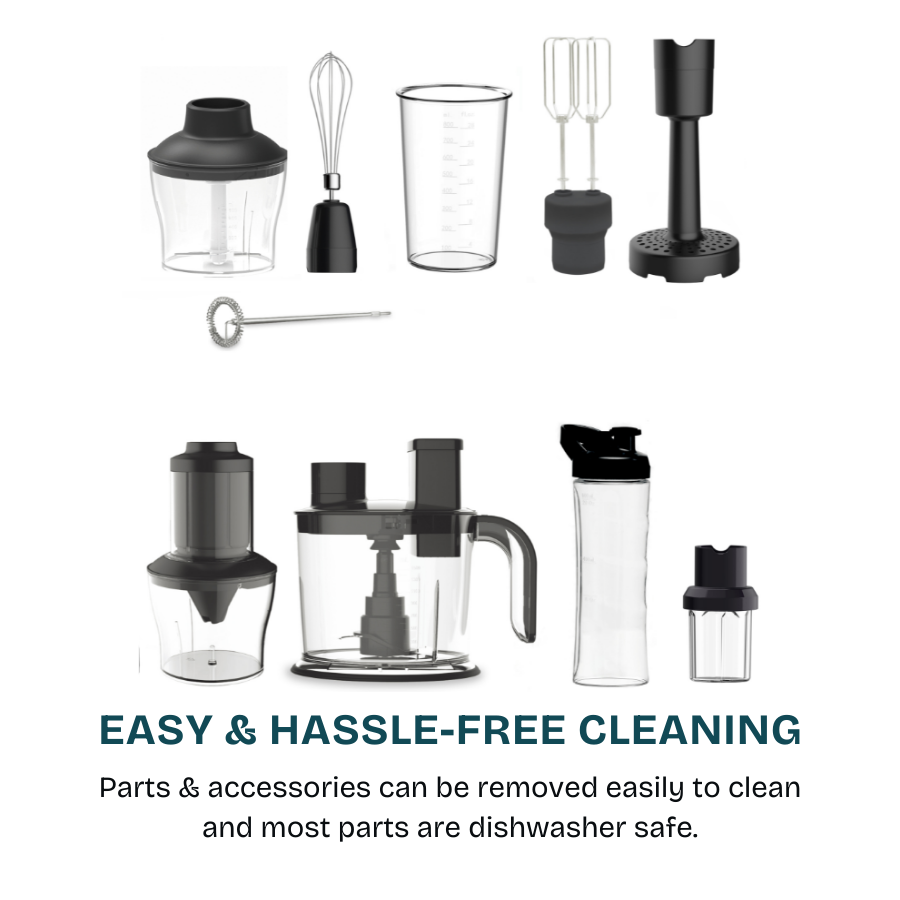 The enhanced version provides the ultimate space-saving solution, transforming kitchen versatility with 7 extra accessories. From blades to a spiralizer, grinder, bottle attachment, food processor, and potato masher, it combines multiple appliances into one sleek unit.