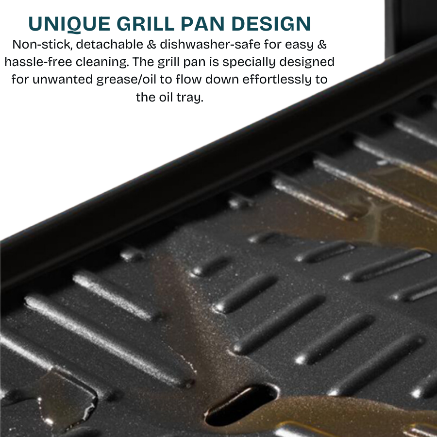 Our advanced technology significantly reduces smoke, enabling you to enjoy your favourite dishes in a healthier way. The compact design of our grilling system is ideal for small living spaces, requiring minimal dining and storage space.