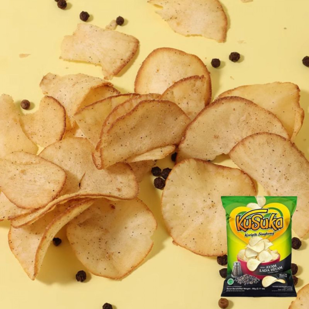 Kusuka Black Pepper Cassava Chips 60g is a crispy cassava chip snack that delivers a bold, savory black pepper kick in every bite. Made from carefully selected cassava and seasoned with a special black pepper blend, each chip is processed hygienically using modern technology to ensure top quality and satisfying crunch.