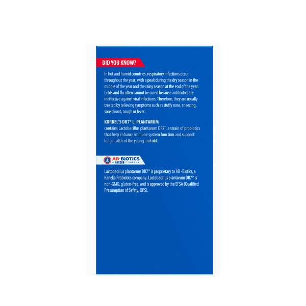 Kordel's DR7® L. PLANTARUM 1 BILLION GUARANTEED contains Lactobacillus plantarum DR7®, a strain of probiotics that help enhance immune system function and support lung health of the young and old.