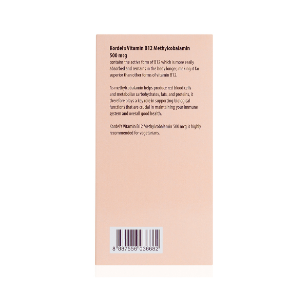 Kordel's Vitamin B12 Methylcobalamin contains the active form of B12 which is more easily absorbed and remains in the body longer, making it far superior to other forms of vitamin B12. As methylcobalamin helps produce red blood cells and metabolise carbohydrates, fats, and proteins, it therefore plays a key role in supporting biological functions that are crucial to maintaining the immune system and overall good health. Kordel's Vitamin B12 Methylcobalamin 500 mcg is highly recommended for vegetarians.