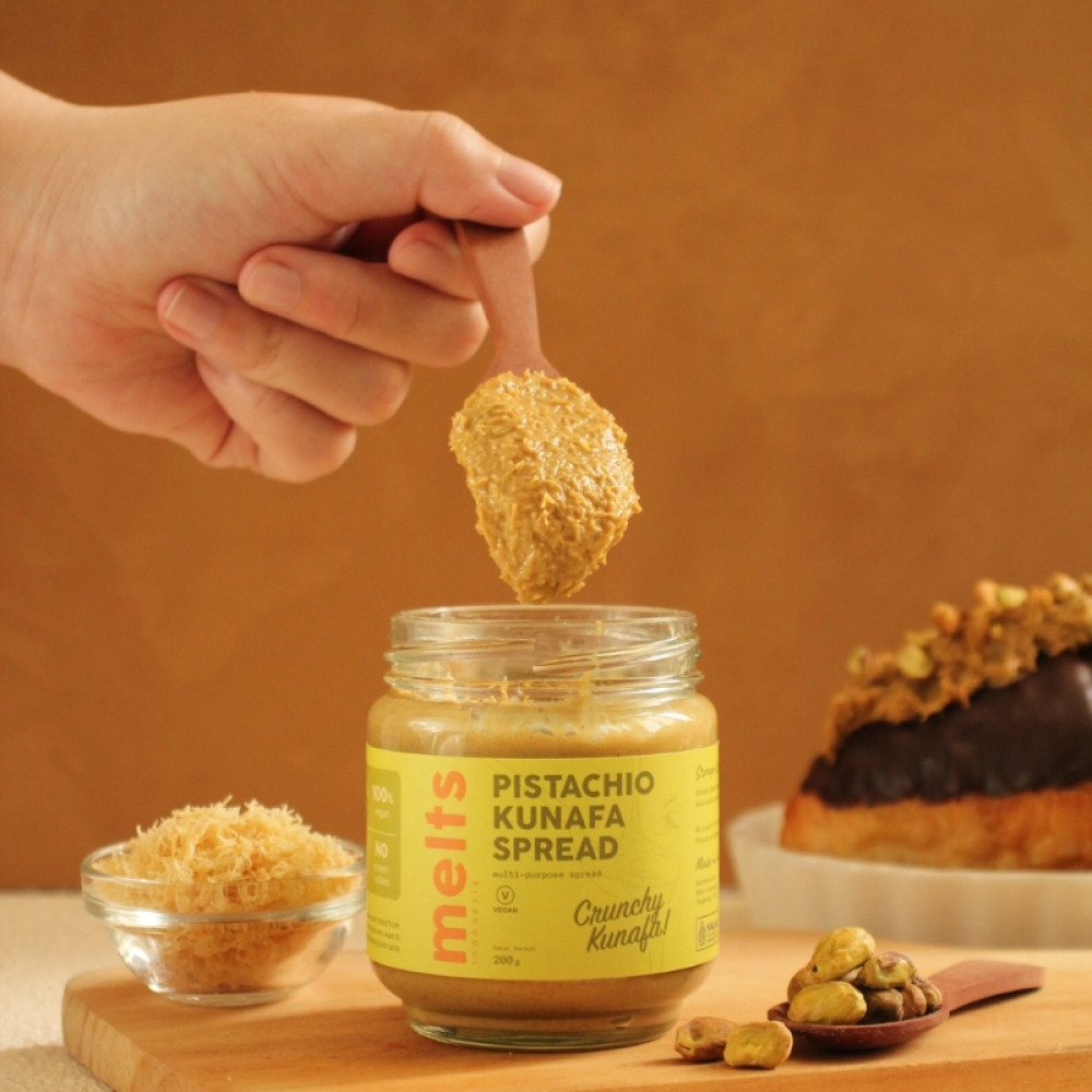 Melts Pistachio Kunafa Spread is inspired by the beloved Middle Eastern dessert, offering a rich and creamy pistachio spread perfectly paired with the delightful crunch of kunafa strands. This indulgent spread can be enjoyed in many ways spread on toast, drizzled over desserts, or incorporated into pastries. With its irresistible nutty sweetness, it’s a must-have for those who love unique and flavorful treats!