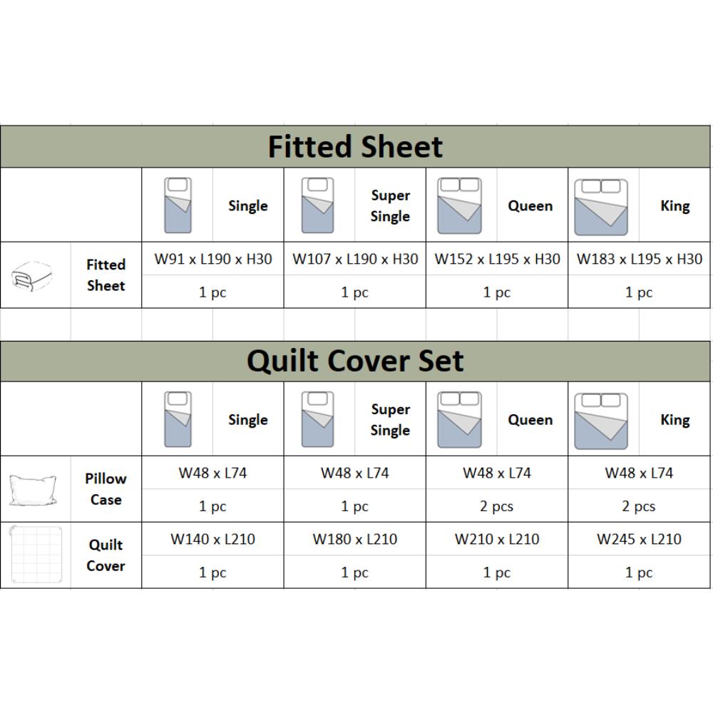 - 1 pillow case (Single/Super Single) or 2 pillow cases (Queen/King)