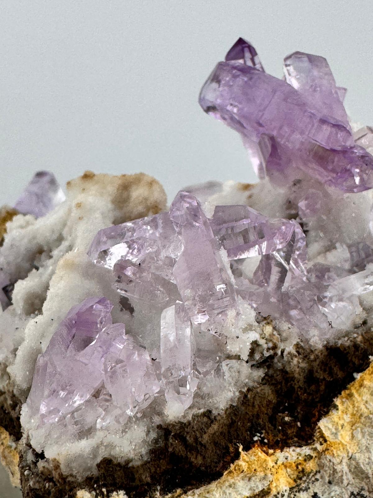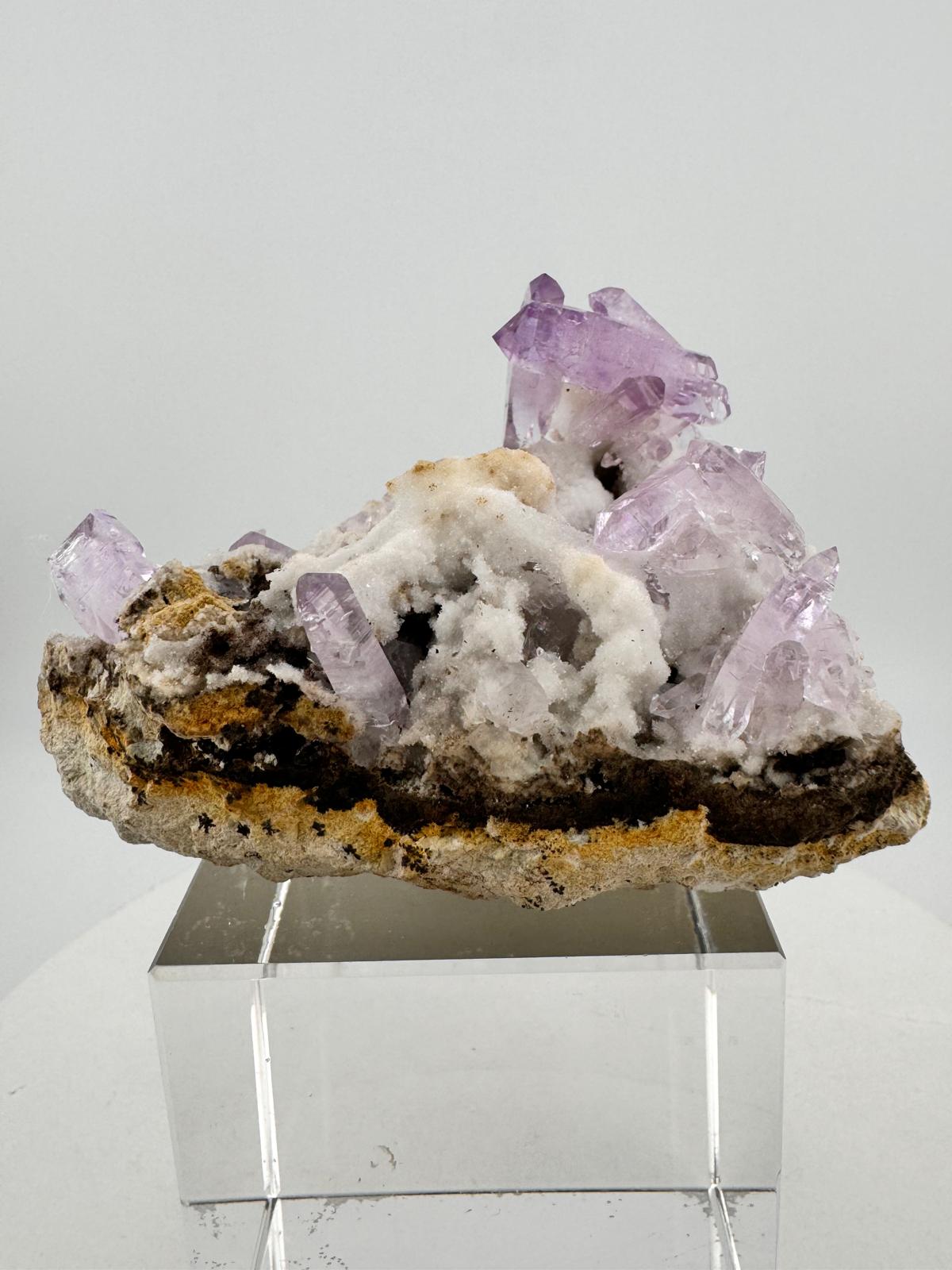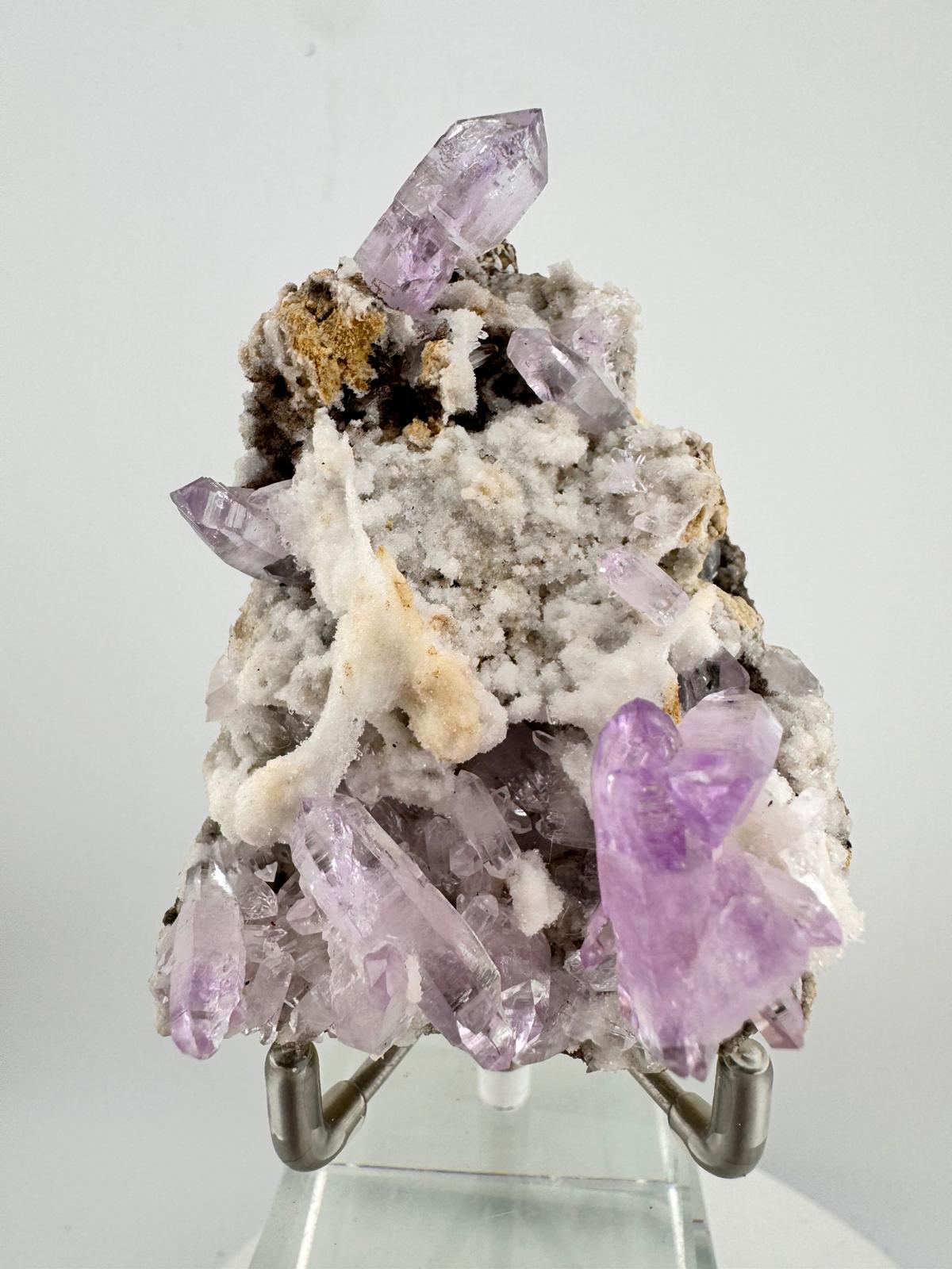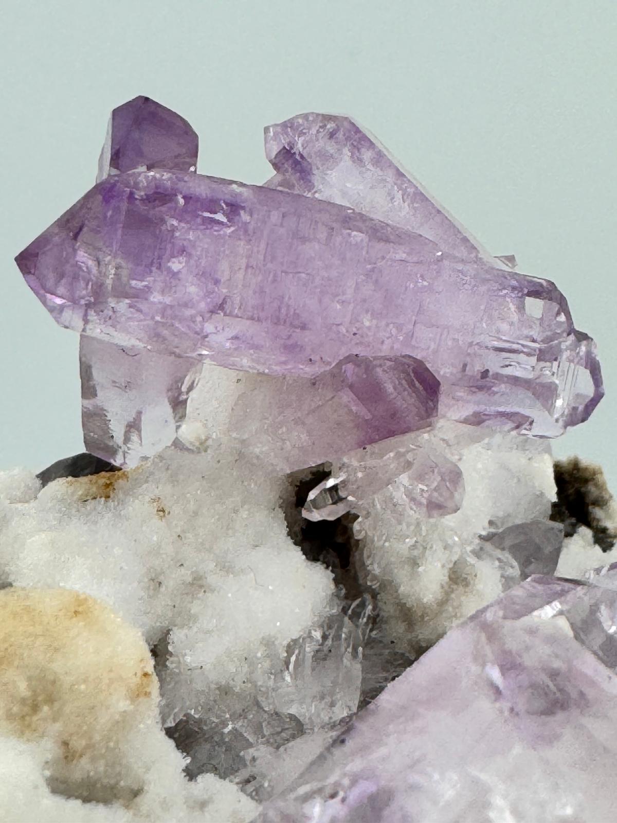 Description: Featuring another Vera Cruz Amethyst powerhouse, this cluster of lilac Vera Cruz Amethysts has amazing clarity and lustre that is typical of amethysts from this locality. The well-terminated Amethysts are very well interspersed across the bed of contrasting quartz matrix but these are not the only reasons why this is a ' must have' for every Amethyst lover in their collection. The icing on the cake goes to the largest Amethyst crystal in the cluster which incidentally happens to be an Amethyst sceptre crystal (sceptre occurs when a second crystal of quartz grows on top of a pre-existing quartz crystal in a second phase of growth) ! What are the odds?! A beautiful and well-terminated Vera Cruz Amethyst sceptre in the midst… This cluster is filled with so many of these well-loved Mexican classics that we can’t quite decide how it can be best admired - horizontal facing or vertical? What are your thoughts?