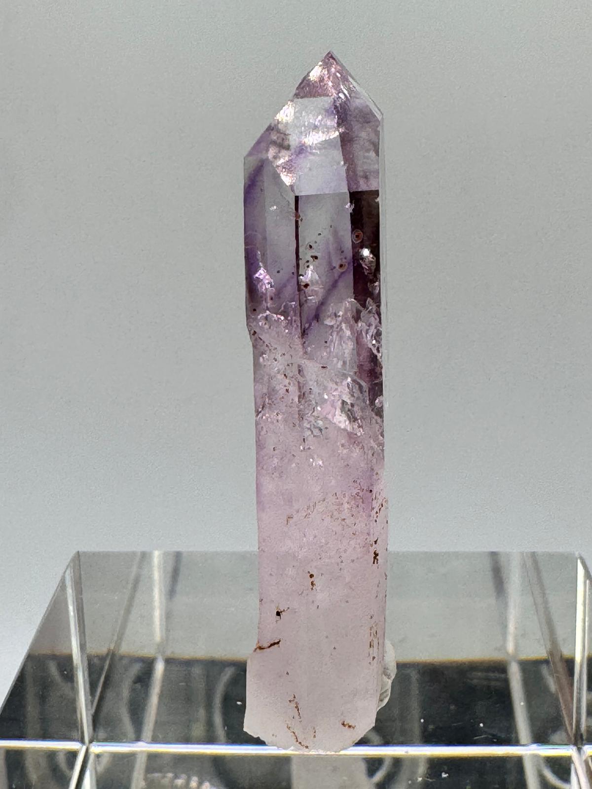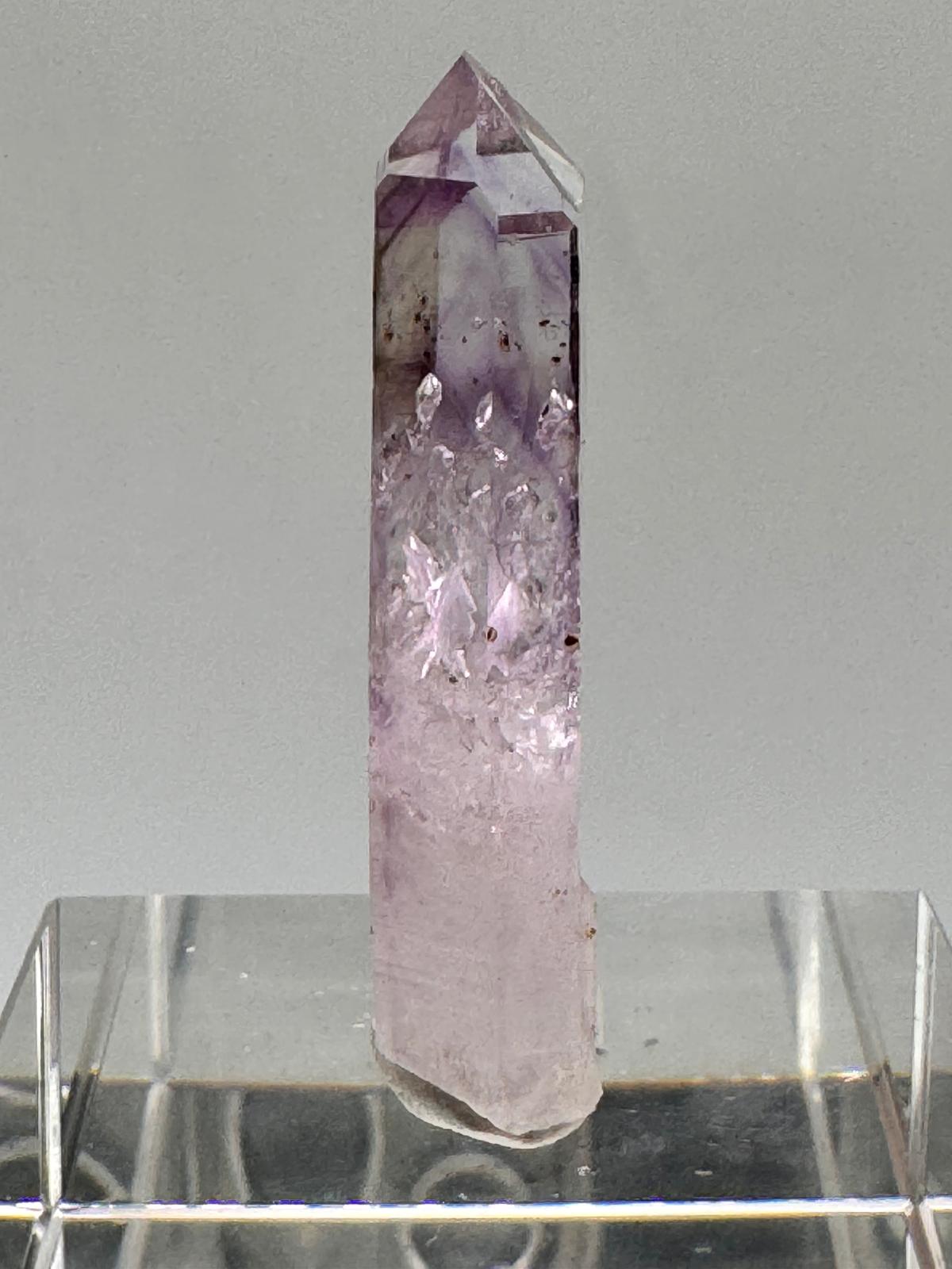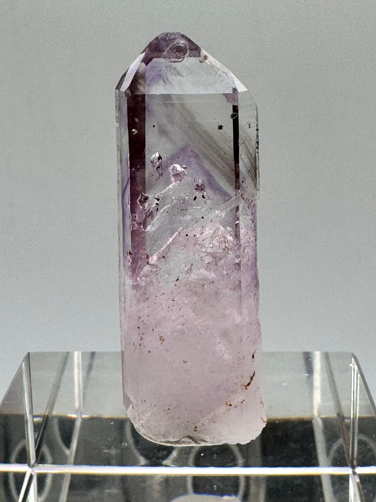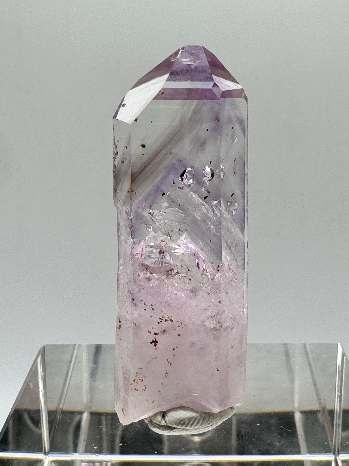 Description: A lustrous, lilac Amethyst from the famous Goboboseb Mountains. This crystal is observed to have an enhydro in it and it is believed that these small bubbles of water can be millions of years old.