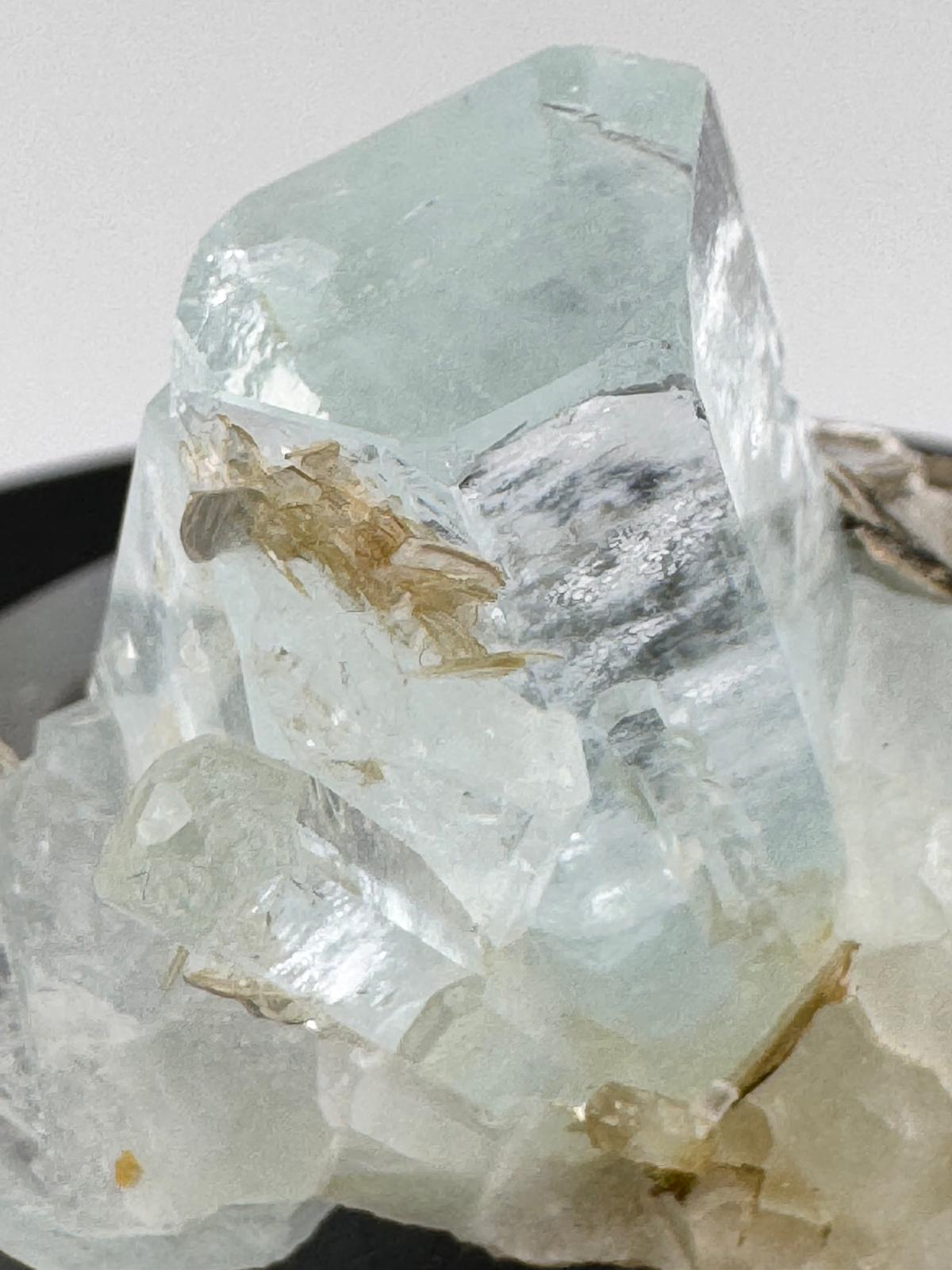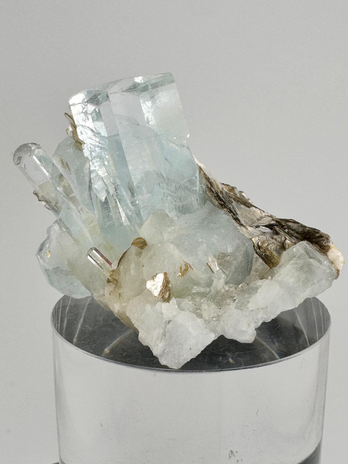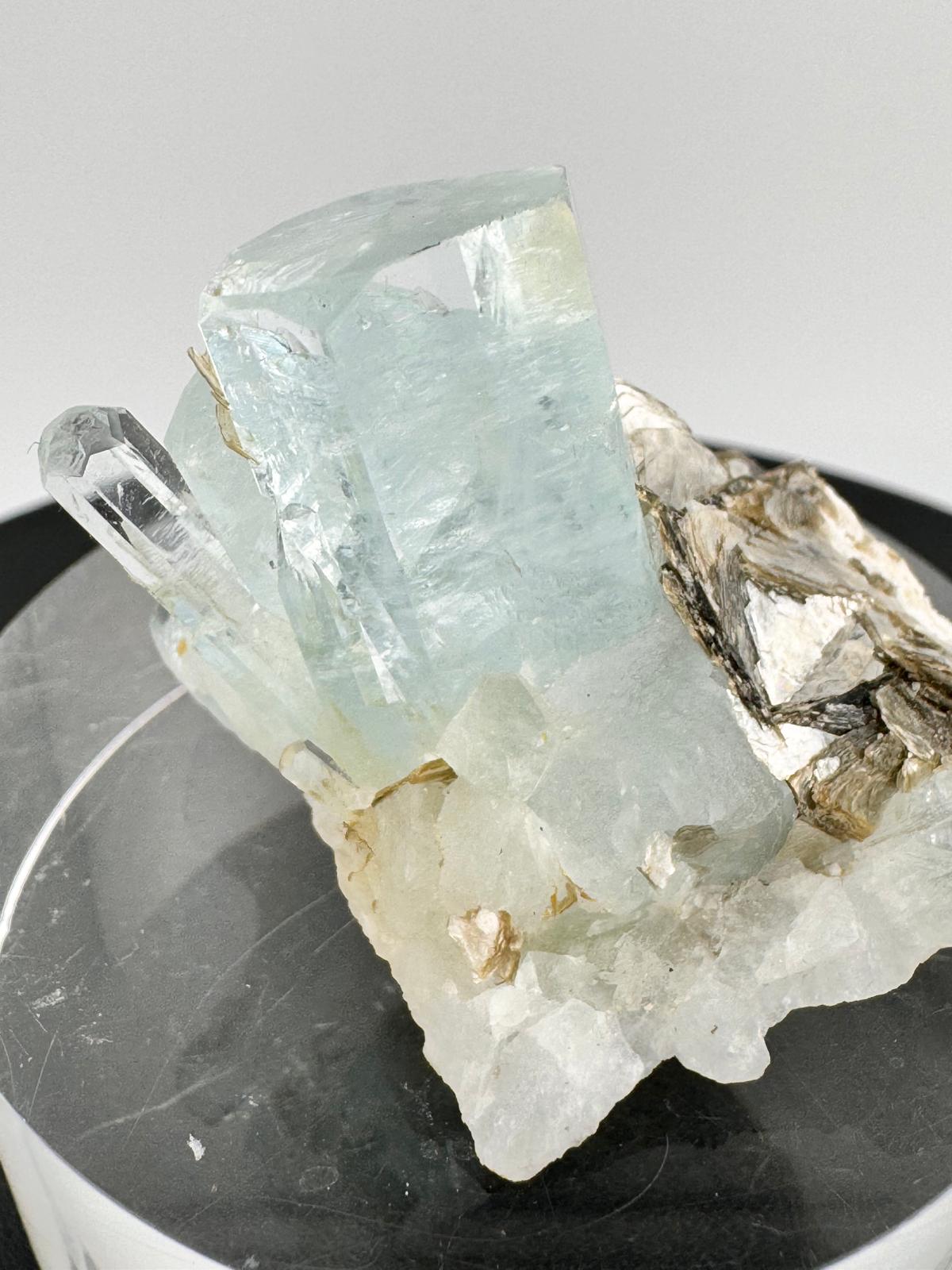 Description: Beautiful, lustrous and translucency in both the main crystal and the smaller crystals distributed near it. . It is complete all around with smooth faces and defined edges. The composition of aquamarine crystals and the golden-silverish muscovite mica crystals makes this a must for crystal lovers.