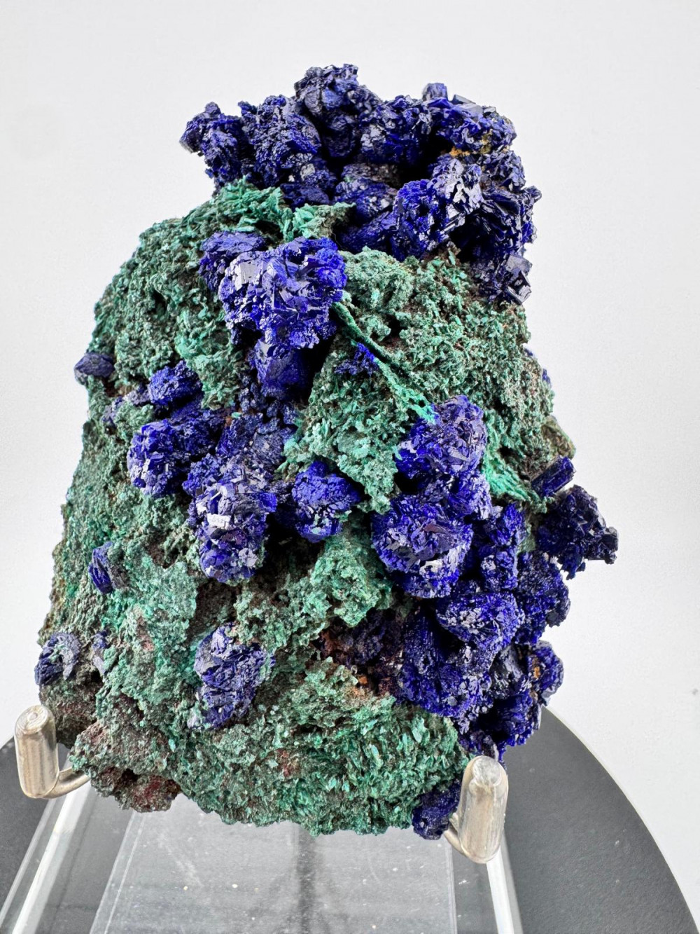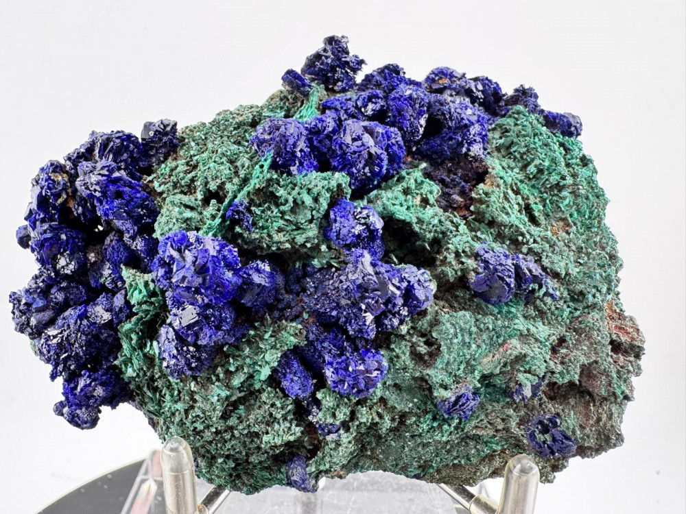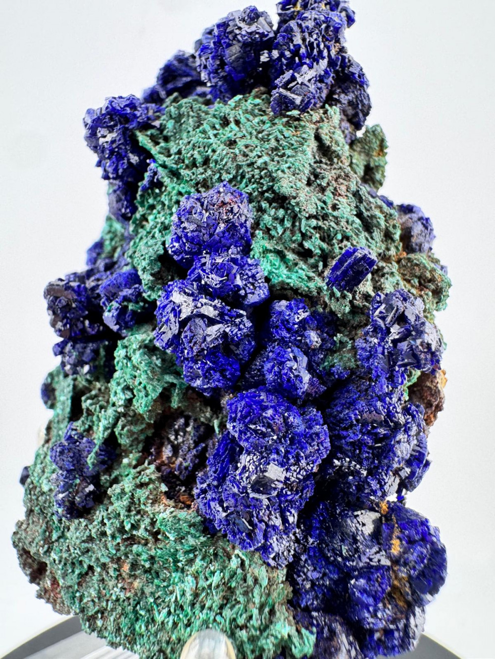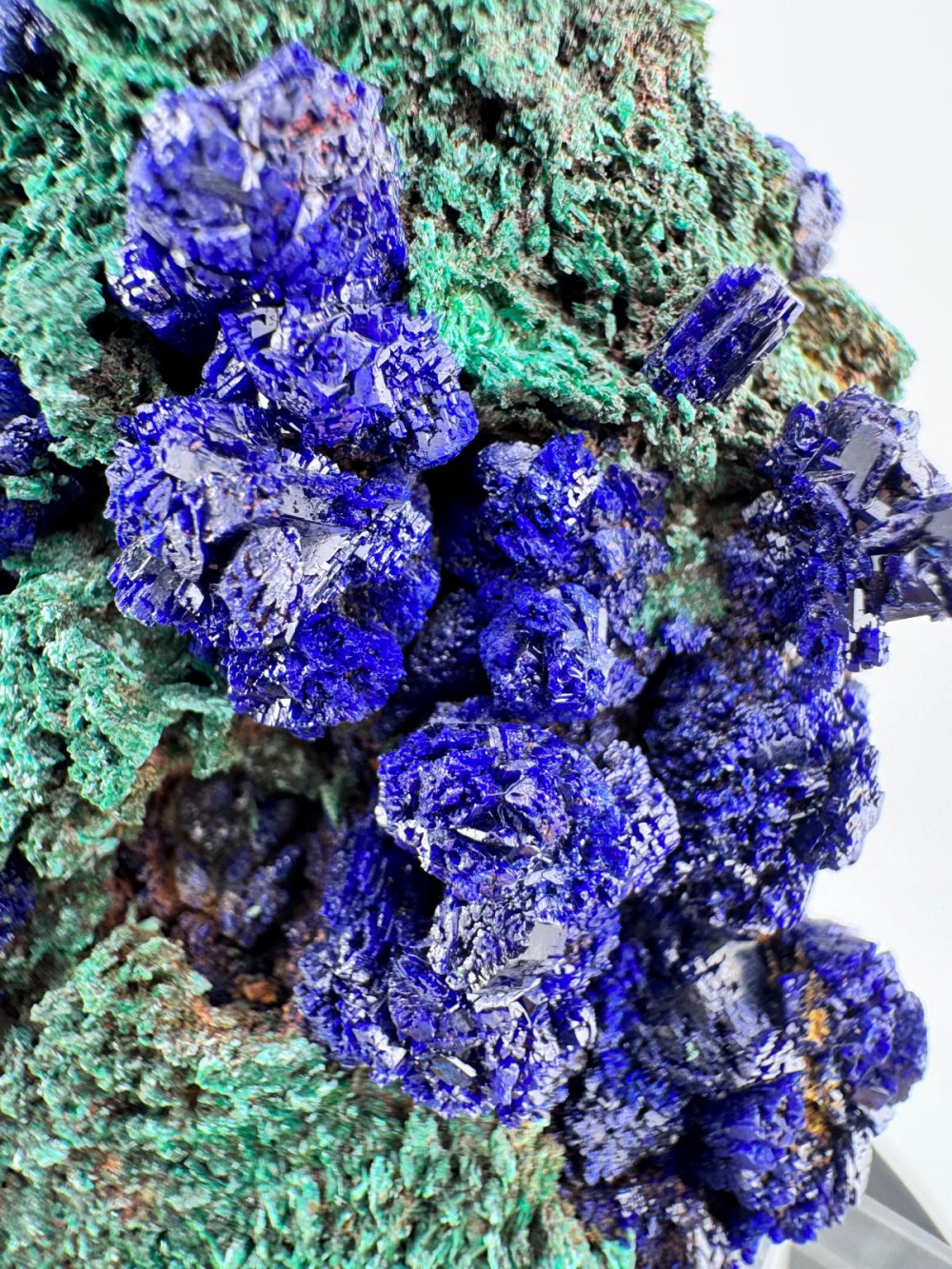 Description: Fans of Malachite and Azurite will not want to miss this. Although it is not uncommon to find both crystals together most times, if not always, their appearance always leave such a stunning impact as with this exceptional specimen from the Touissit-Bou Beker, Morocco. This is a cabinet size specimen which features a captivating interplay of lustrous, deep midnight blue Azurite aggregates on a plane of crystallized green Malachite. The entire specimen is almost dominated by sharp, glossy, and lustrous azurite aggregates which are rounded and resemble small flower buds. The crystallized Malachite has velvety green fibrous growth surfaces and along with the azurite crystals, the duo amplifies the aesthetic harmony in the composition on the specimen. Just take a moment to imagine a lush meadow of velvety green ‘grass’ covered in glistening morning dew and rising from the meadow, cluster of tiny blue aggregates like fresh flower buds complete the picture perfect. The Touissit-Bou Beker is renowned for producing azurite and malachite alongside other minerals and this specimen is a strong testament to Touissit-Bou Beker's reputation .