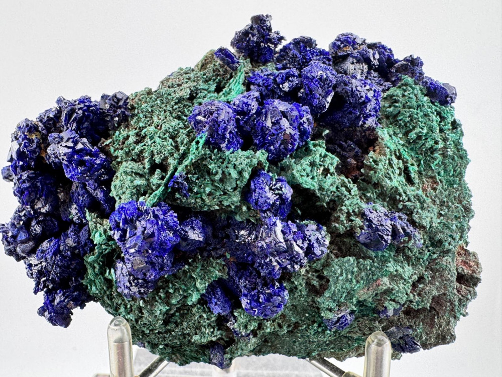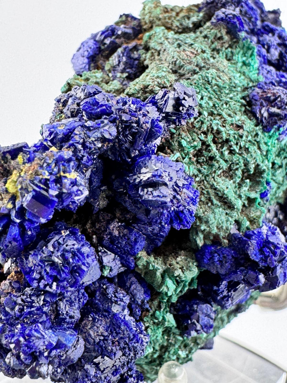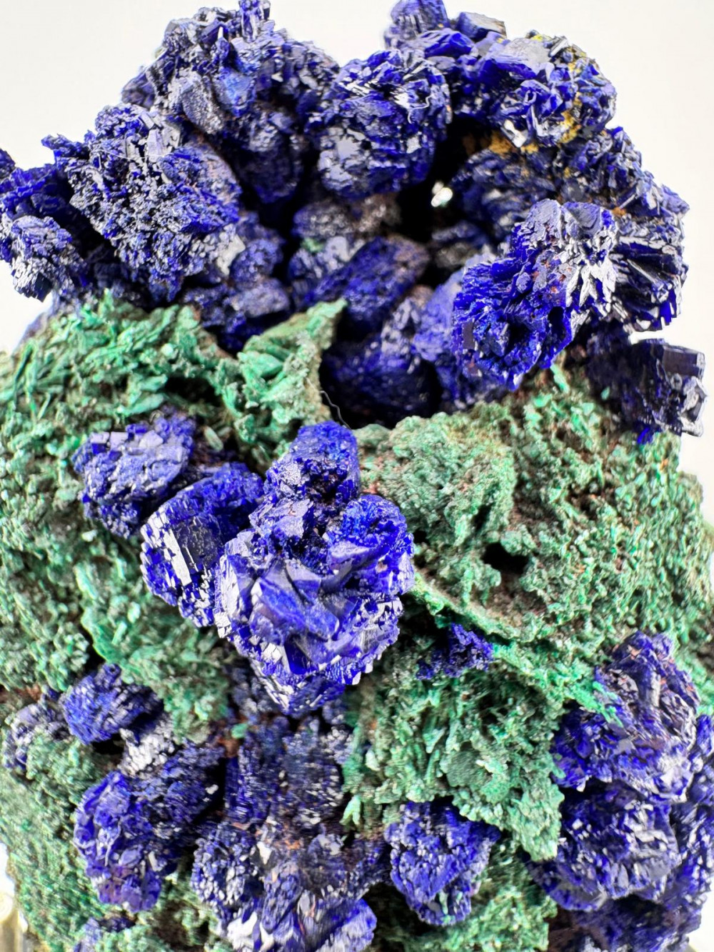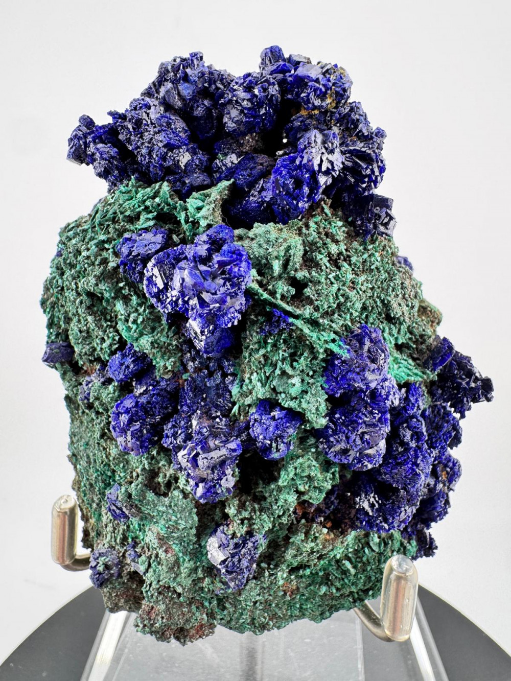 Description: Fans of Malachite and Azurite will not want to miss this. Although it is not uncommon to find both crystals together most times, if not always, their appearance always leave such a stunning impact as with this exceptional specimen from the Touissit-Bou Beker, Morocco. This is a cabinet size specimen which features a captivating interplay of lustrous, deep midnight blue Azurite aggregates on a plane of crystallized green Malachite. The entire specimen is almost dominated by sharp, glossy, and lustrous azurite aggregates which are rounded and resemble small flower buds. The crystallized Malachite has velvety green fibrous growth surfaces and along with the azurite crystals, the duo amplifies the aesthetic harmony in the composition on the specimen. Just take a moment to imagine a lush meadow of velvety green ‘grass’ covered in glistening morning dew and rising from the meadow, cluster of tiny blue aggregates like fresh flower buds complete the picture perfect. The Touissit-Bou Beker is renowned for producing azurite and malachite alongside other minerals and this specimen is a strong testament to Touissit-Bou Beker's reputation .