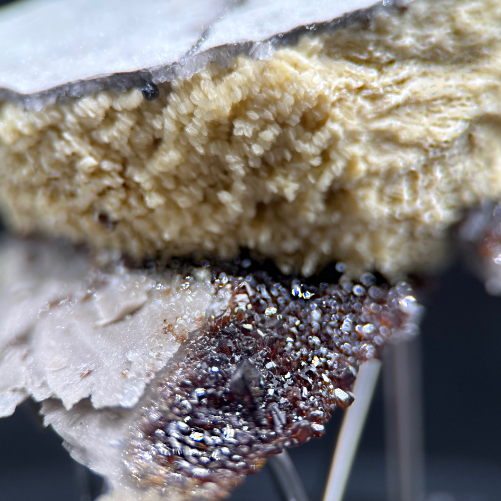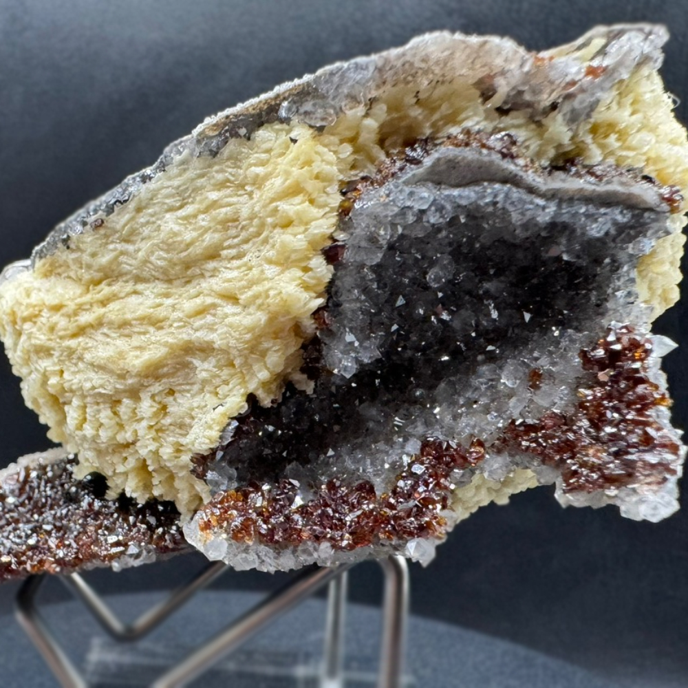 Description: Another winner from Elmwood Mine that features a large crystallized grouping of barite that is neatly sandwiched between several pieces of breccia chip matrix. As Mother Nature would have it, the underlying sparkling quartz and sphalerite crystals (depending on how you would display this beauty, of course!) lend a magical touch in enhancing the aesthetics of this beautiful specimen. What a combi-winner!