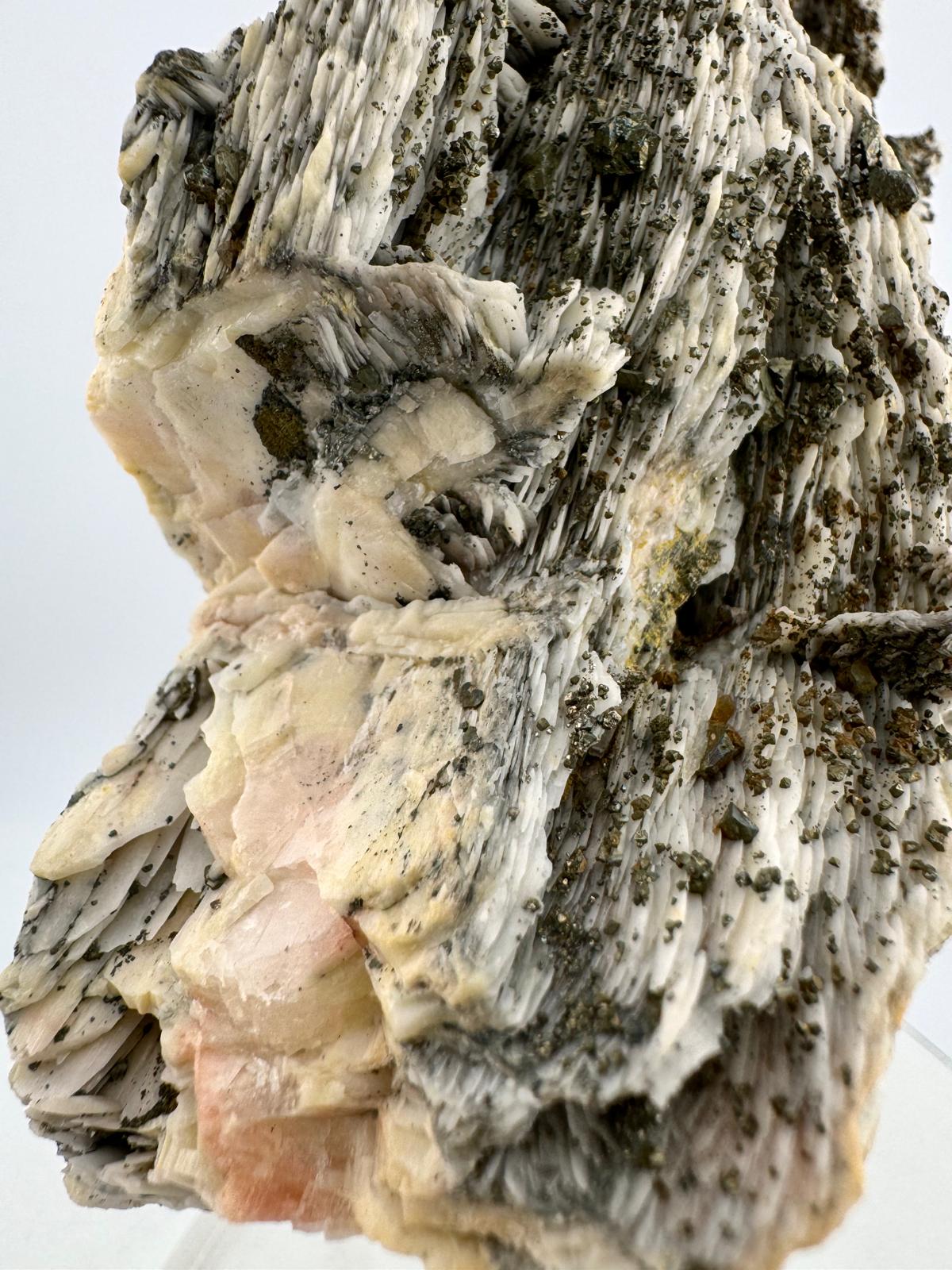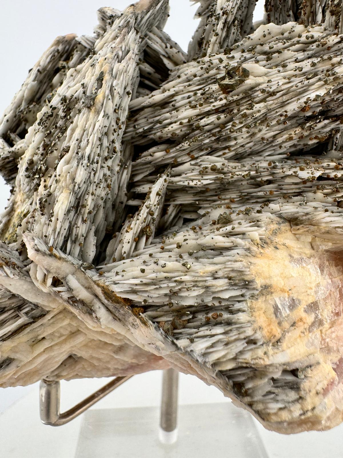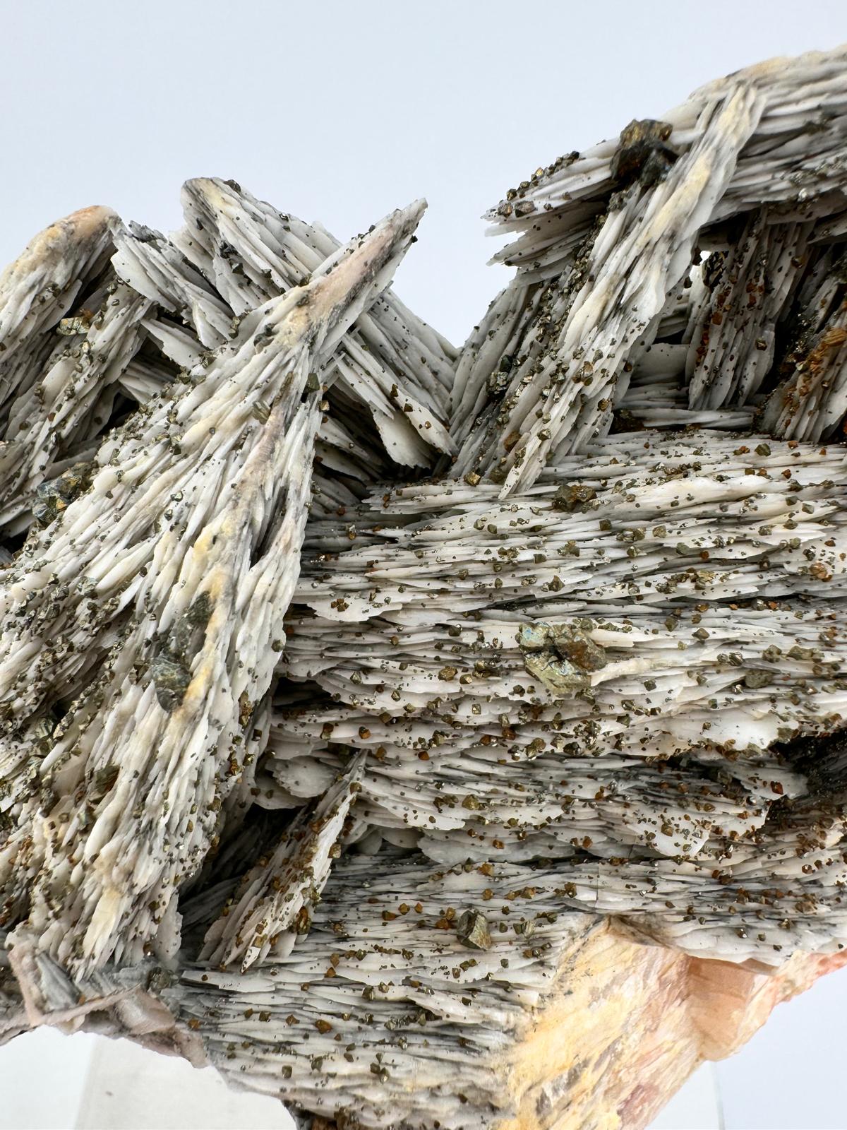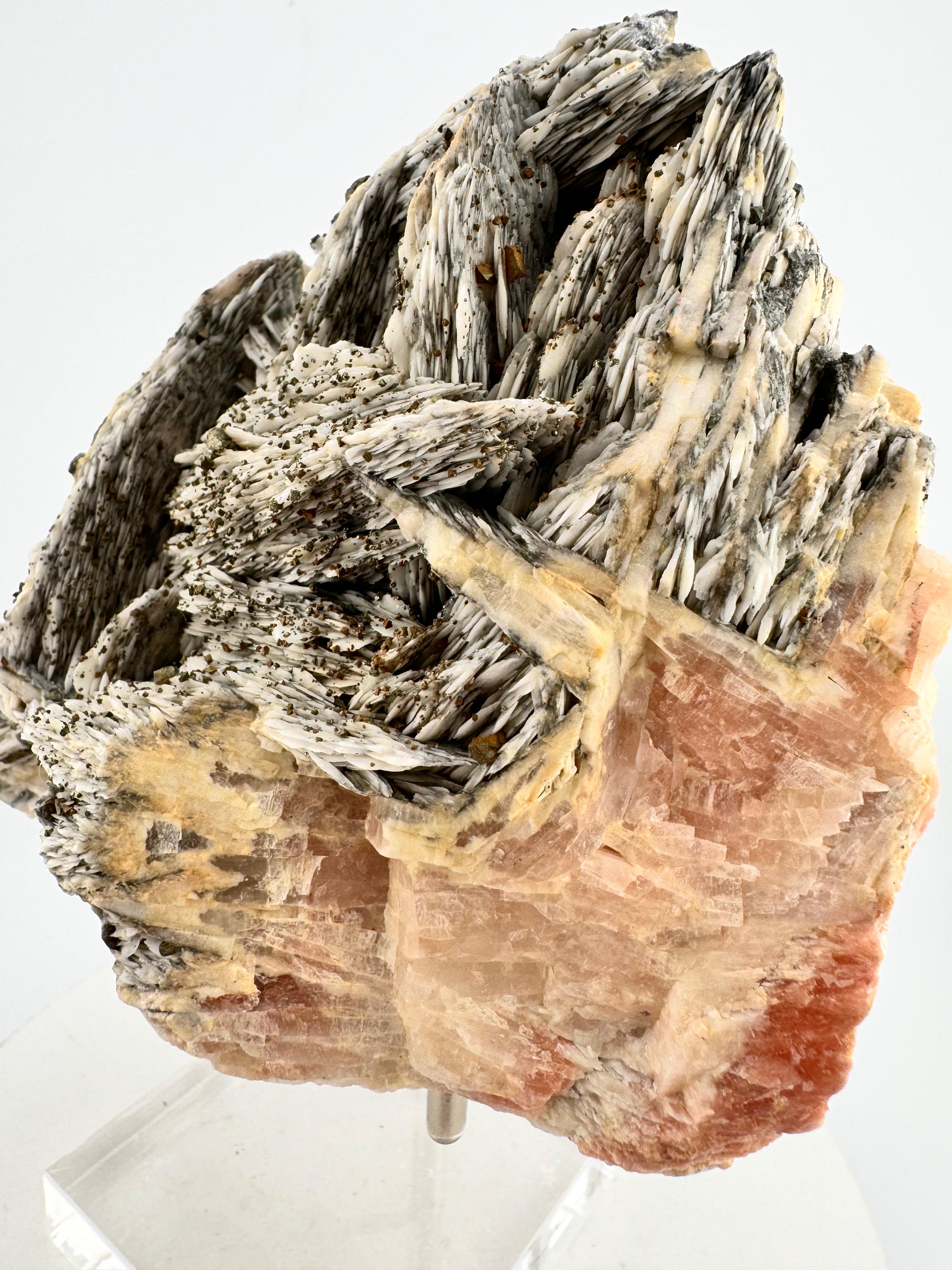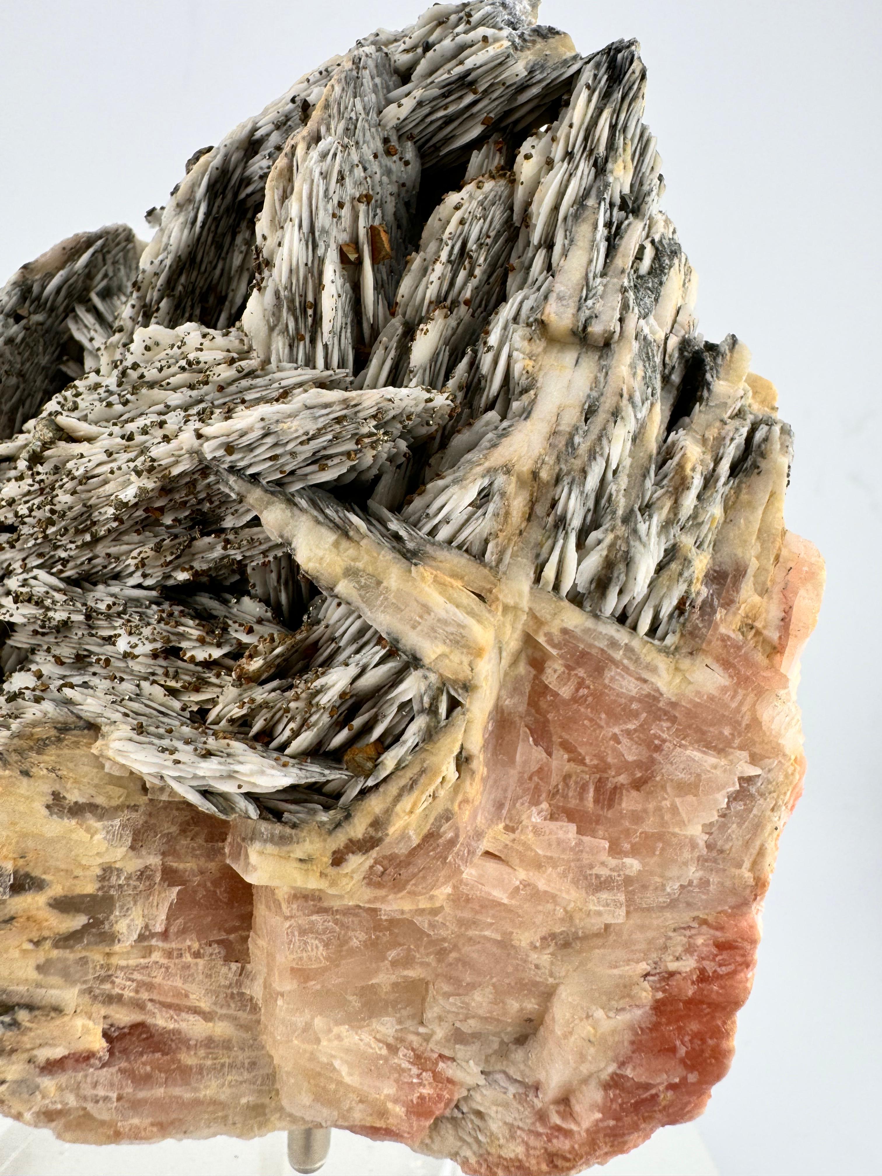 Description: This specimen is a heavy weight in its class (literally heavy and just over 1.2kg) but also in overall aesthetics and the structural composition of this incredible beauty. This is Mother Nature at her best not confined by space or time, her creativity unmatched even before the dawn of man. The strong, powerful and raw contrast in colours between the darker Baryte blades and the cluster of Chalcopyrites in soft, pastel hues creates a dynamic interplay of contrasting colours for a striking visual impact. This beautiful piece comes from Dreislar Mine in the Sauerland area, Germany, famous for producing some of the most beautiful barytes and Chalcopyrites.
