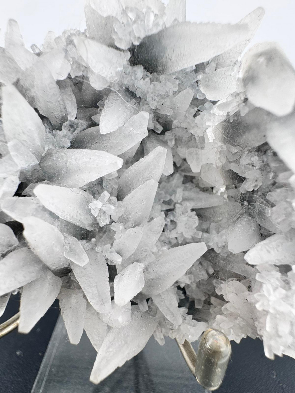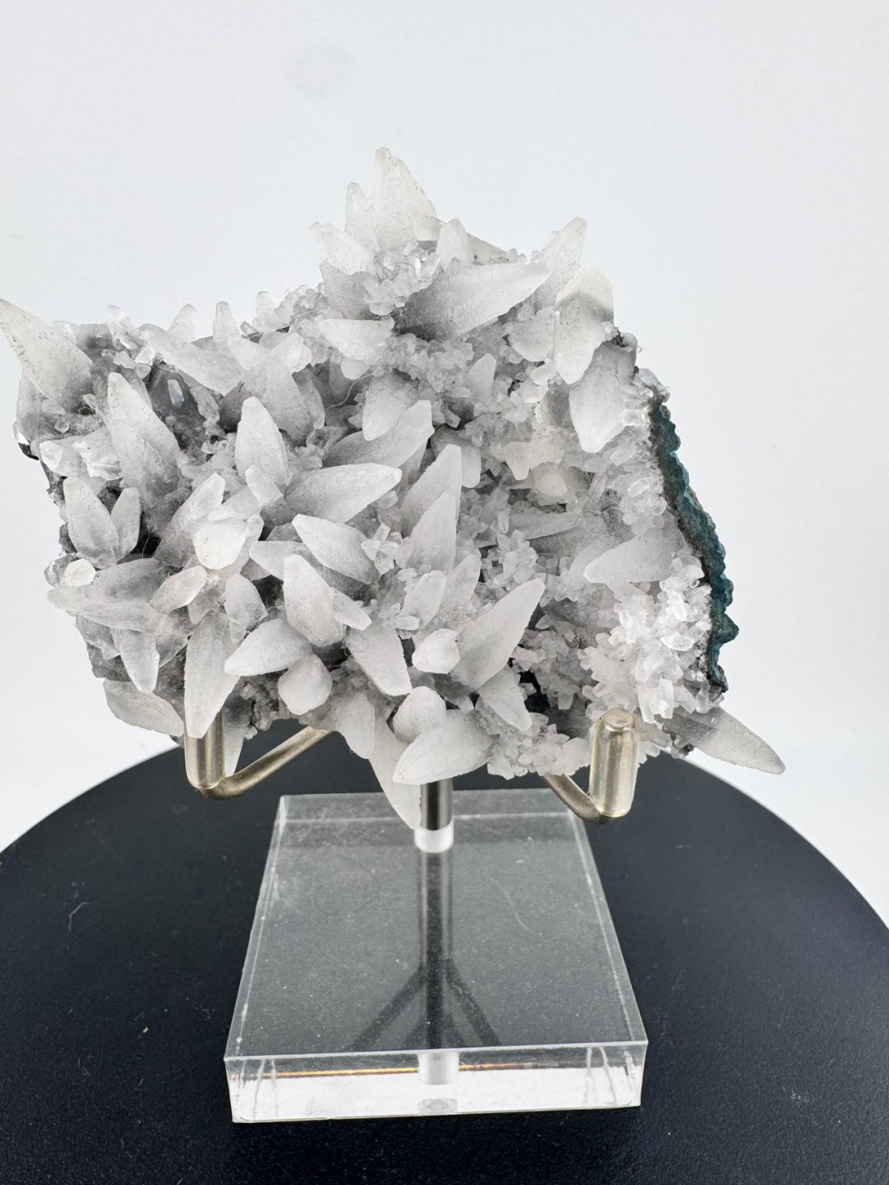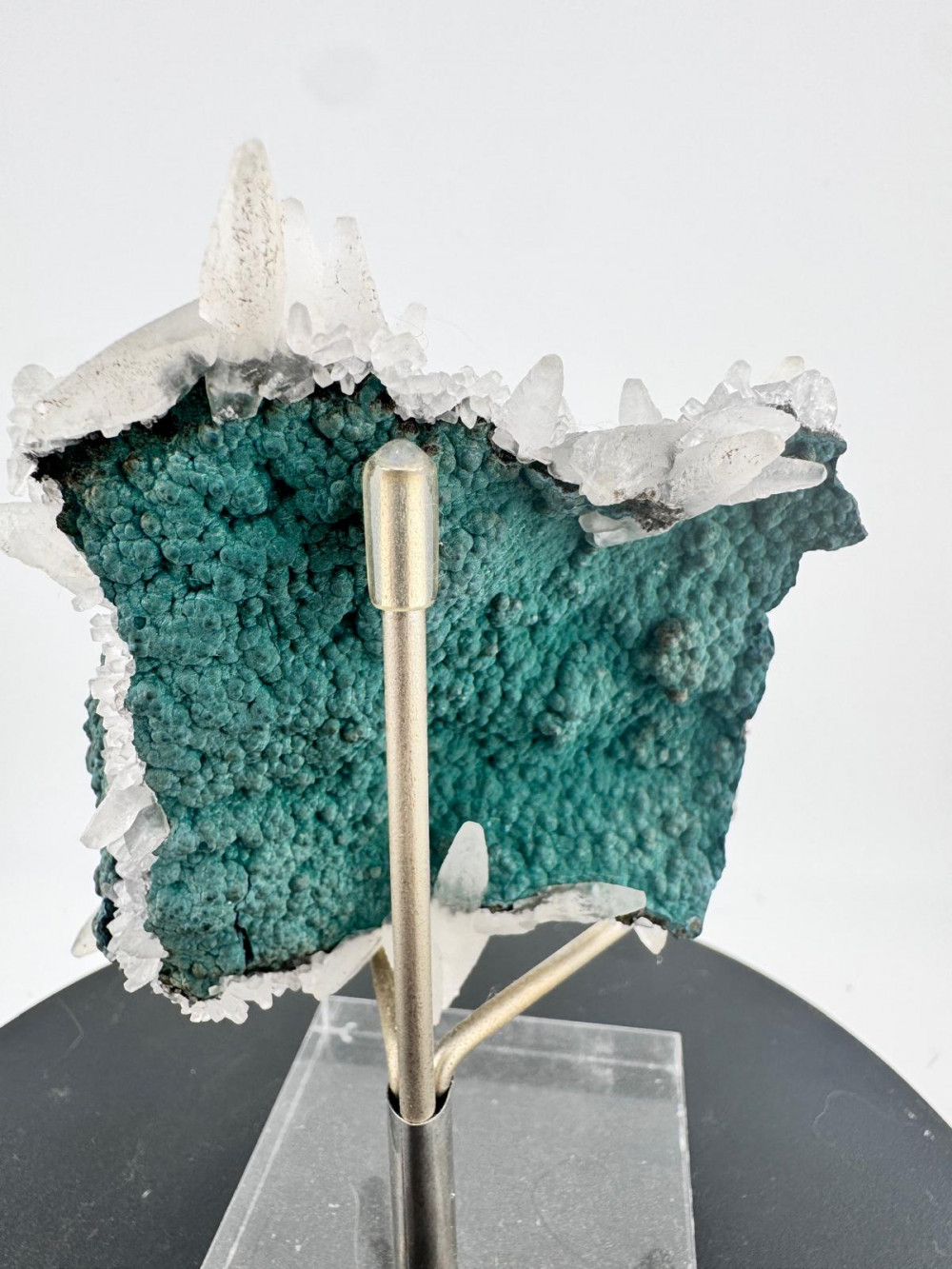 Description: This stunning combination, though common in Brazil, stands out as a truly exceptional find. It features two plates of deep green, botryoidal celadonite, one at the base and the other on the back, beautifully merged by an array of delicate, lustrous white Calcite scalenohedrons, and if one might add, an aesthetic contrast of green and white. What makes this specimen particularly rare is that it has remarkably managed to almost stay free from damages, a strong testament to its remarkable preservation despite its fragile nature.