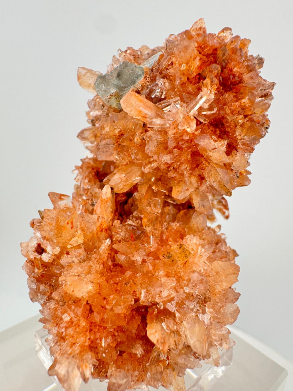 Description: Imagine a mineral specimen that embodies the essence of natural beauty, where two exceptional crystals blend in perfect harmony as a true testament to Nature’s master craftmanship. This extraordinary specimen from the renowned Navidad Mine features a rare combination where a transparent Fluorite with green hues sits almost purposefully amongst lustrous orange Creedite crystals radiating in acicular sprays. The Fluorite's glassy lustre and transparency enhance the overall visual appeal, making it a perfect partner to the Creedite which is known for its vibrant colours as seen in this orange specimen. The strong lustre and good transparency of both crystals highlight the exceptional quality of this rare combination, making this specimen a beautiful collection for any mineral collectors regardless of whether you are a seasoned collector or just someone who appreciates the wonders of natural beauty.