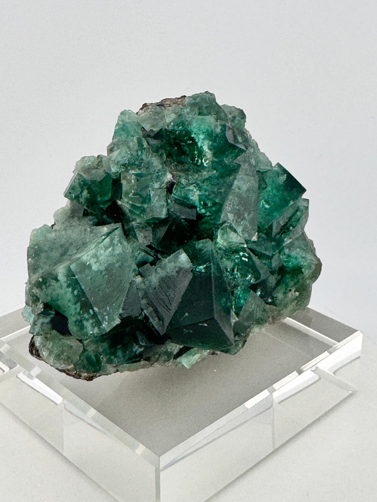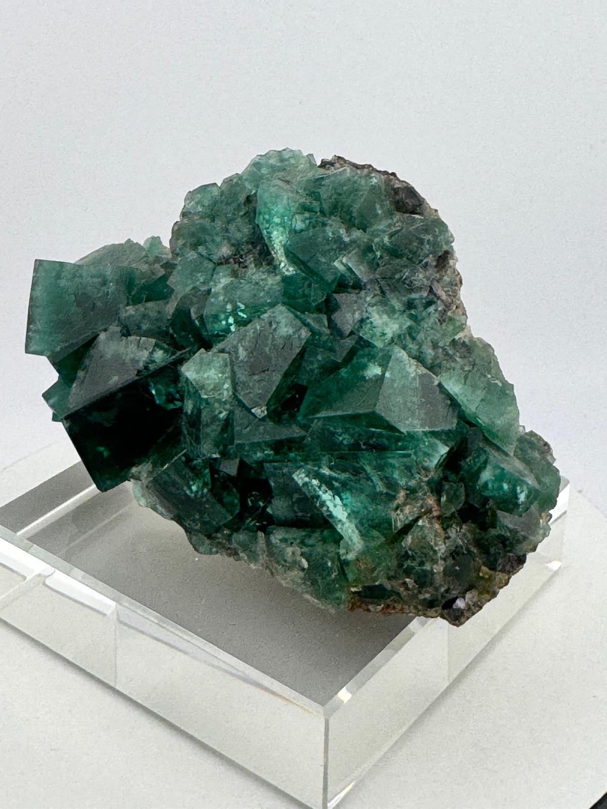 Description: Beautiful large size specimen of gemmy and lustrous fluorite crystals from the world famous locality - Rogerly Mine. Great colour and lustre. Fluorite cubes are well coloured - dark emerald green in colour with a strong blue daylight fluorescence, and an even strong fluorescence under long wave UV light. This amazing fluorite crystals change colour in different lights - in natural light they are blue, in artificial light they are green. Click on the YouTube link and be in for a delightful visual treat on the amazing natural transformation of fluorite cubes that became extraordinary from the ordinary .