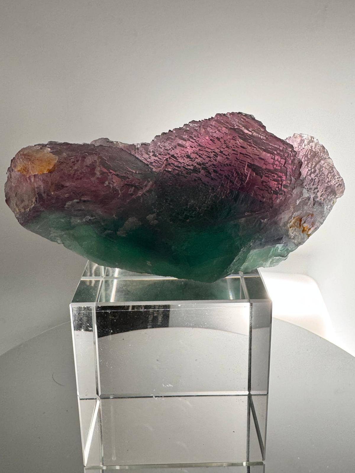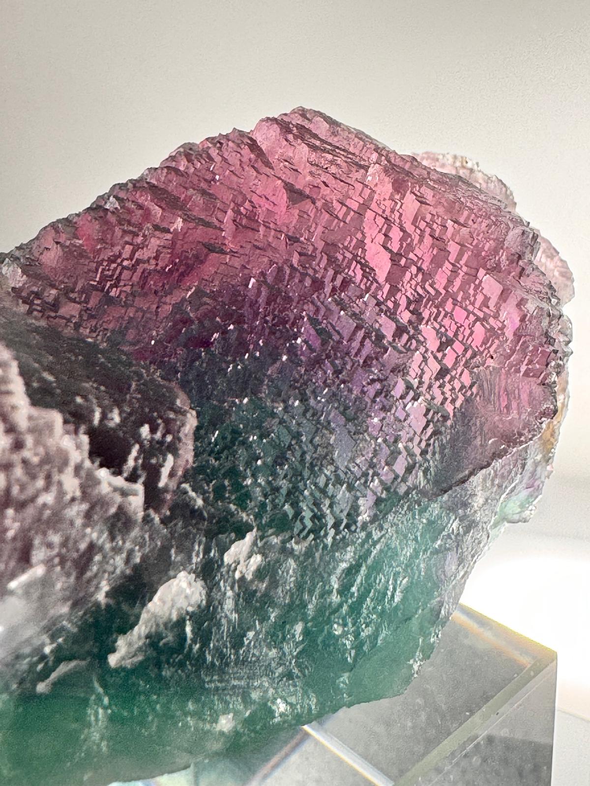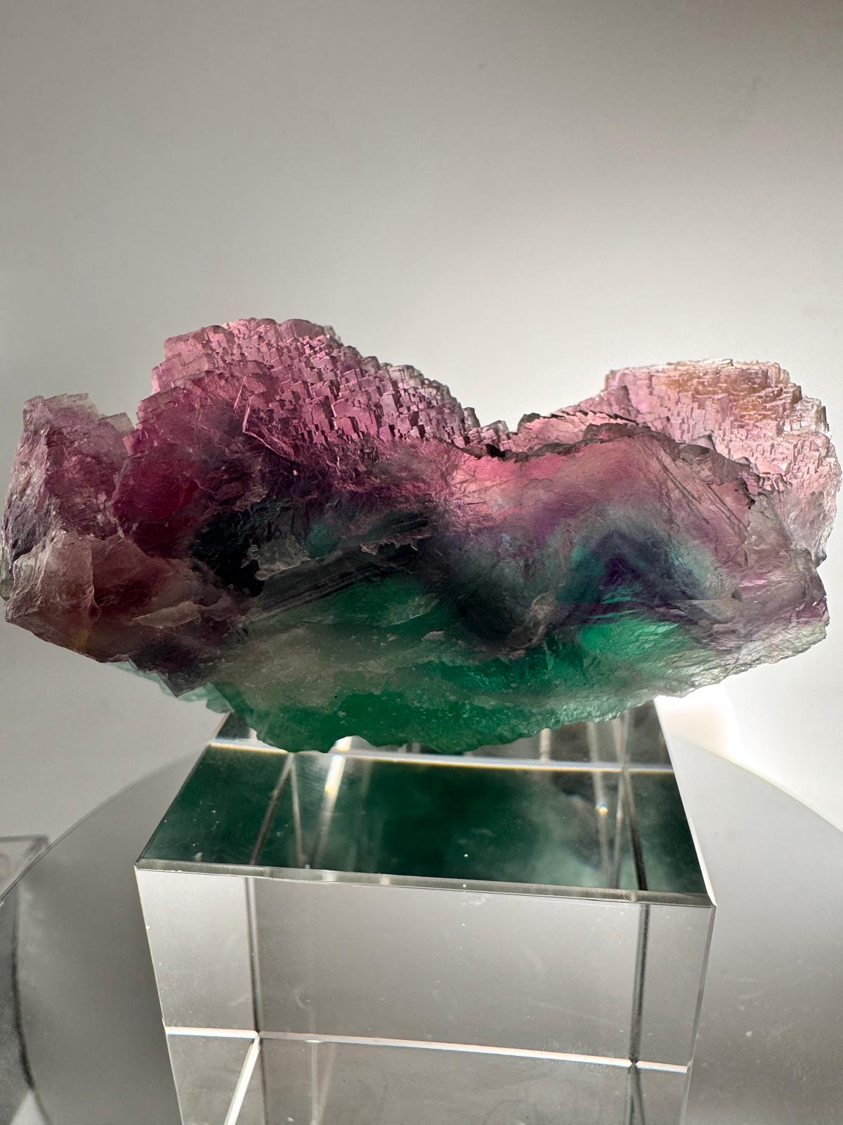 Description: Under normal lighting, the translucent and lustrous stepped octahedral Fluorite crystals have a shimmering effect due to its stepped surface that reflects light. The Fluorite exhibits an intense green right in the centre with a beautiful violet zoning in the outer area (Photos 1 & 2). The Fluorite looks amazingly stunning with the kaleidoscope of intense hues under lower light backlight conditions where the Fluorite is beautifully transformed into another masterpiece by Mother Nature (Photos 3 & onwards).