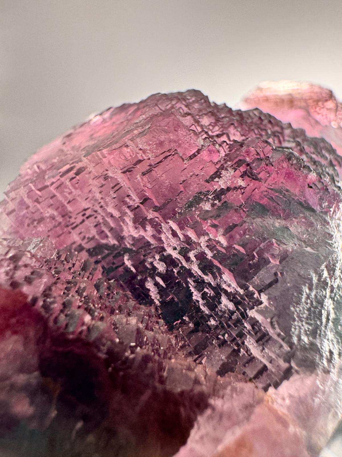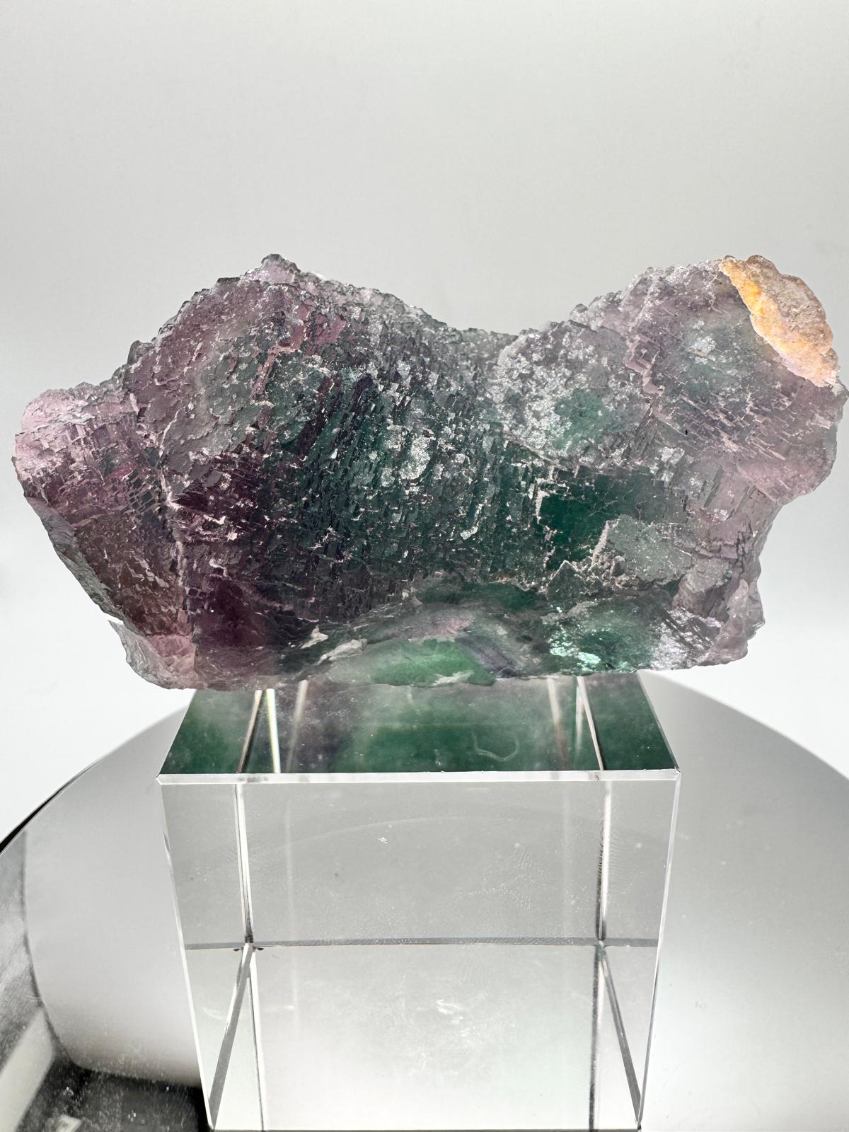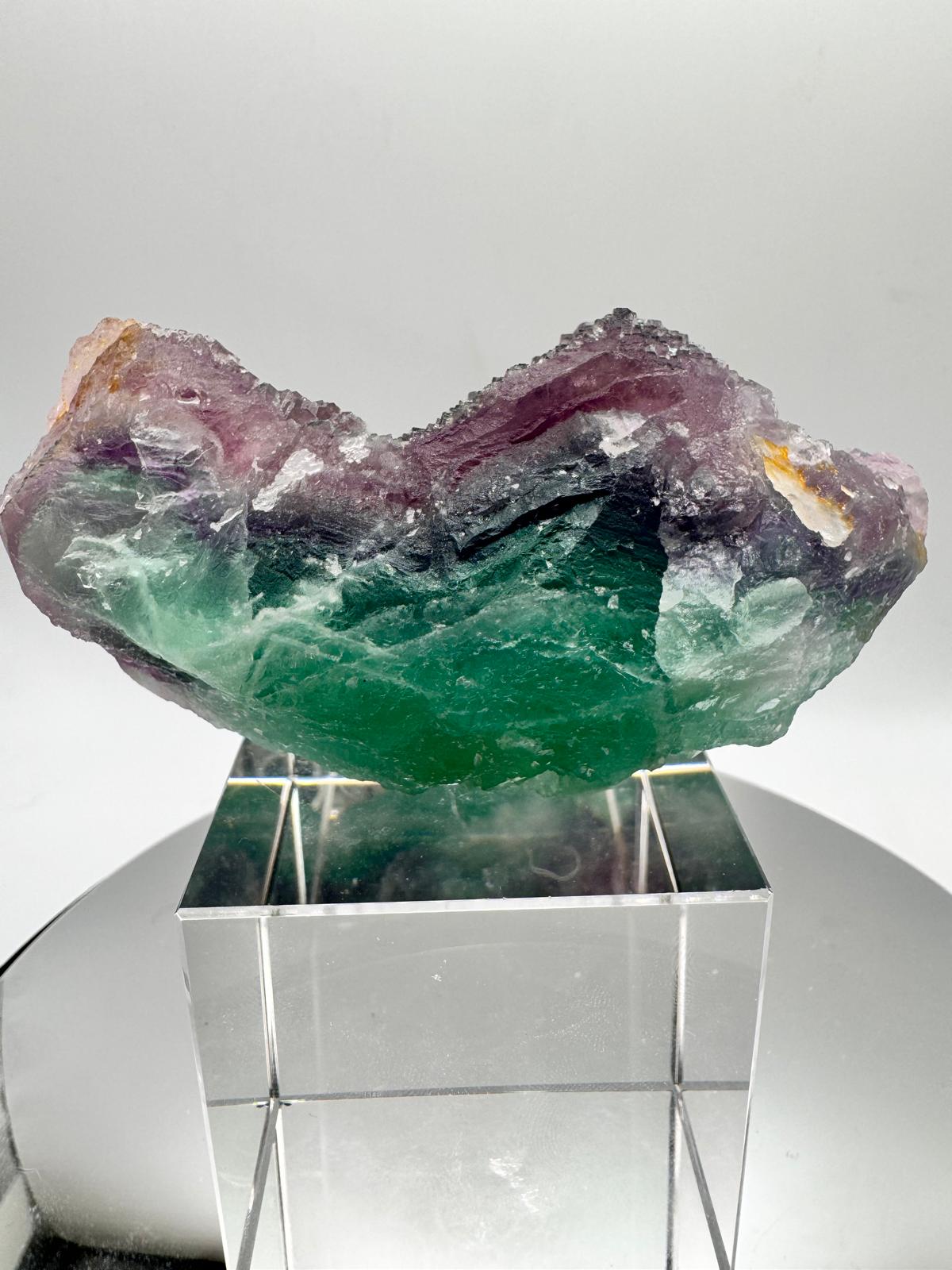 Description: Under normal lighting, the translucent and lustrous stepped octahedral Fluorite crystals have a shimmering effect due to its stepped surface that reflects light. The Fluorite exhibits an intense green right in the centre with a beautiful violet zoning in the outer area (Photos 1 & 2). The Fluorite looks amazingly stunning with the kaleidoscope of intense hues under lower light backlight conditions where the Fluorite is beautifully transformed into another masterpiece by Mother Nature (Photos 3 & onwards).