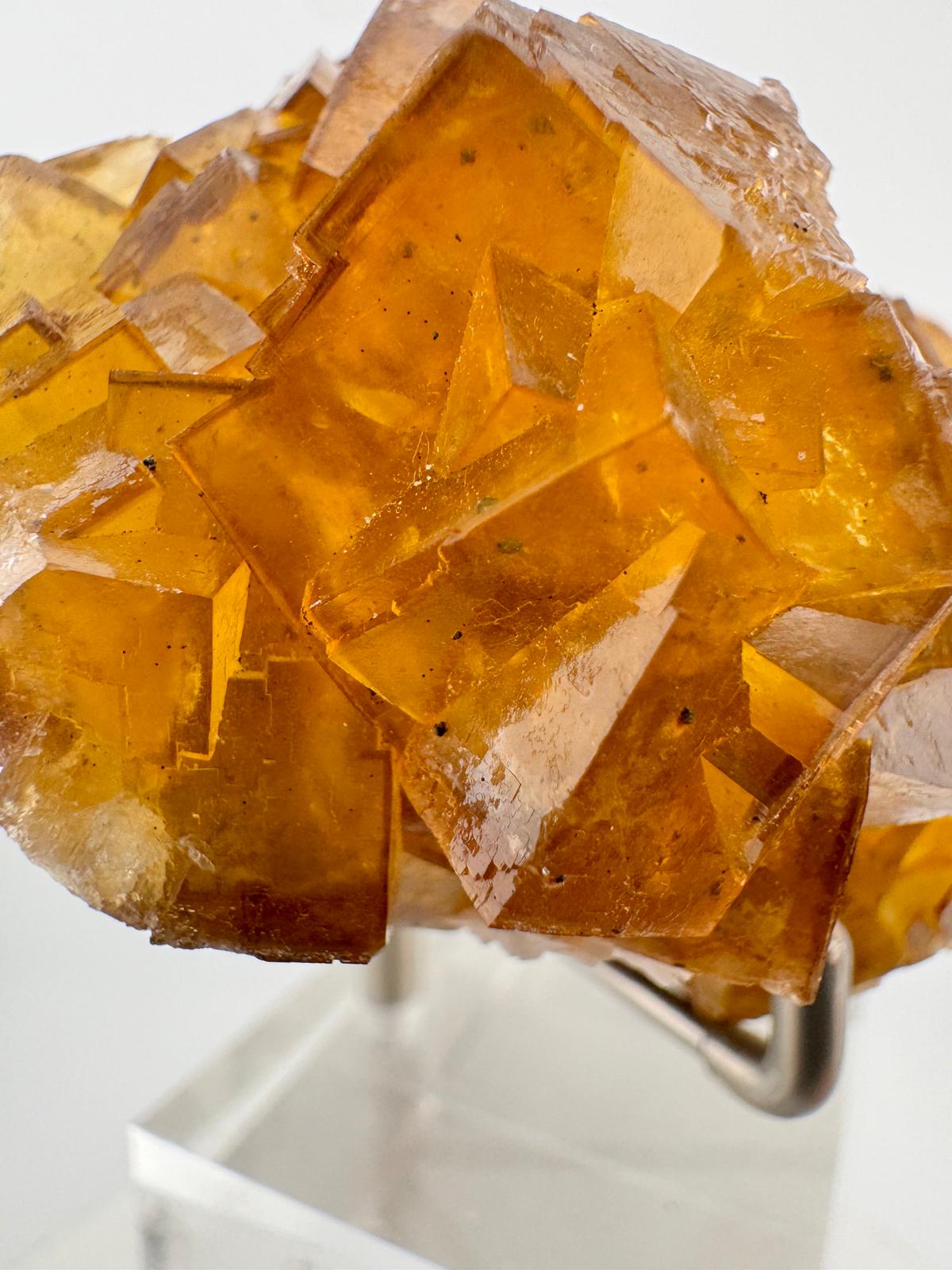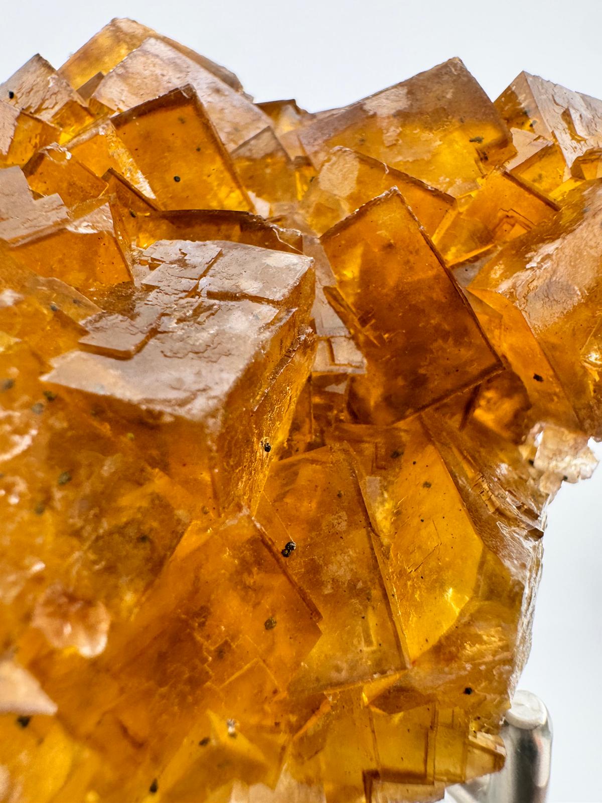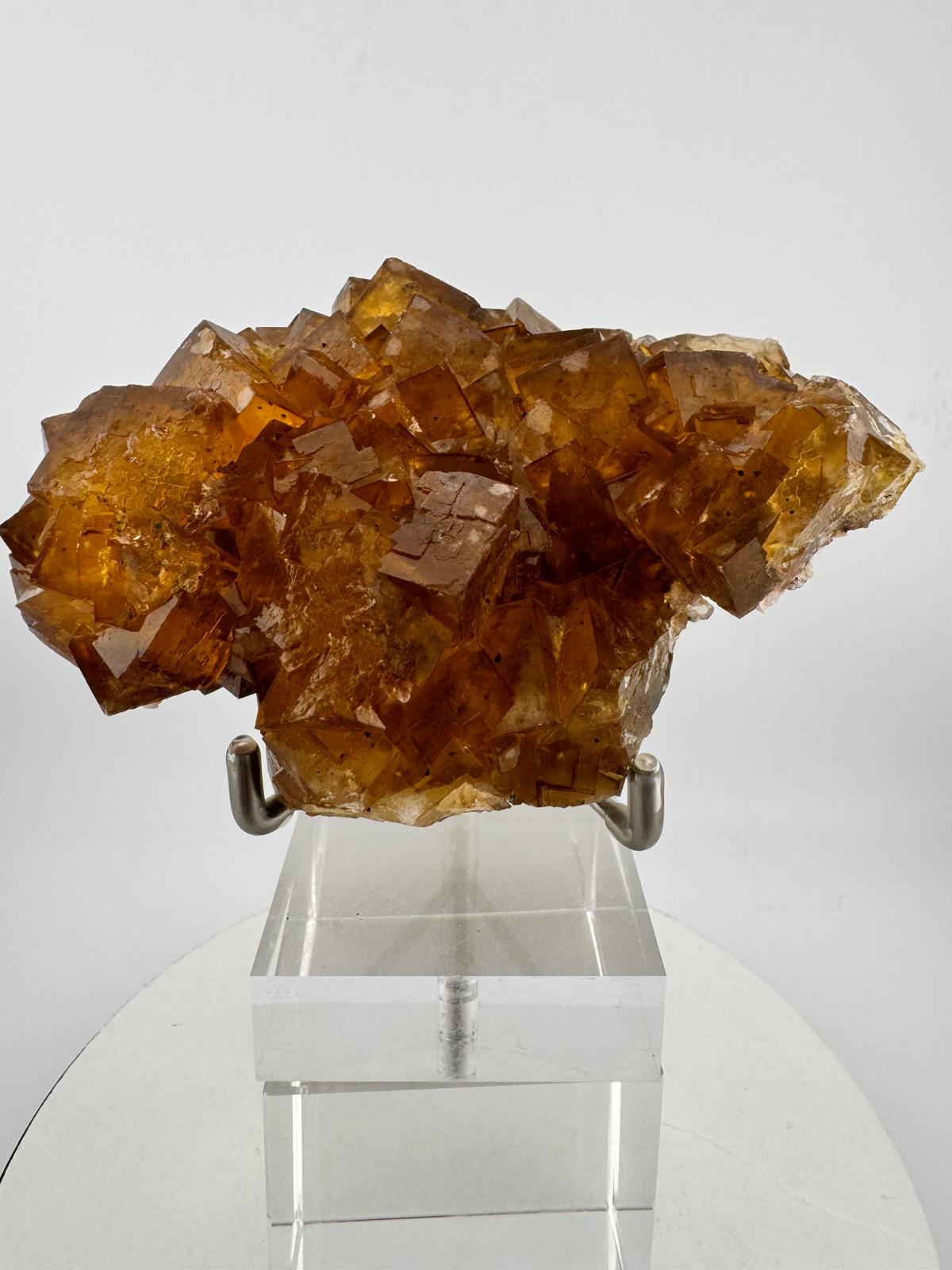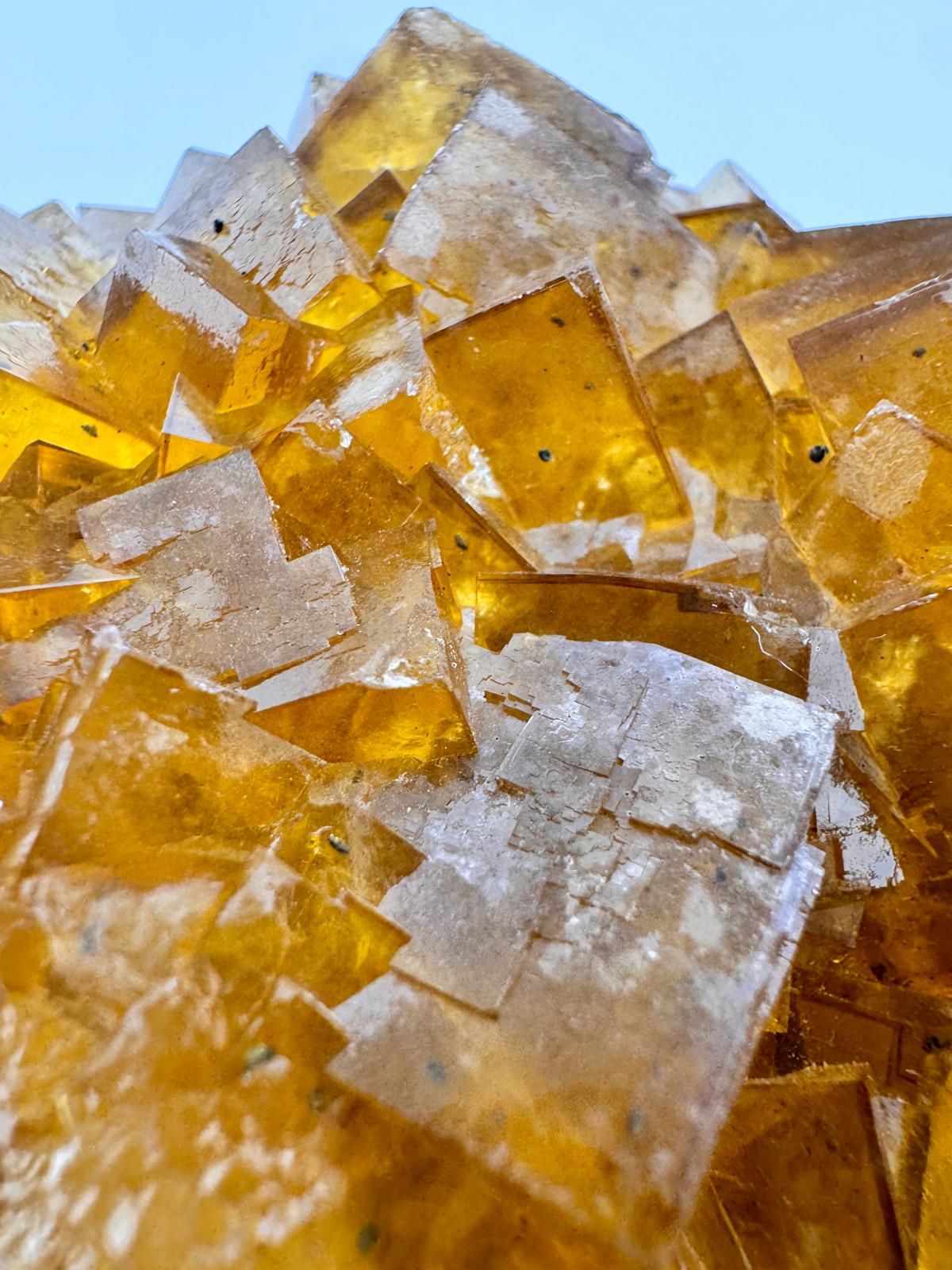 The colour of the Fluorite crystals in this specimen, similar to our earlier acquisitions, are also of a darker honey yellow shade which makes photographing the details of this huge, beautiful specimen difficult but with some illumination, the sheer beauty is unveiled especially when the crystals are highly transparent and lustrous, making this specimen deserving of a spot in the homes of every proud Fluorite collector. It is fluorescent in UV light long waves and on the reverse side of the specimen, aggregates of calcite and dolomite are observed.