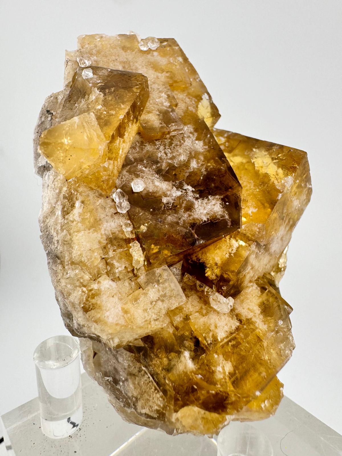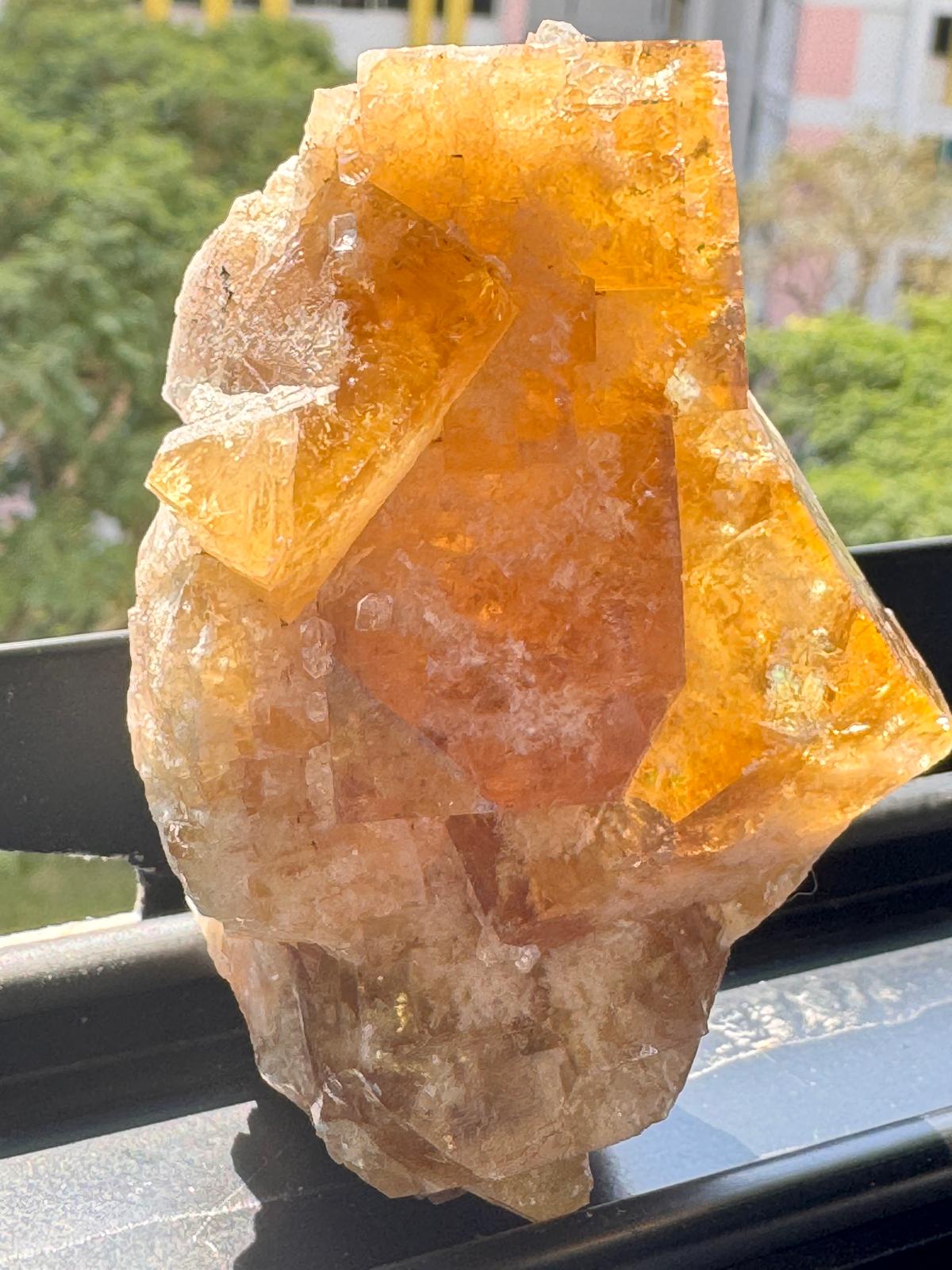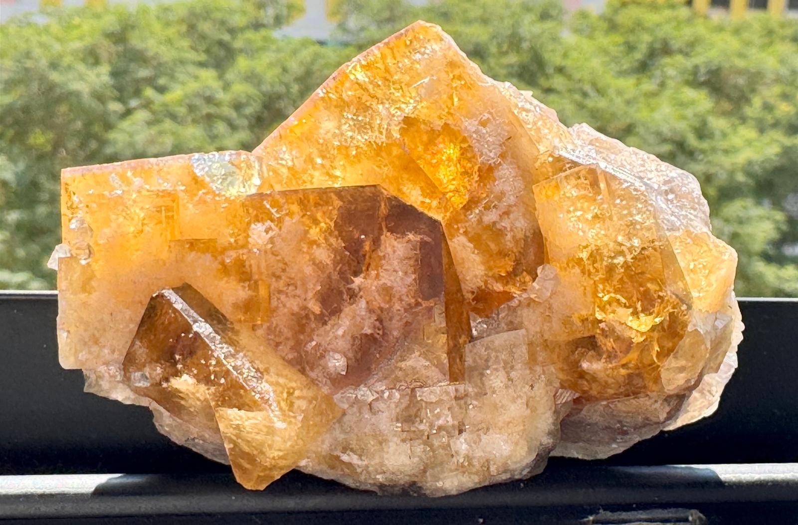 Description: A small cabinet of a a matrix-free group of interconnected cubic terminated yellow-amber fluorite crystals with some white frosting internally. The crystals have great lustre and this is observed in the corner faces of the fluoride crystals. When given some morning sunshine, the entire specimen illuminates with a beautiful golden radiance (last few photos ).