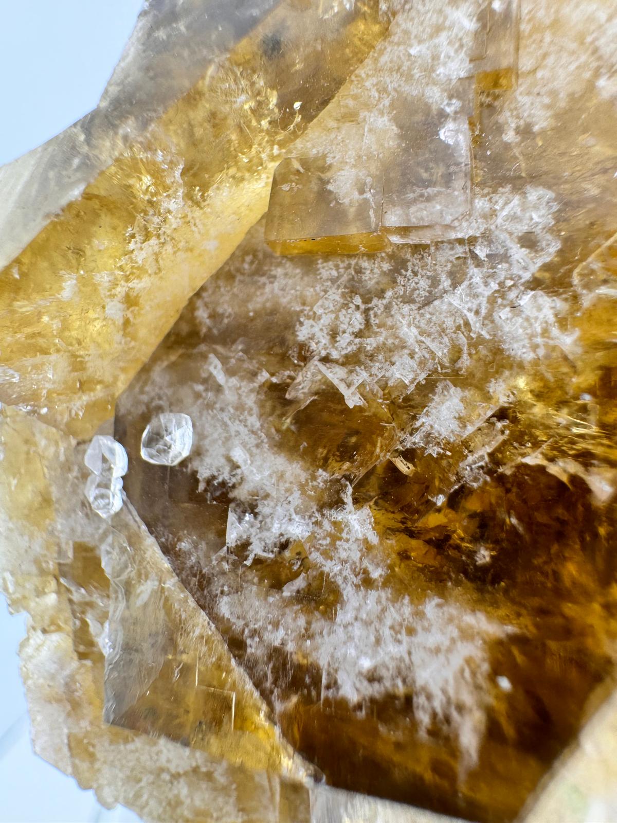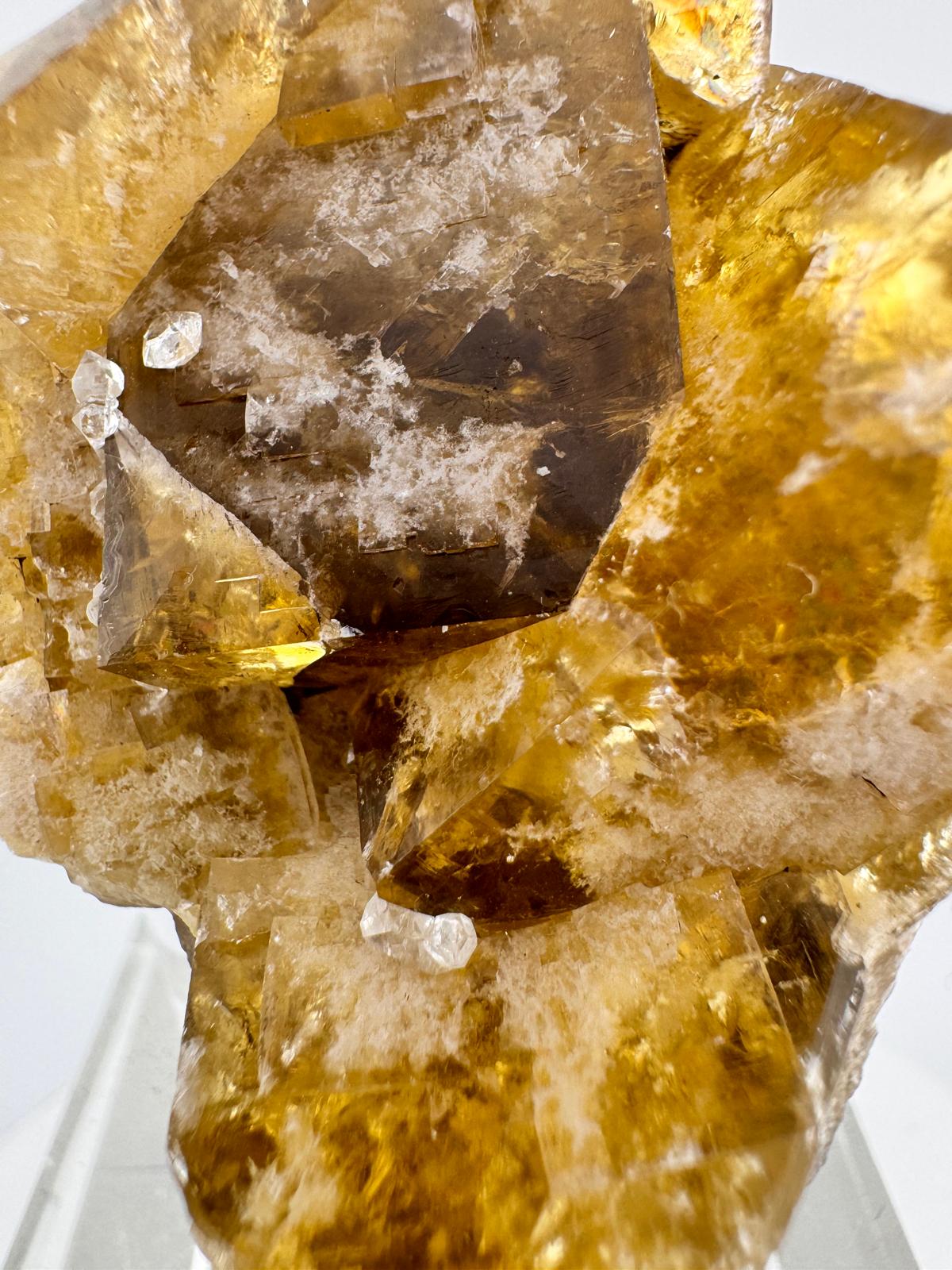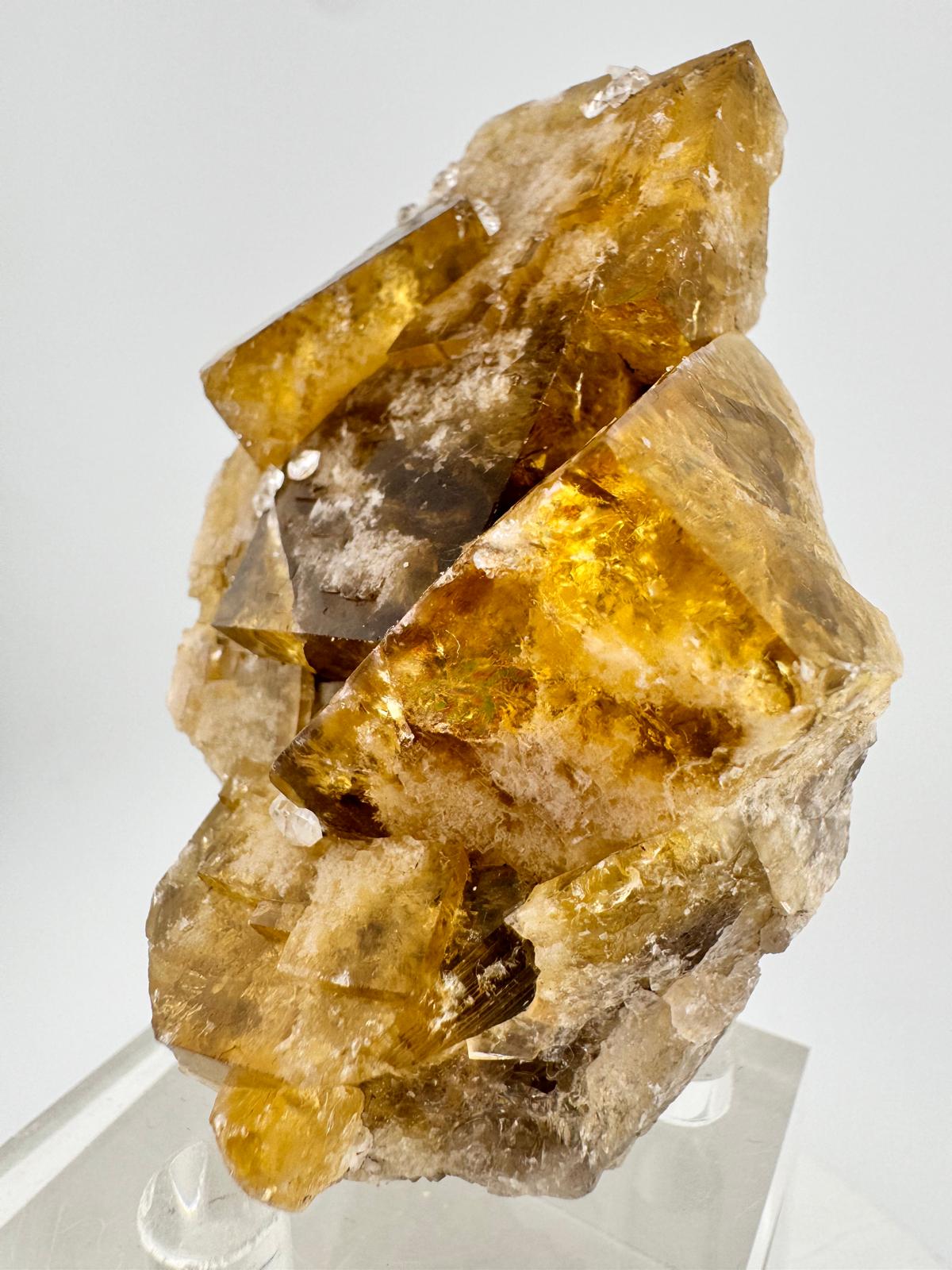 Description: A small cabinet of a a matrix-free group of interconnected cubic terminated yellow-amber fluorite crystals with some white frosting internally. The crystals have great lustre and this is observed in the corner faces of the fluoride crystals. When given some morning sunshine, the entire specimen illuminates with a beautiful golden radiance (last few photos ).
