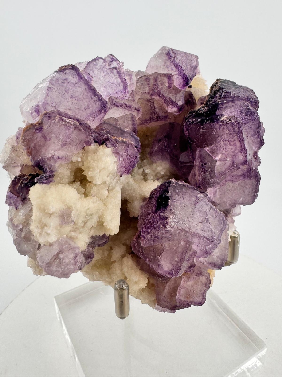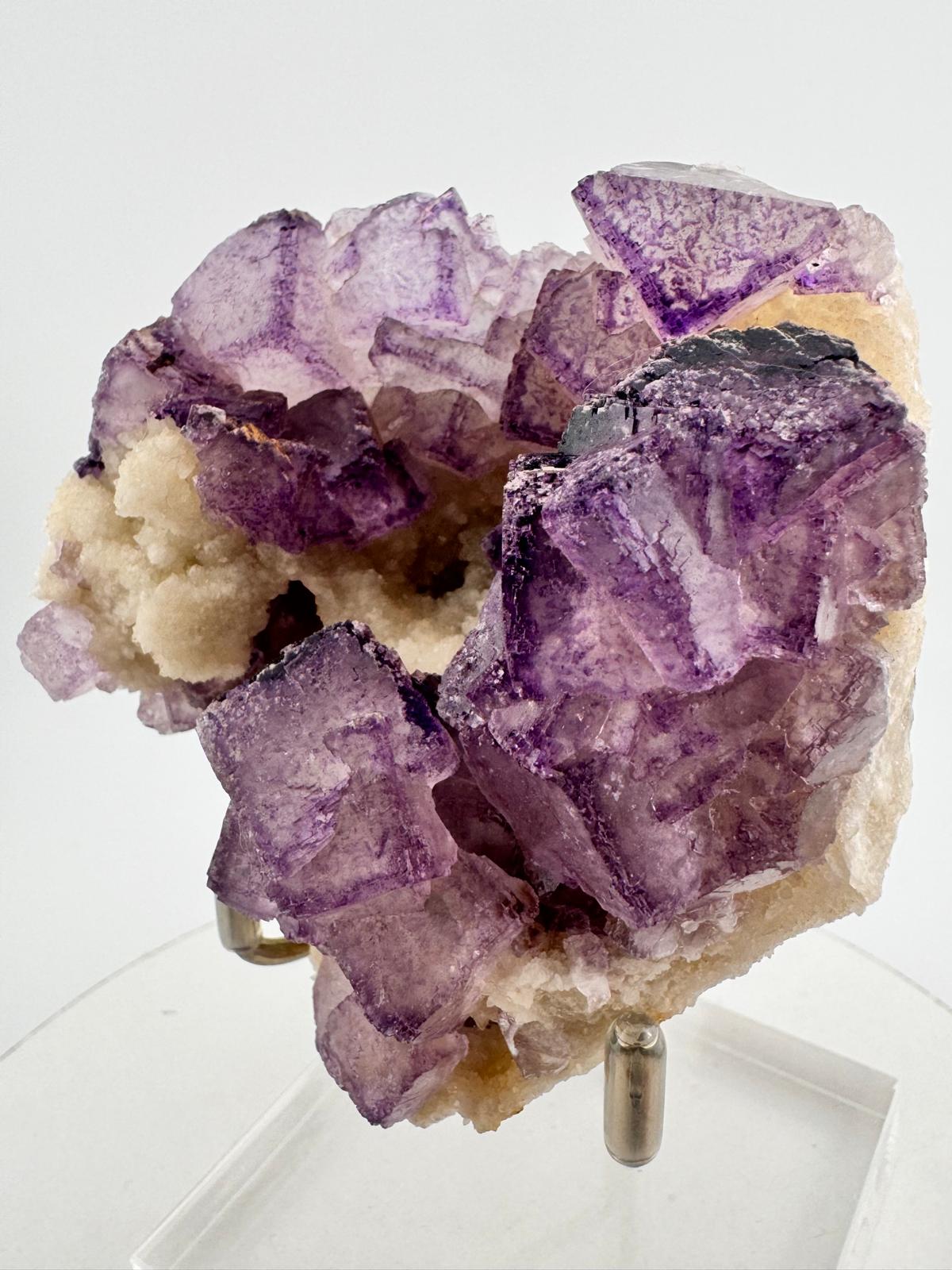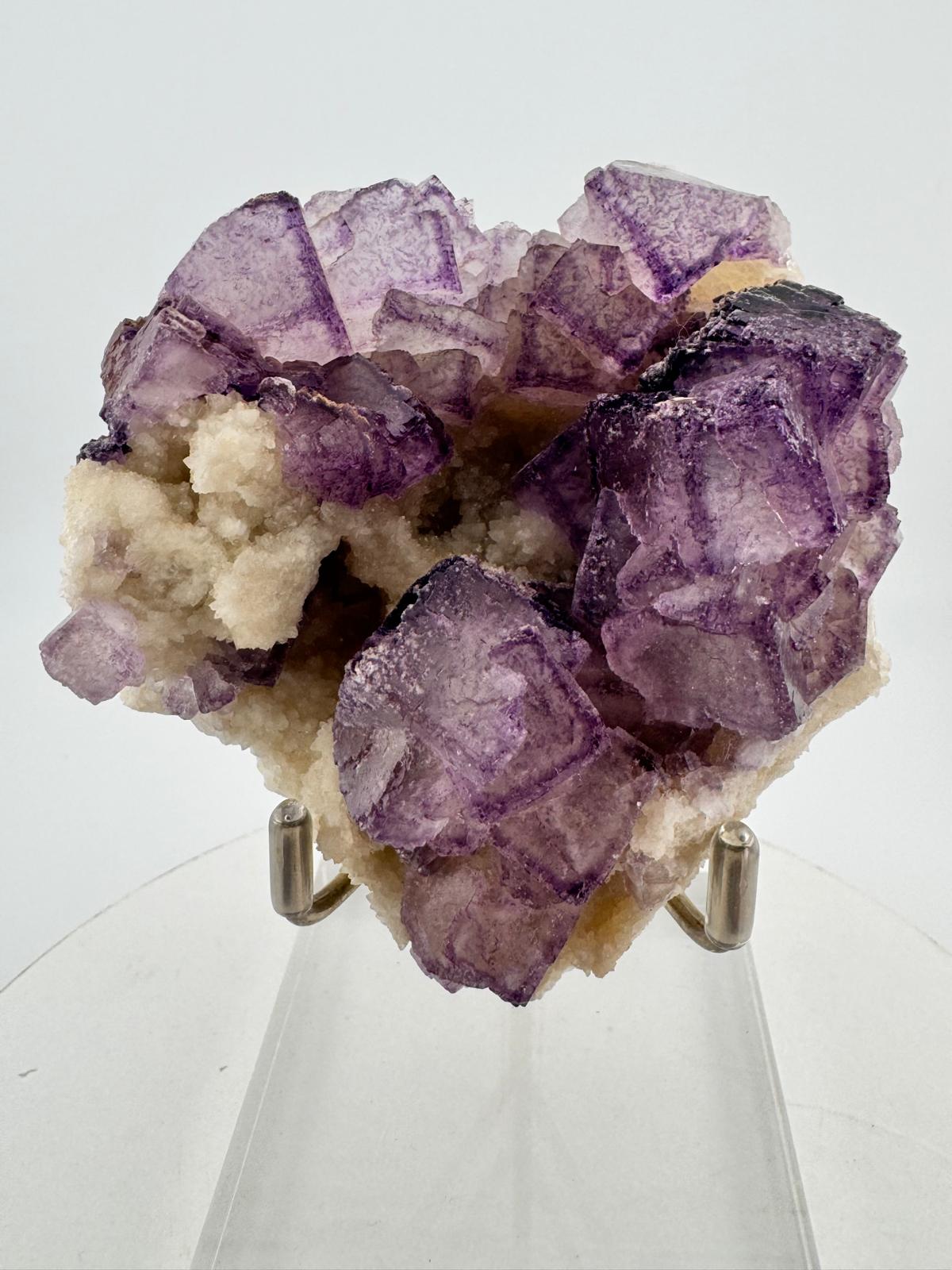 Description: A spectacular cluster of purple fluorite cubes from the famous Qinglong Mine, China that is known for producing different beautiful mineral specimens and emerging amongst them in the early 2019 were beautiful purple fluorites with distinctive purple edges and otherwise affectionately termed by the locals to be ‘QR Code Fluorites’. Featured here, the beautiful cluster of purple fluorite cubes are translucent with their distinctive purple edge contrast with the surfaces of different beautiful purple accents.