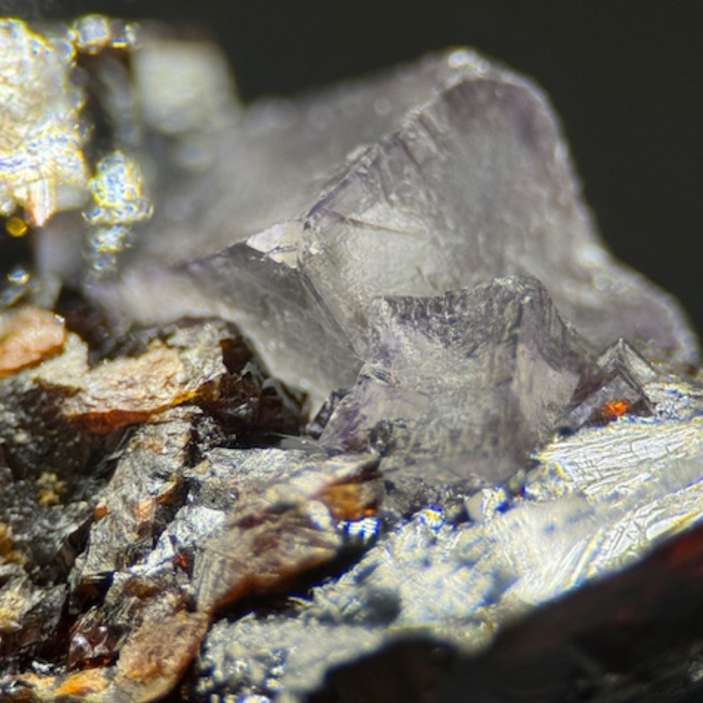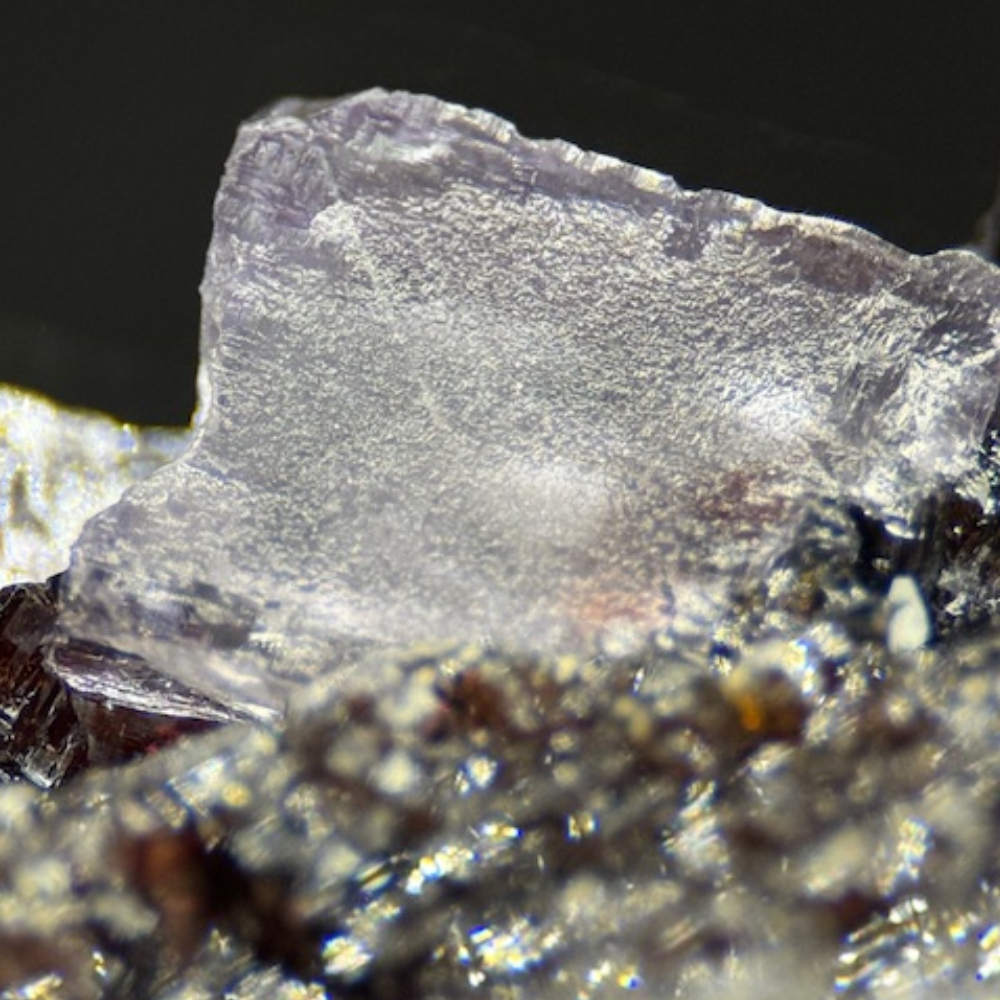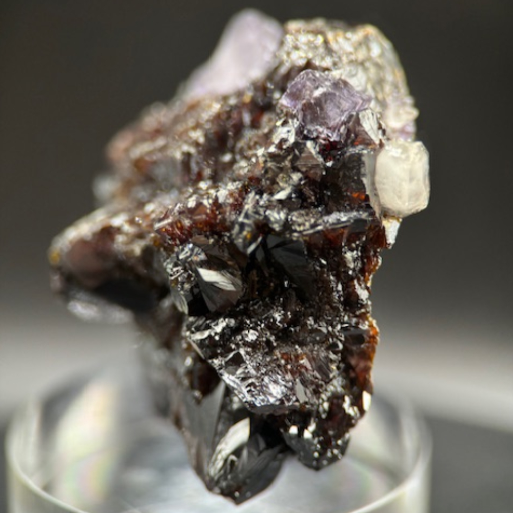 Description: A spectacular show of a glassy, gemmy purple fluorite that is dramatically set on a background of black lustrous crystallized sphalerite.
