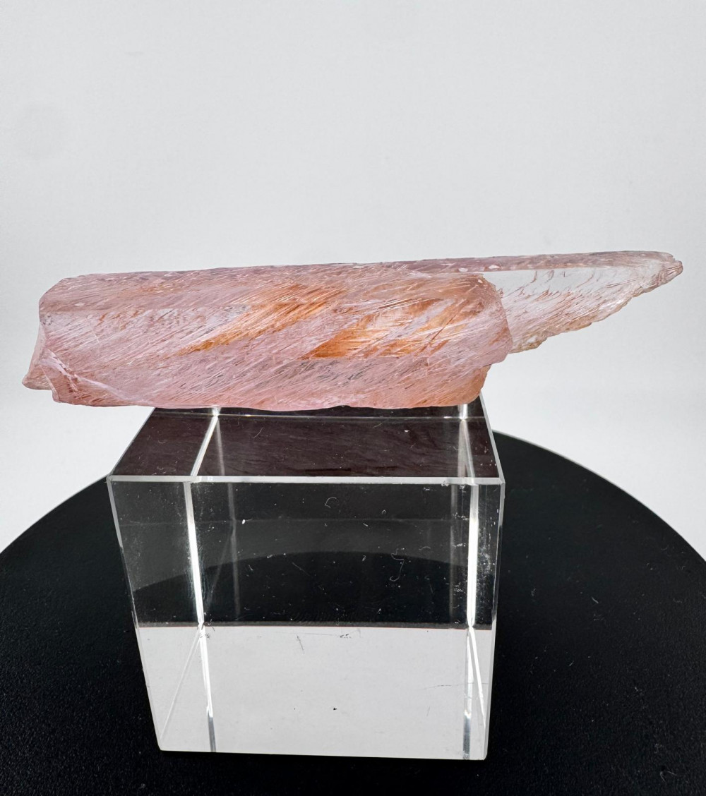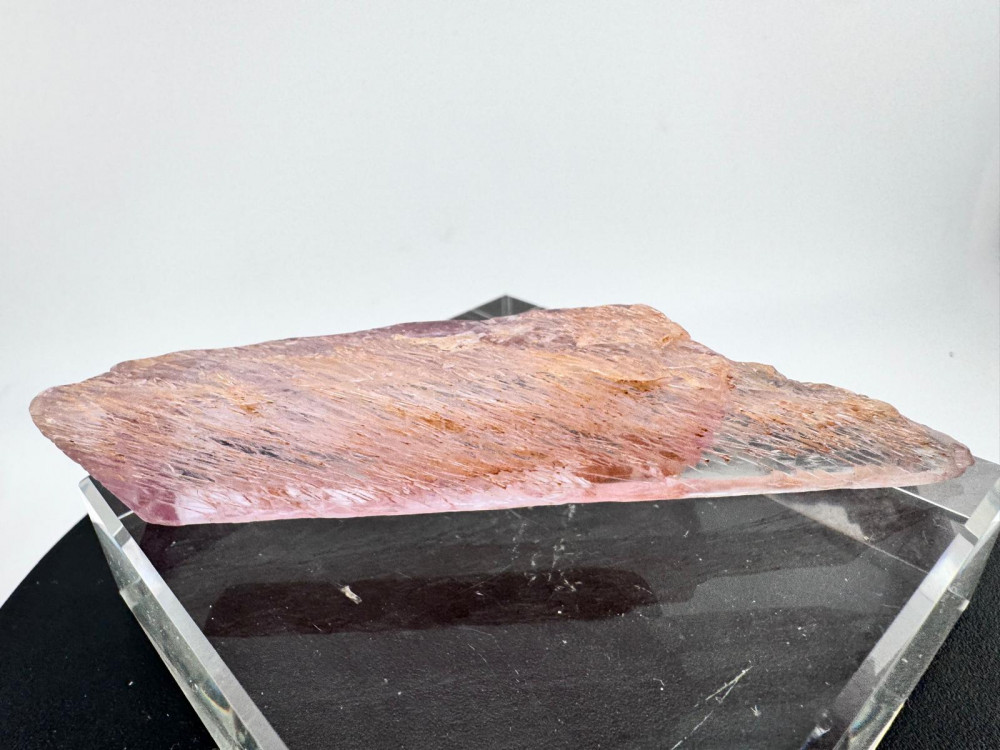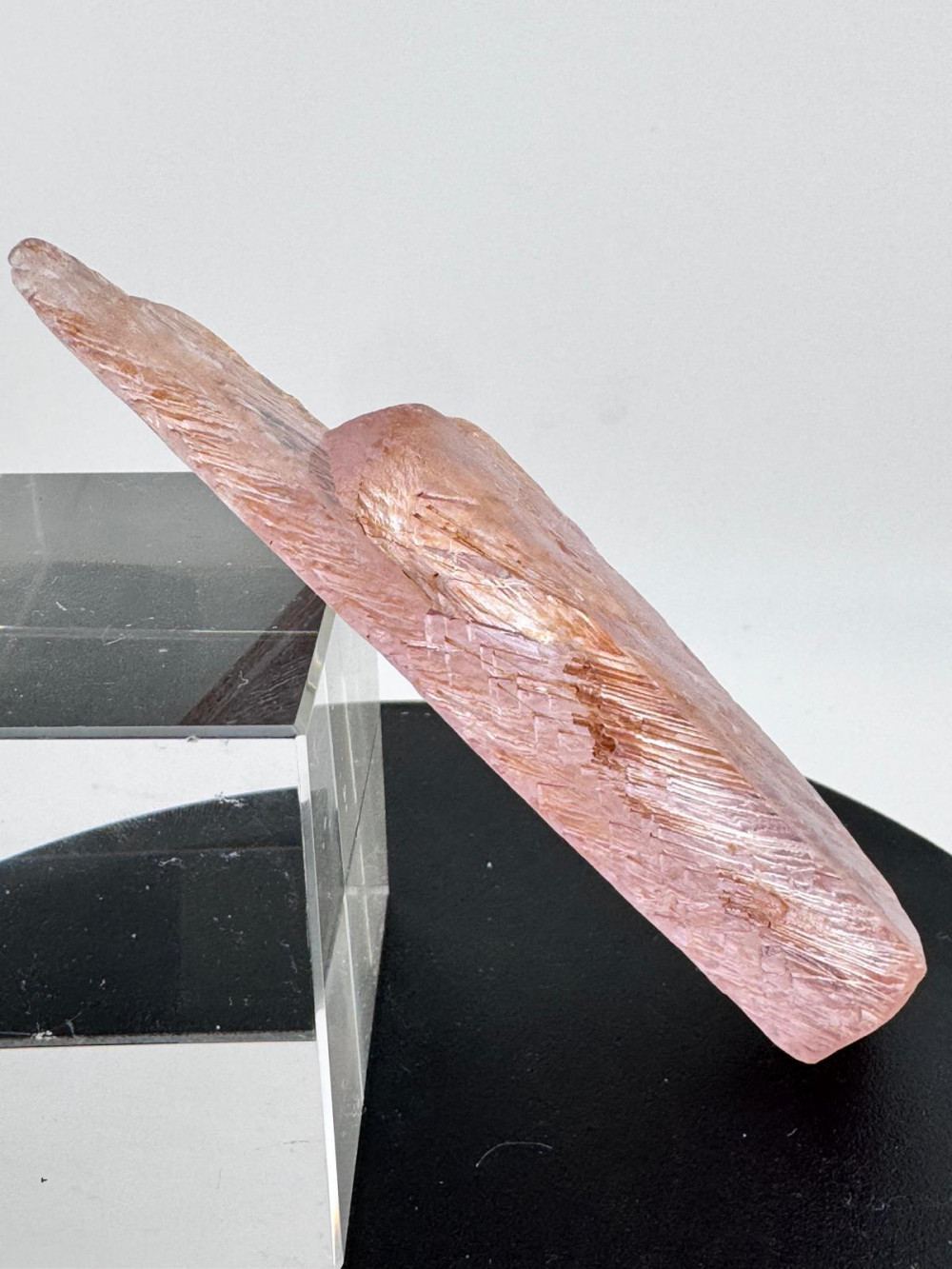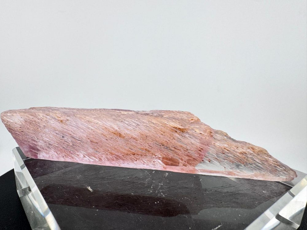 Description: This exquisite pink Kunzite specimen measuring more than 10cm originates from the Nuristan District in Nuristan Province, Afghanistan – a locality that is renowned for its rich mineral deposits and stunning crystals, including Spodumene known for its pink variety, Kunzite, highly prized for its colour and clarity. Besides exhibiting a delicate pink hue due to traces of manganese within its crystal structure, this Kunzite boasts good transparency, allowing light to pass through its crystal lattice with clarity which also gives the illusion of the crystal emitting light from within its crystal structure. It is double-terminated , a featured mineral collectors look out for due to the aesthetic appeal. Due to natural weather processes, the etching that is observed all around gives this specimen a unique character with very interesting patterns both to the eyes and texture to the feel , and above all enhances its natural beauty.