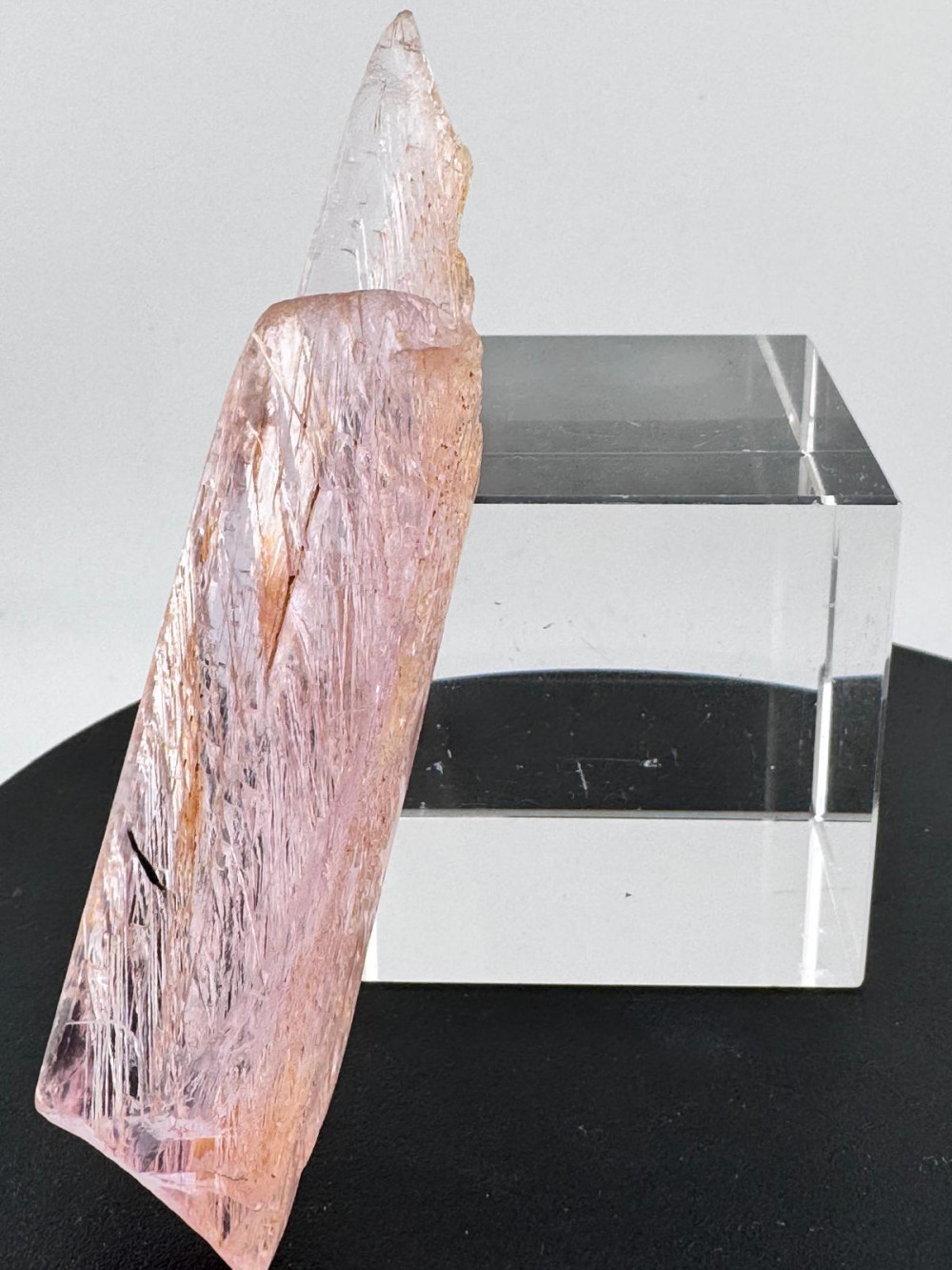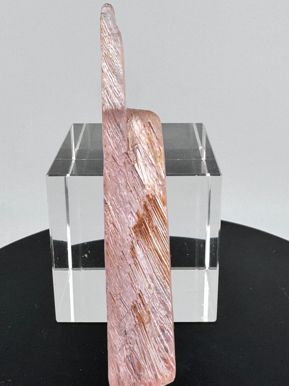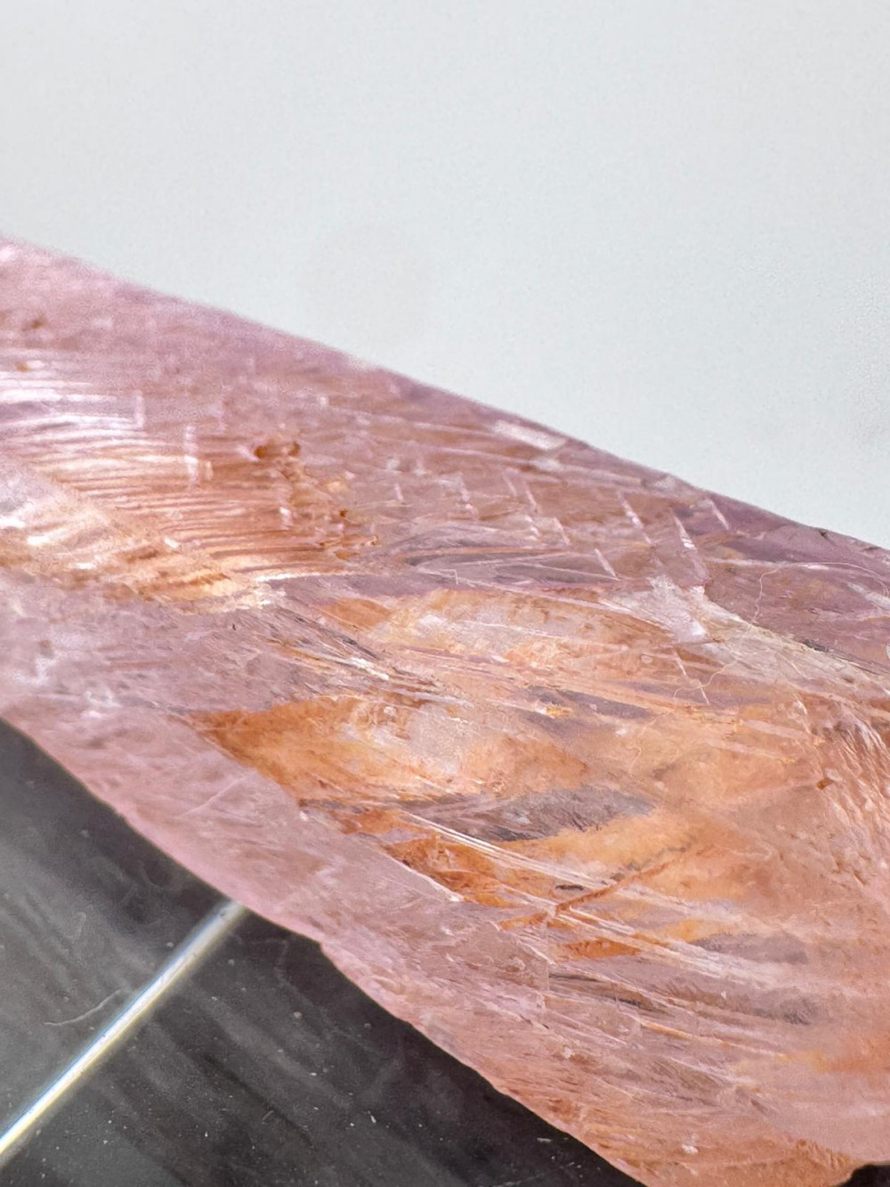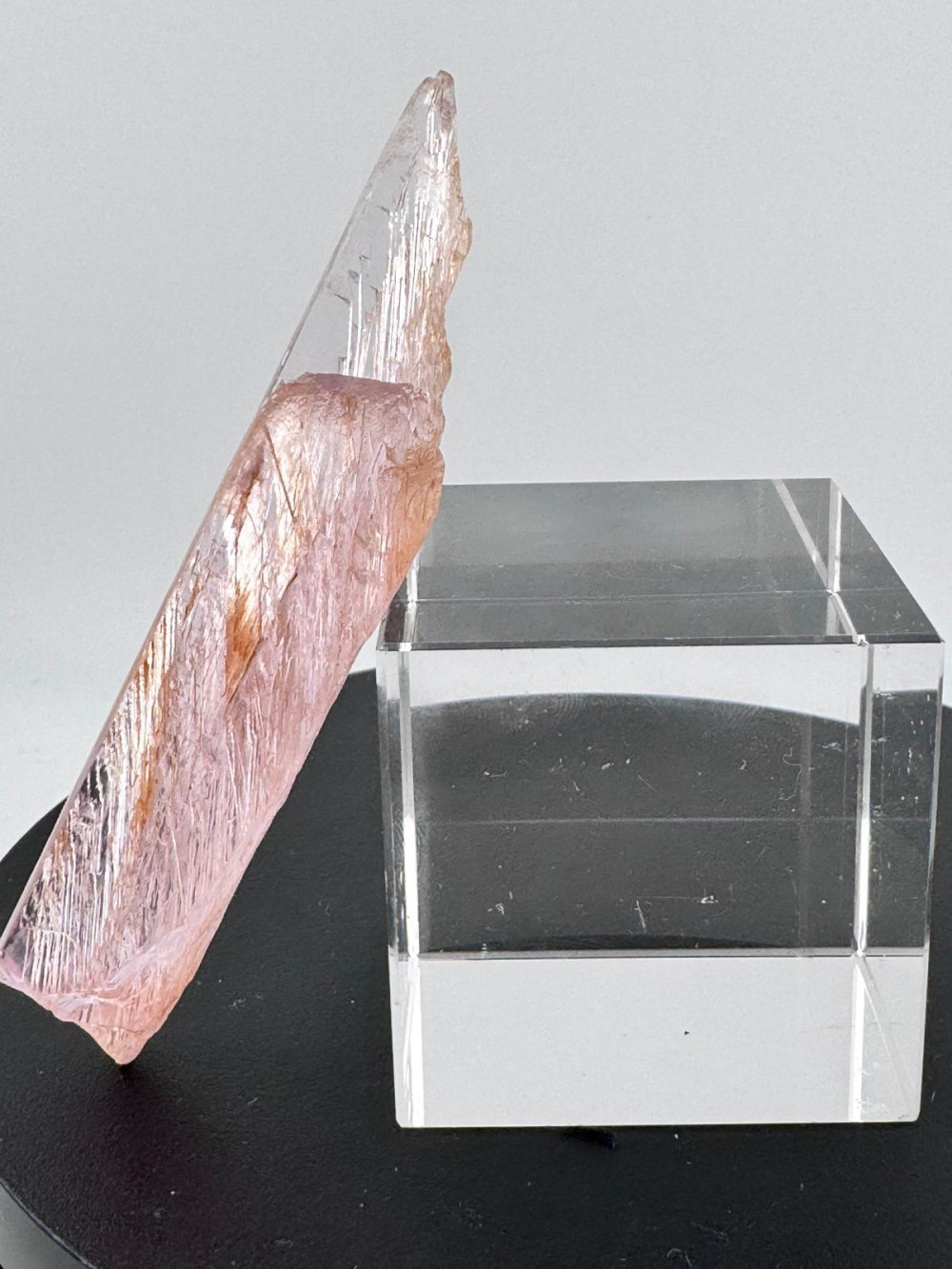 Description: This exquisite pink Kunzite specimen measuring more than 10cm originates from the Nuristan District in Nuristan Province, Afghanistan – a locality that is renowned for its rich mineral deposits and stunning crystals, including Spodumene known for its pink variety, Kunzite, highly prized for its colour and clarity. Besides exhibiting a delicate pink hue due to traces of manganese within its crystal structure, this Kunzite boasts good transparency, allowing light to pass through its crystal lattice with clarity which also gives the illusion of the crystal emitting light from within its crystal structure. It is double-terminated , a featured mineral collectors look out for due to the aesthetic appeal. Due to natural weather processes, the etching that is observed all around gives this specimen a unique character with very interesting patterns both to the eyes and texture to the feel , and above all enhances its natural beauty.
