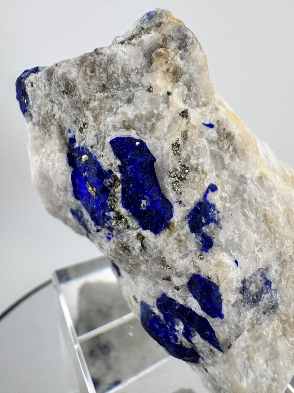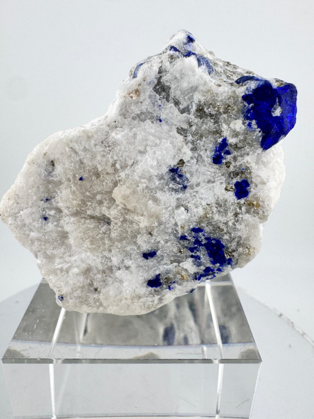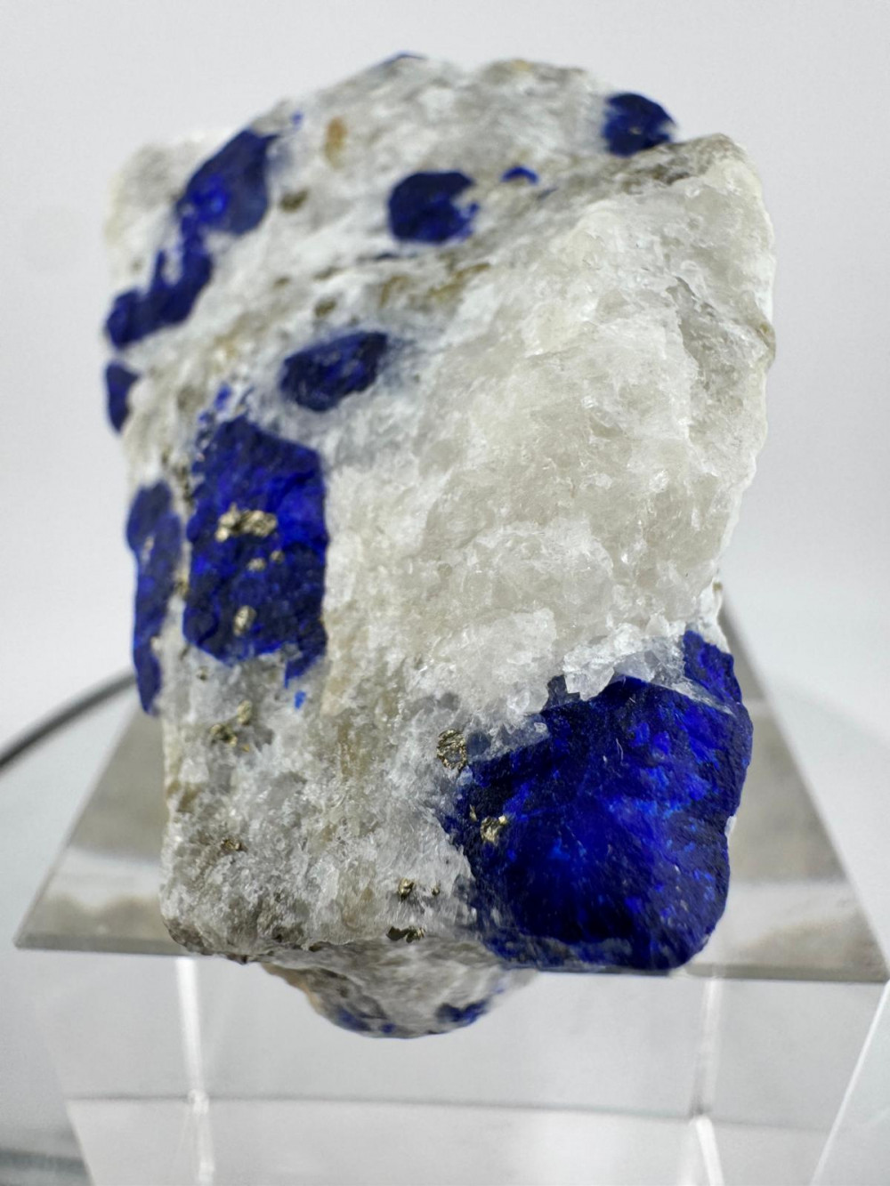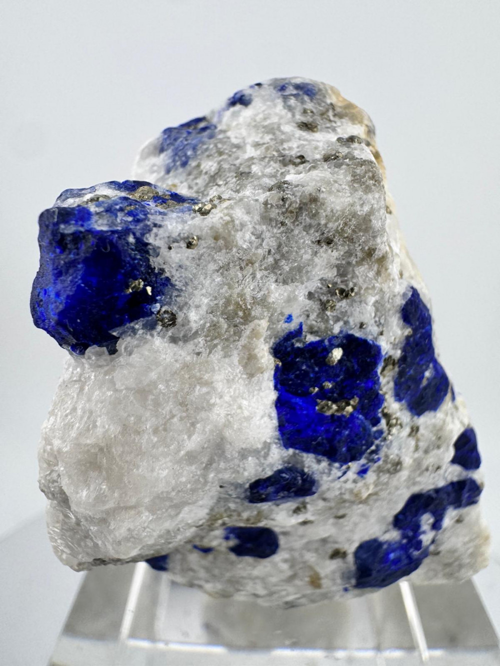 Description: This stunning specimen features beautiful deep blue lazurite crystals that are beautifully scattered across a a pale white quartz matrix. One distinctive lazurite crystal sits prominently exposed at the top with great striking visual appeal. The front of the piece is adorned with sprinkles of golden, lustrous pyrite, creating a captivating contrast against the blue lazurite crystals and white matrix. The combination of colours and textures makes this specimen a truly unique and visually striking piece.