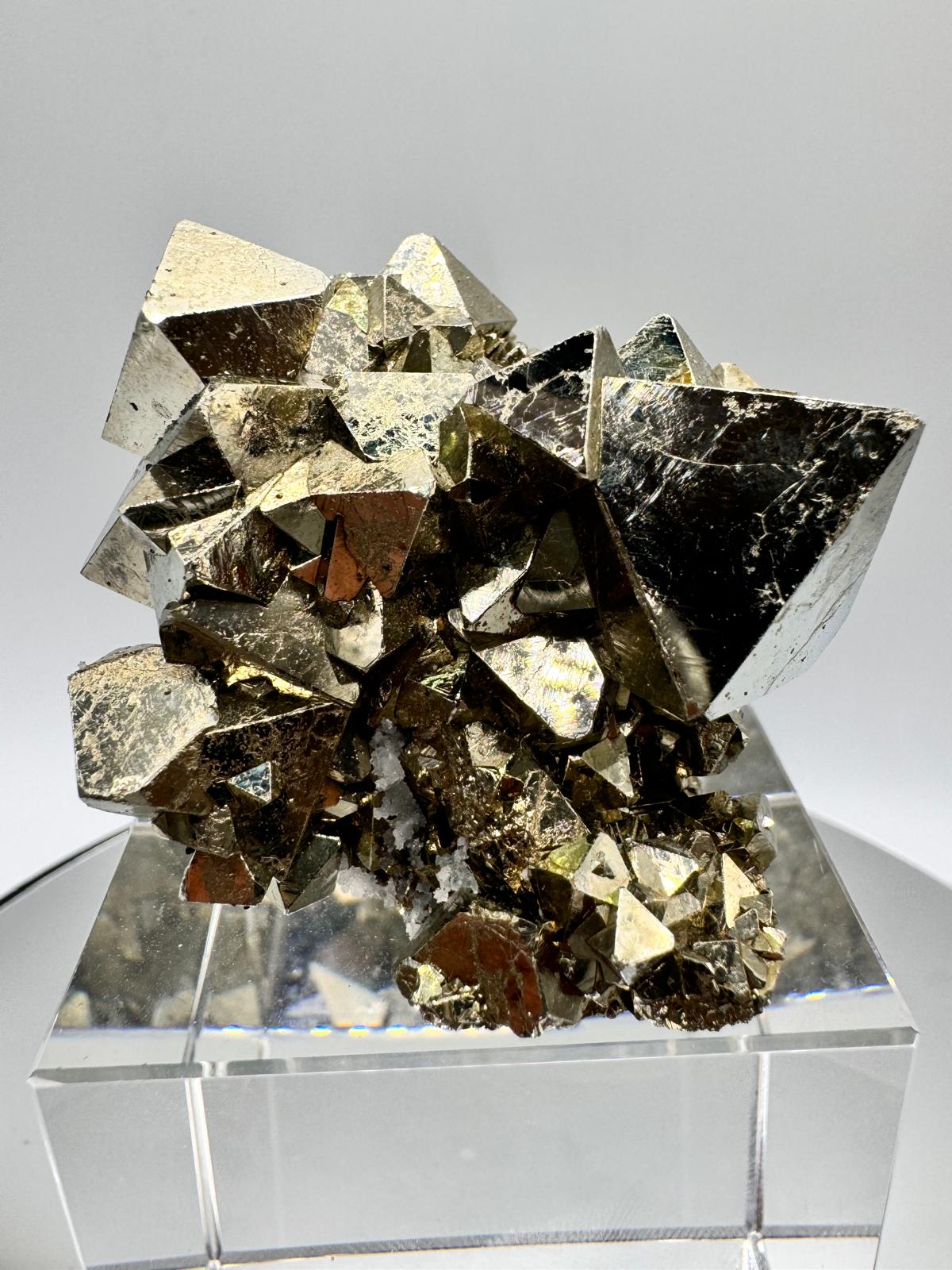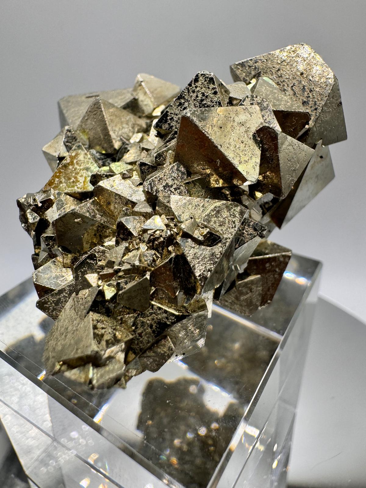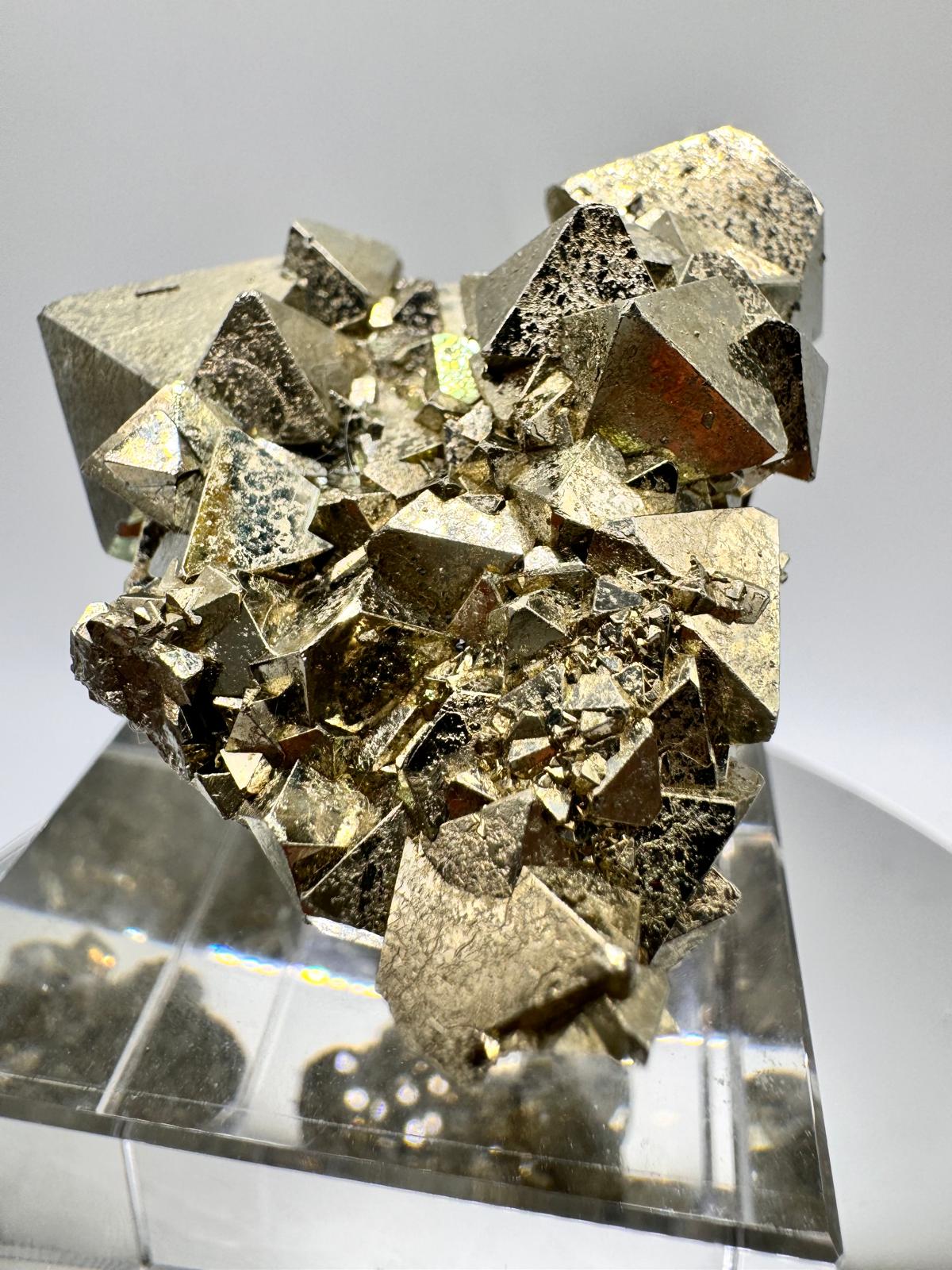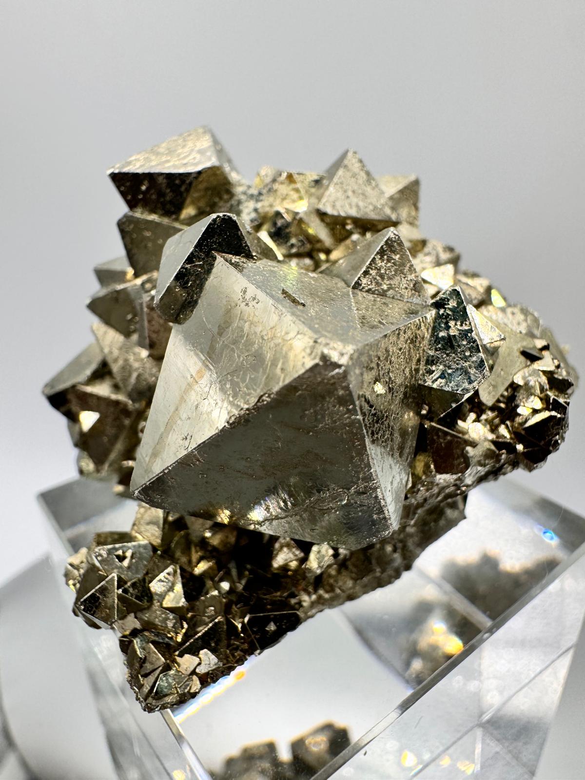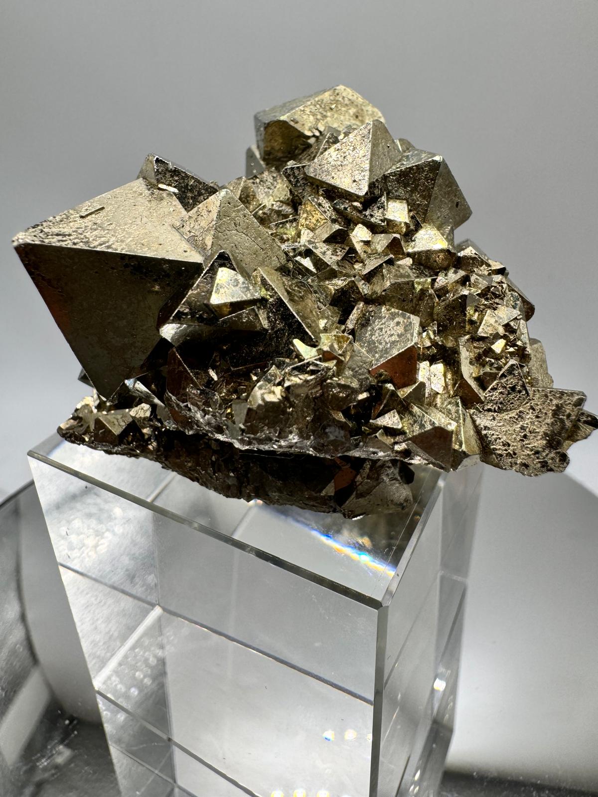 Description: From Huanzala Mine, famous for producing some of the world's finest Pyrites, is this cluster of lustrous golden, octahedral pyrite crystals..