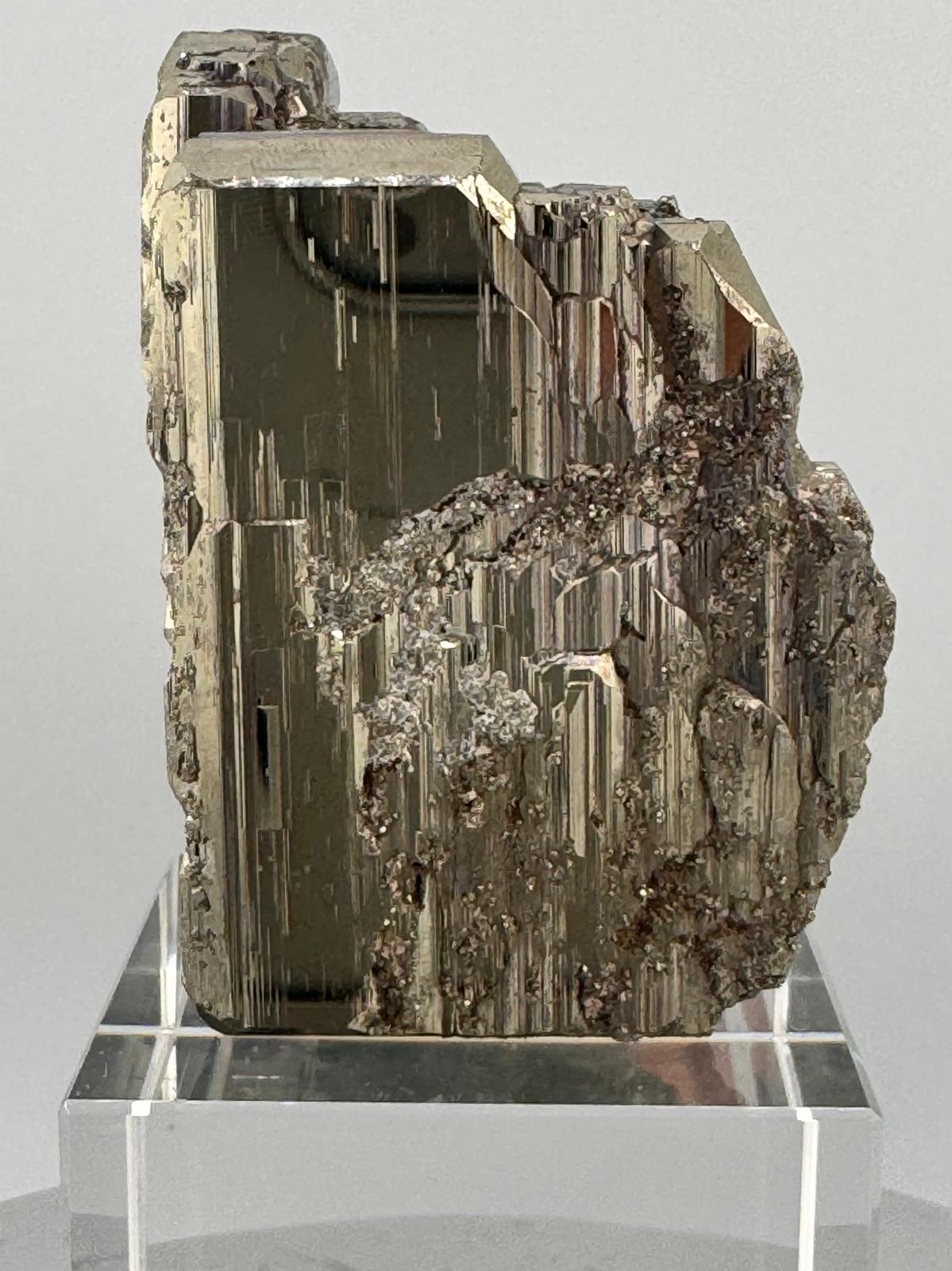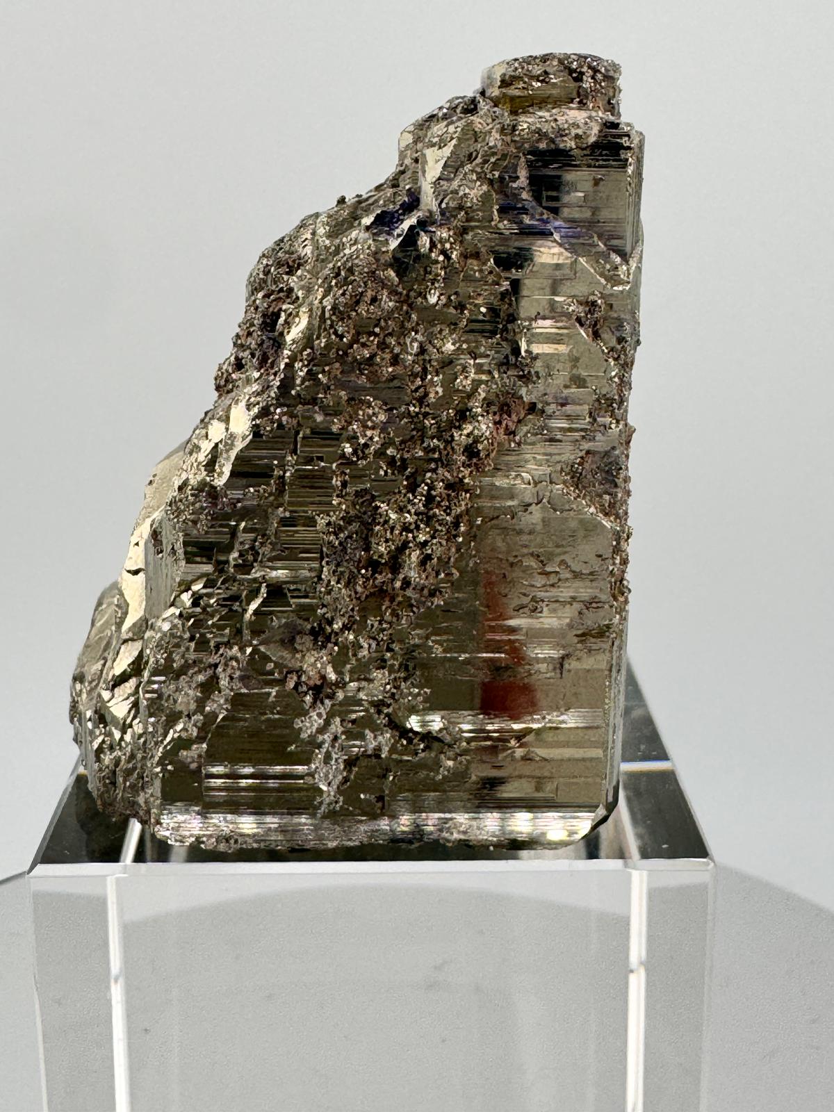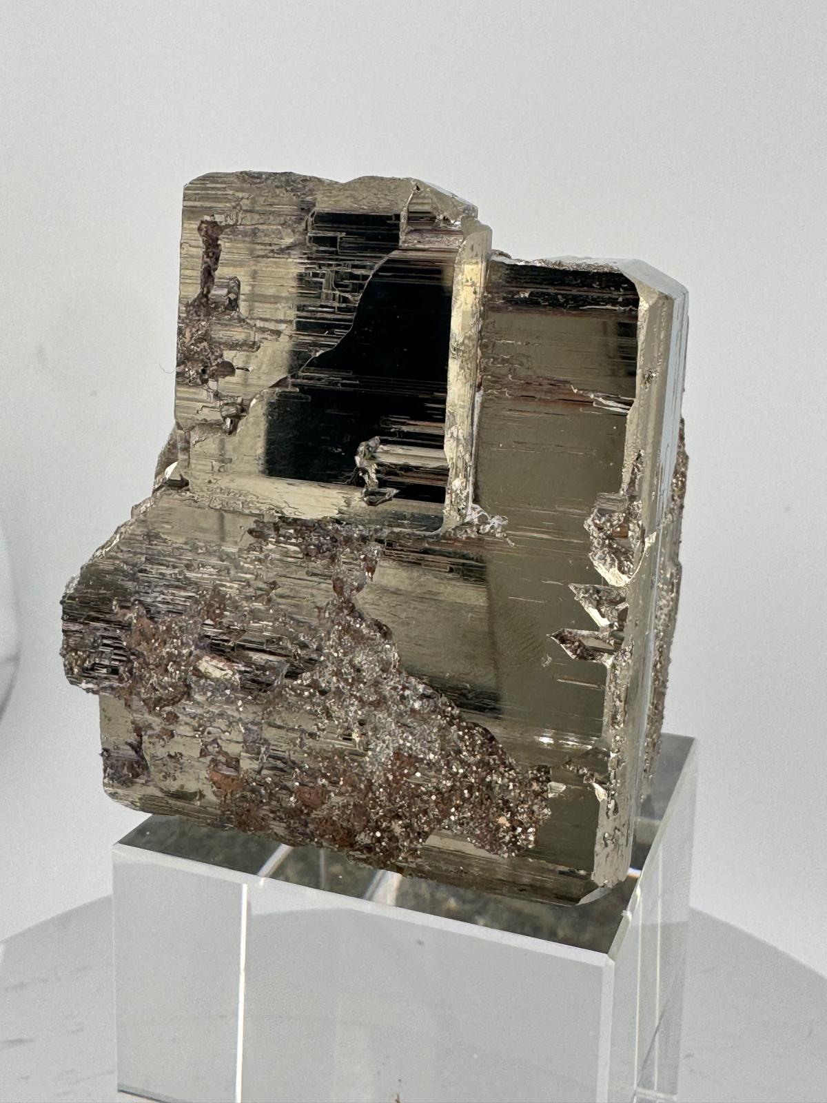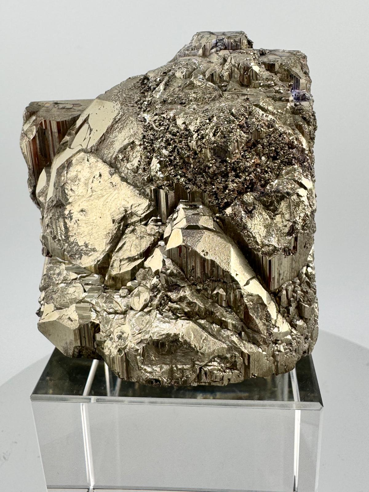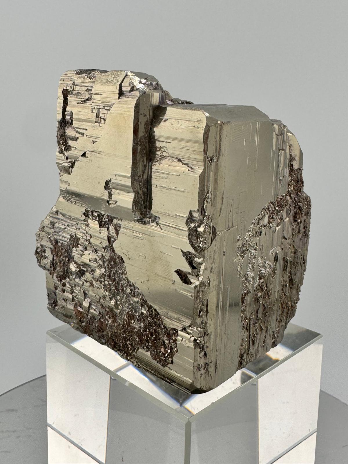 Description: Presenting a single, large Pyrite from a classic US locality and where its extremely bright lustre is comparable to its famous cousins in the renowned Navajún, Spain or Huanzala Mine of Peru. It is in excellent condition with parallel striated faces and some smaller recrystallization on the surfaces.