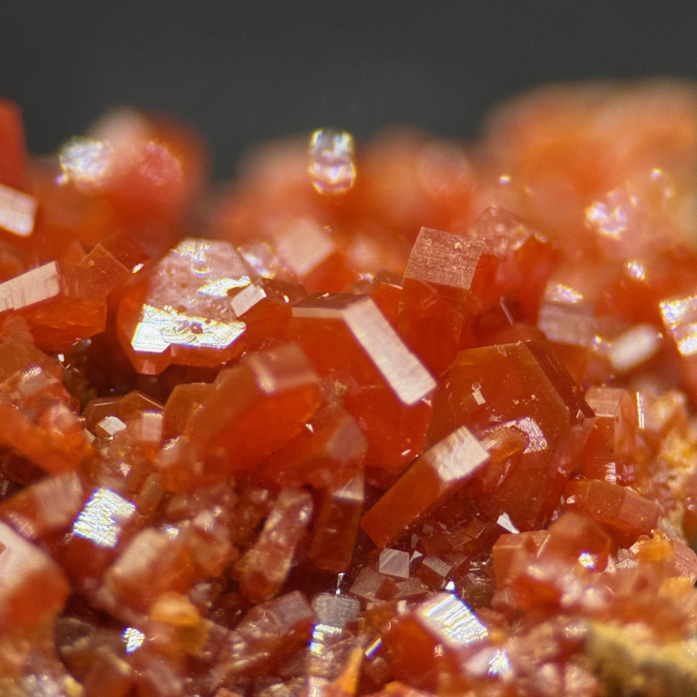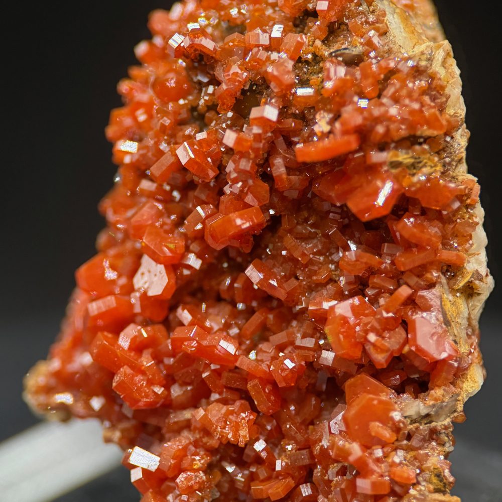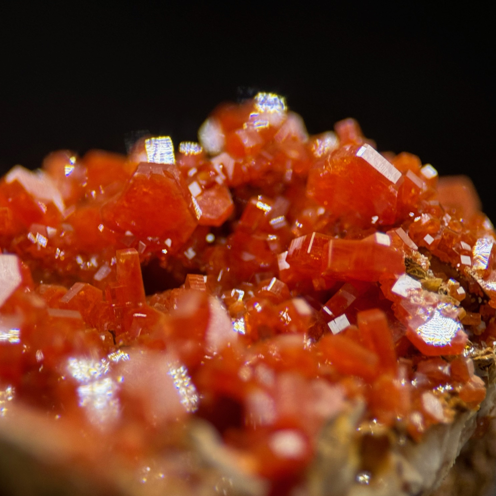 Description: Vanadinite forms prismatic crystals in shades of red, orange, and brown. These crystals are often found in oxidized parts of lead deposits in locations such as Morocco, Mexico, and the U.S.A. These beautiful, shiny red Vanadinite Crystals are direct from a famous locality in Morocco for producing some of the world's most sought-after Vanadinite crystals.