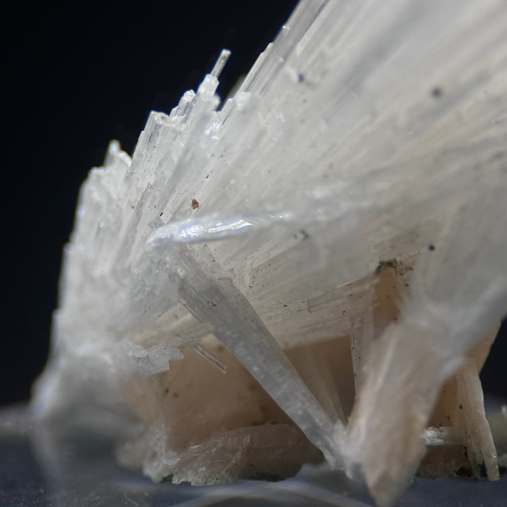 Description: Scolecite is a white hydrated calcium silicate mineral that tends to grow in a striking needle spray formation, giving it a stunning aesthetic visual like this specimen presented here.