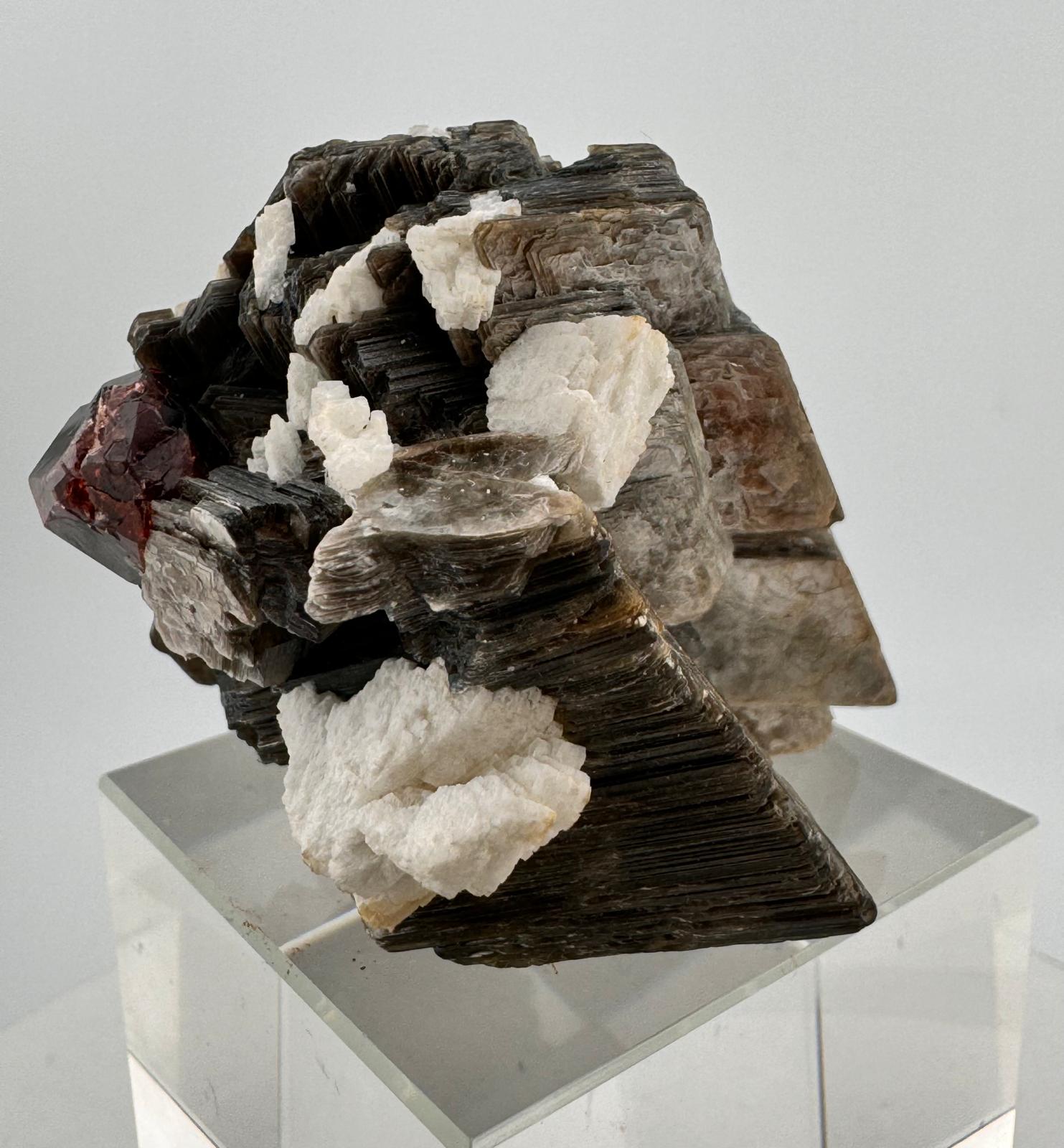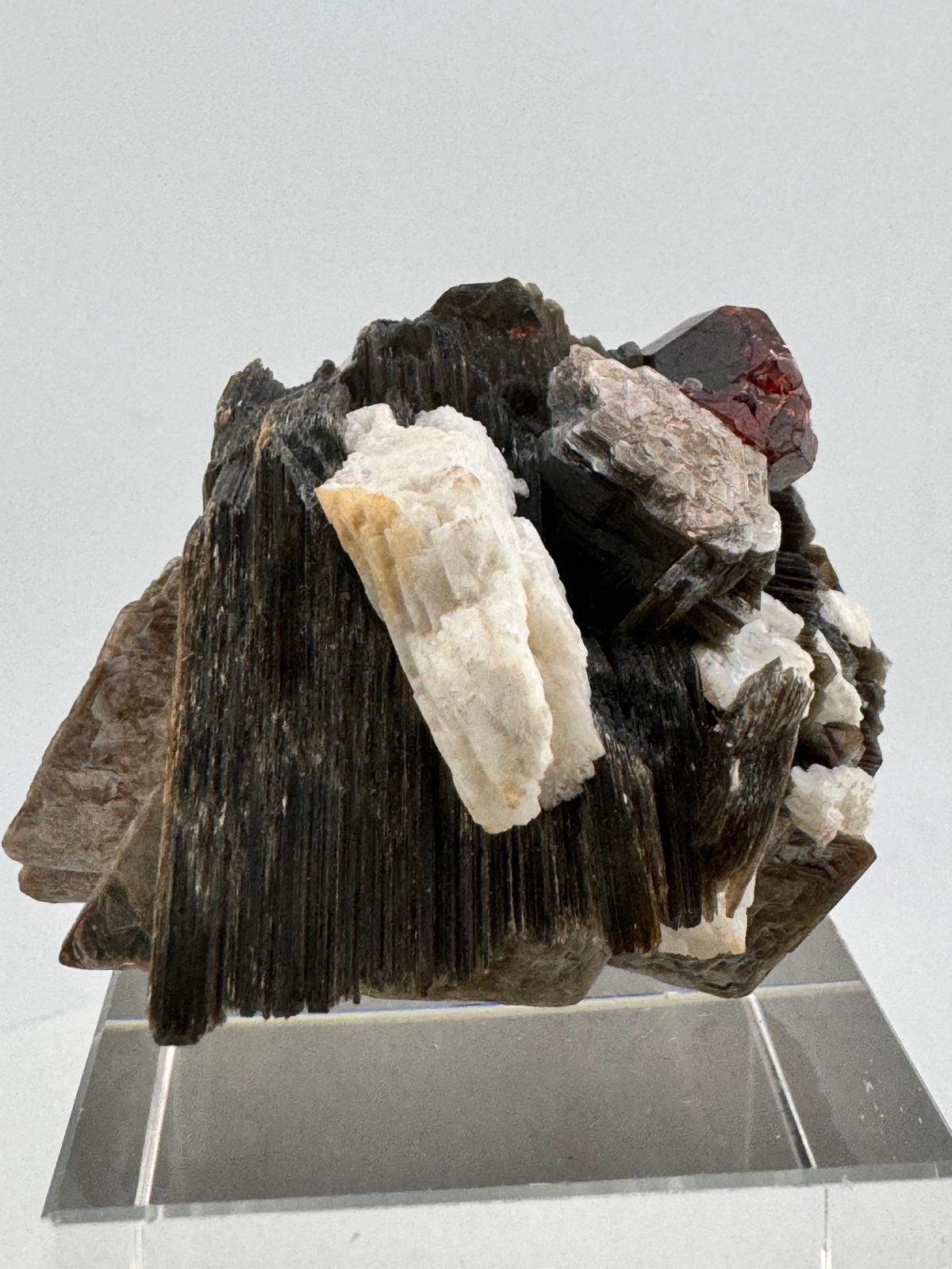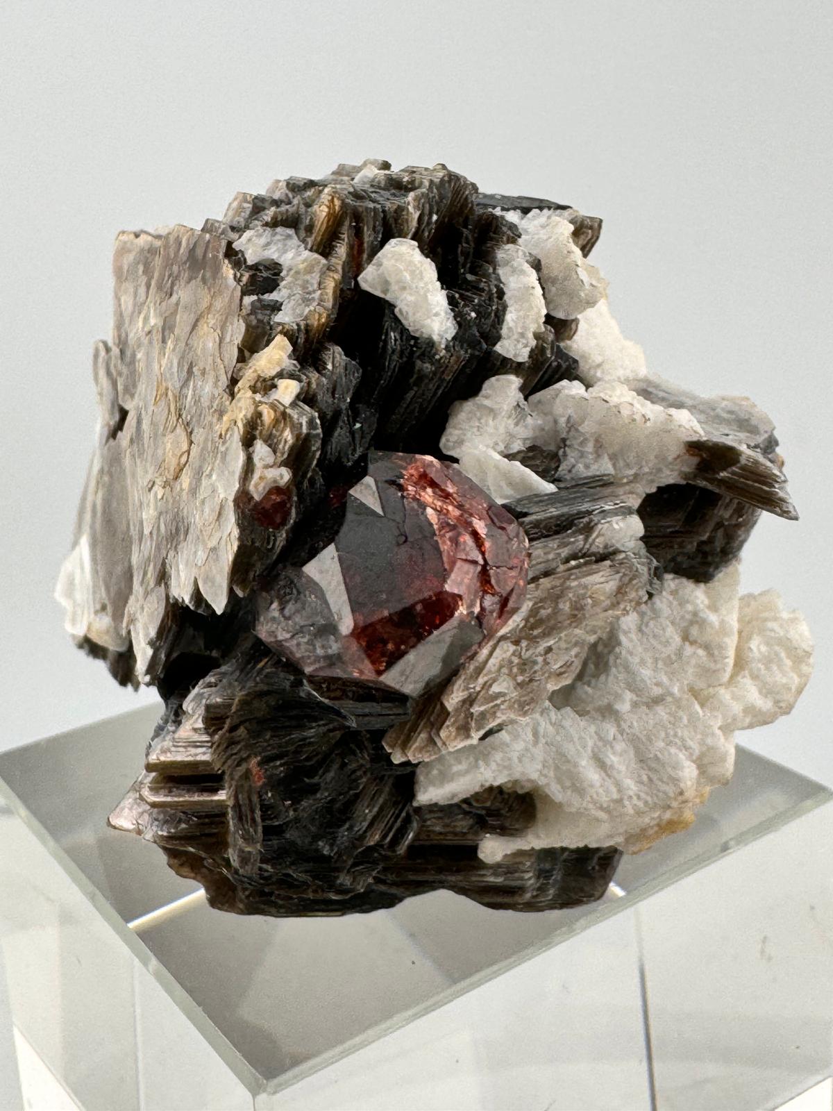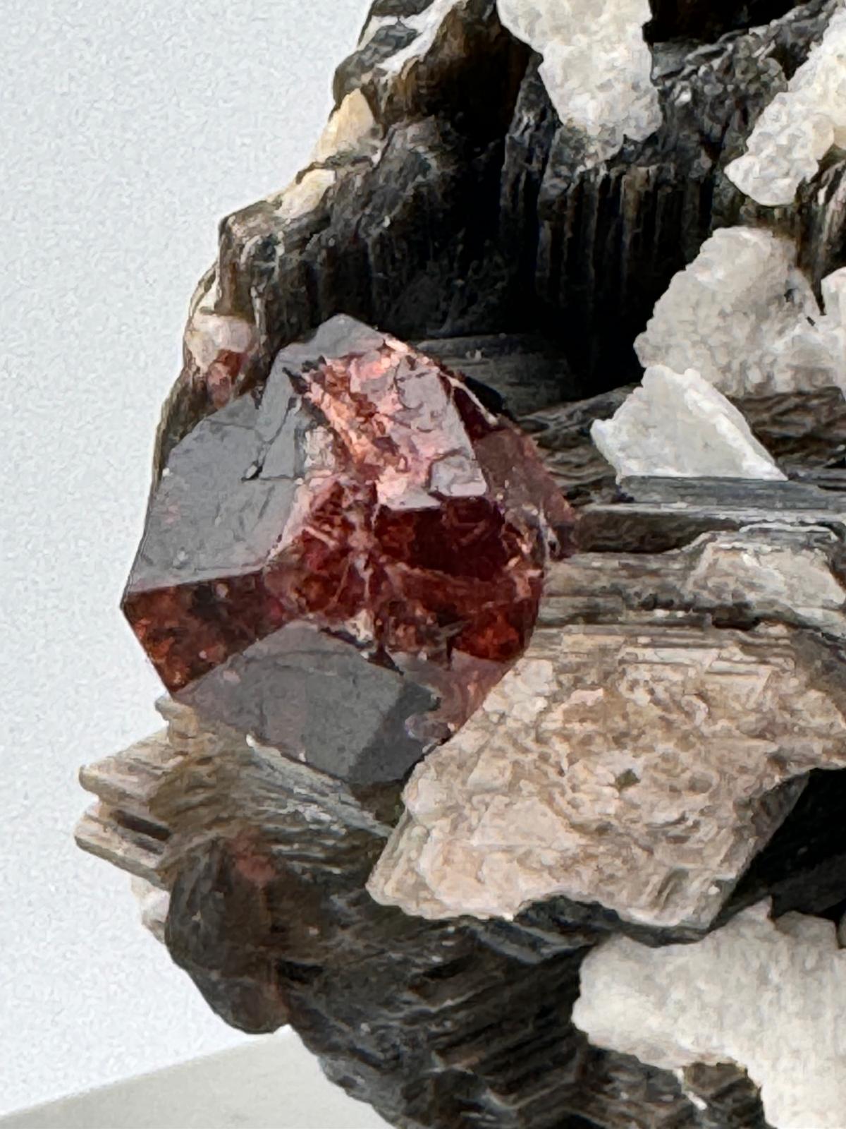 Description: This single, gemmy and clear Spessartine Garnet beautifully perched on mica is a stunning natural formation. The intense bright and vibrant colour of the Spessartine Garnet is a stark but beautifilly striking contrast to the darker hues of the mica, creating a mesmerizing display. This combination is not only visually appealing but also highly valued by collectors for its unique aesthetic and geological significance.