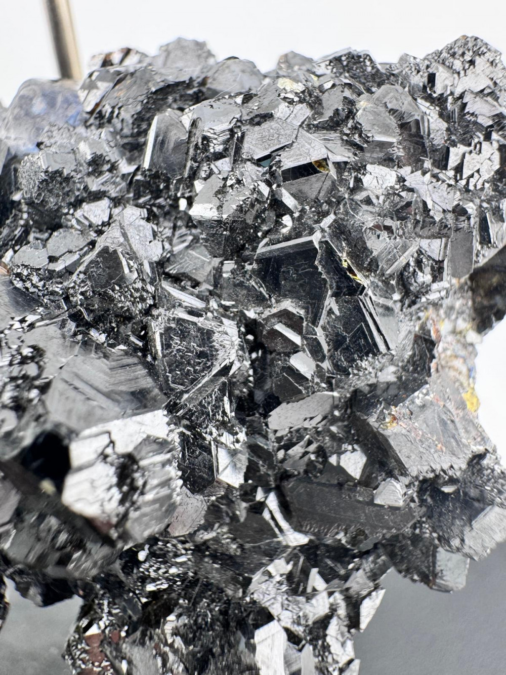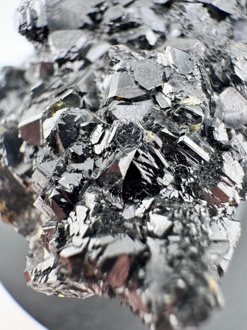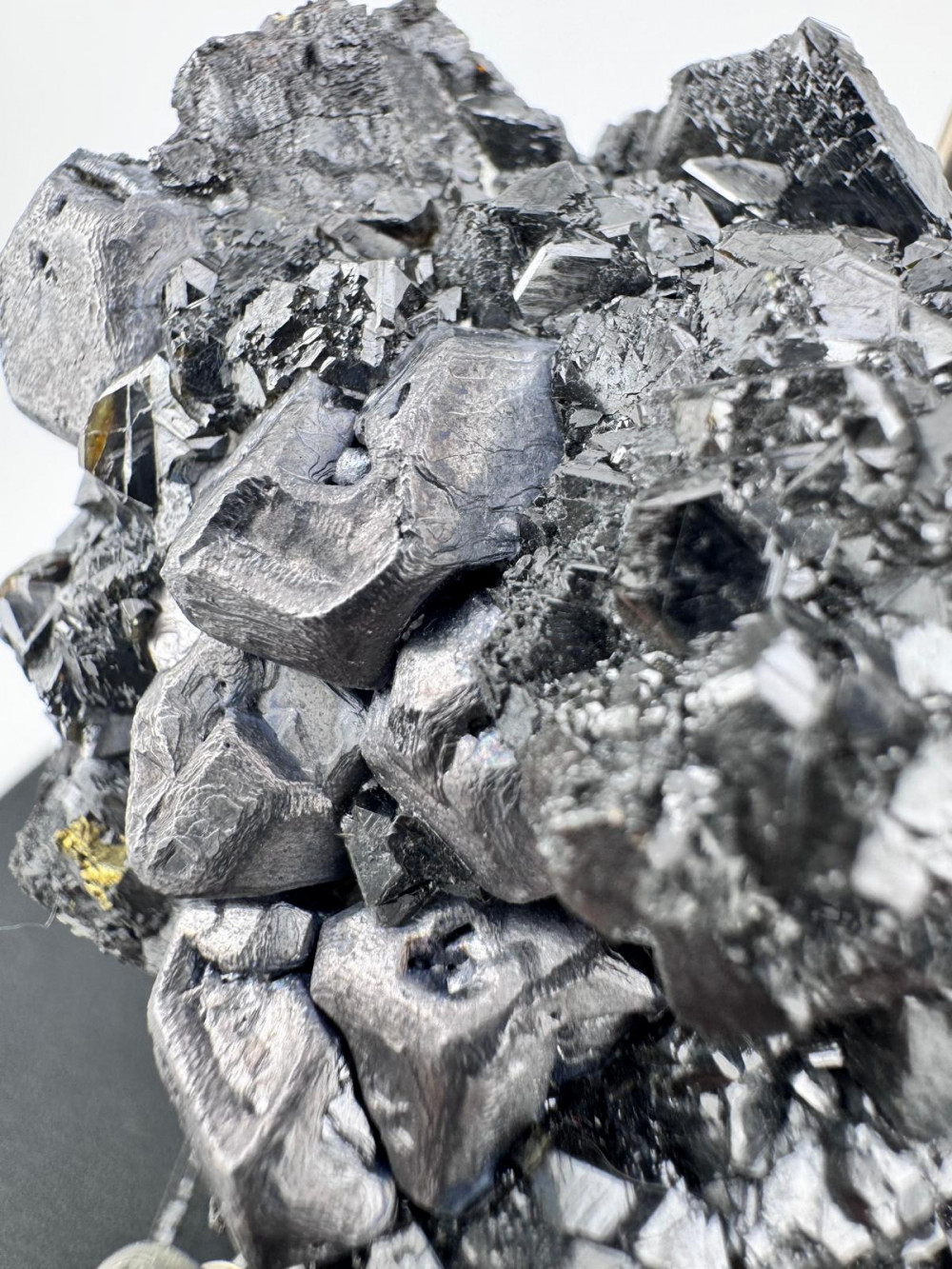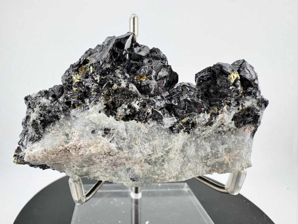 Description: The specimen, a striking combination of sharp and extremely lustrous dark, modified Sphalerite crystals interspersed with glossy Galena crystals, originates from the renowned Madan locality in Bulgaria. On one side of the specimen, some sprinkling of micro golden pyrite crystals are observed, adding more character to this already amazing find. The locality is celebrated for its rich polymetallic ore deposits.