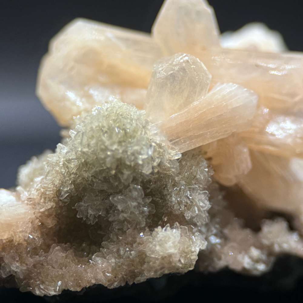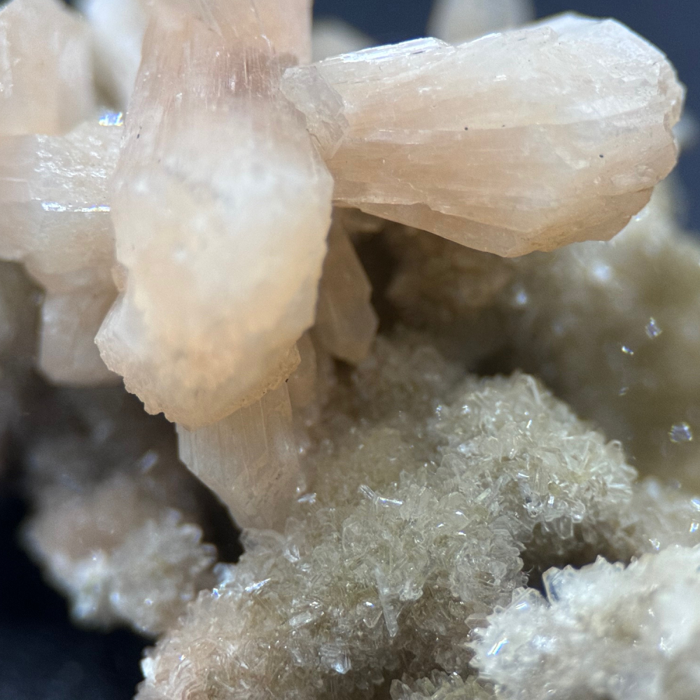 Description: Stilbite aesthetically balanced on top of clusters of lustrous heulandite crystals