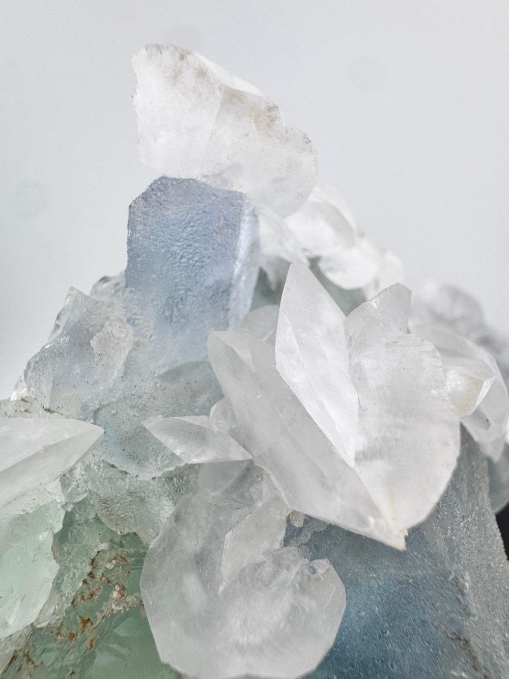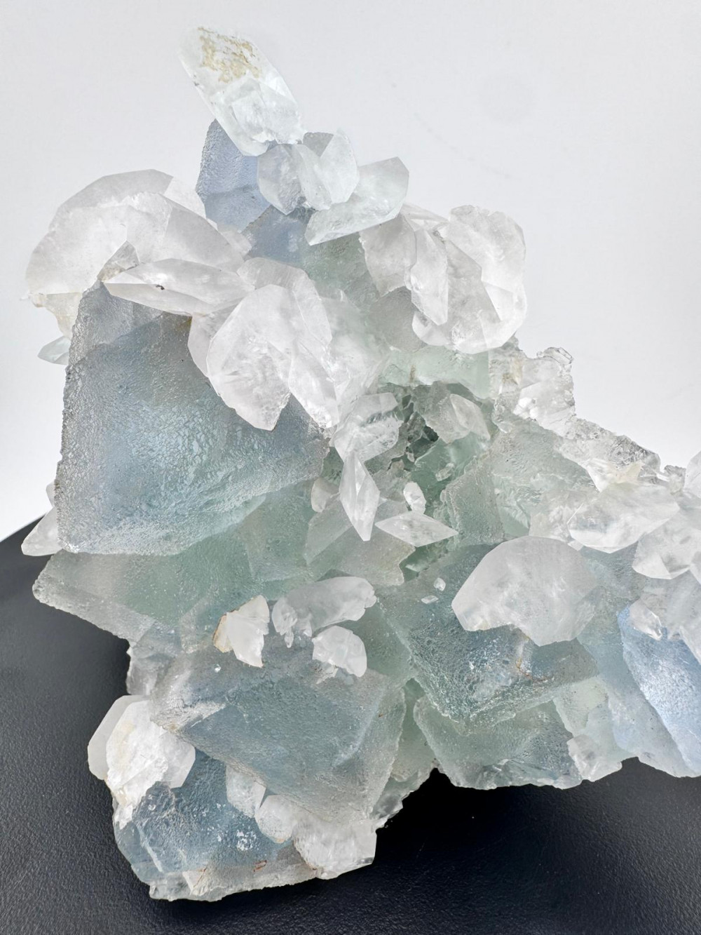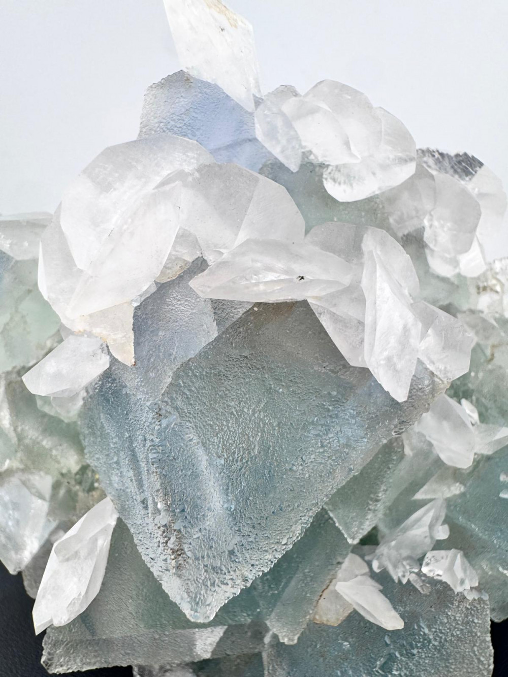 Elevate your crystal collection with this stunning group of vivid green fluorite crystals with blue undertones. The specimen showcases perfect octahedral formations with mesmerizing microcrystalline surfaces and an intense pearly luster that’s iconic to this mine’s finest specimens. Admire the flawless three-dimensional structure and translucent color that radiates natural beauty from every angle. What sets this piece apart is the sharp and transparent lenticular calcite crystals partially coating the fluorite, creating a captivating crystal duet.